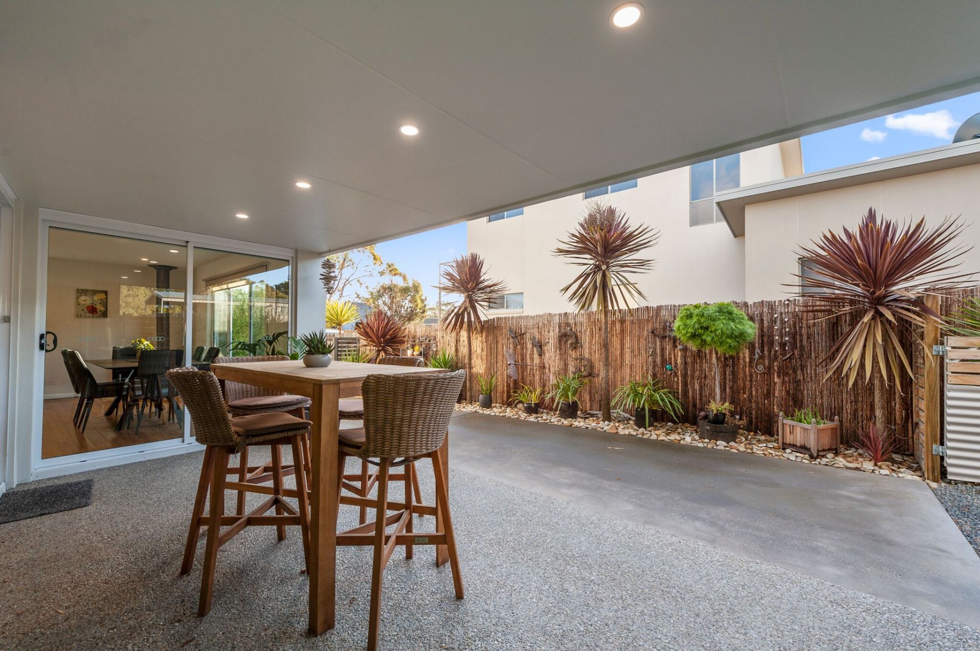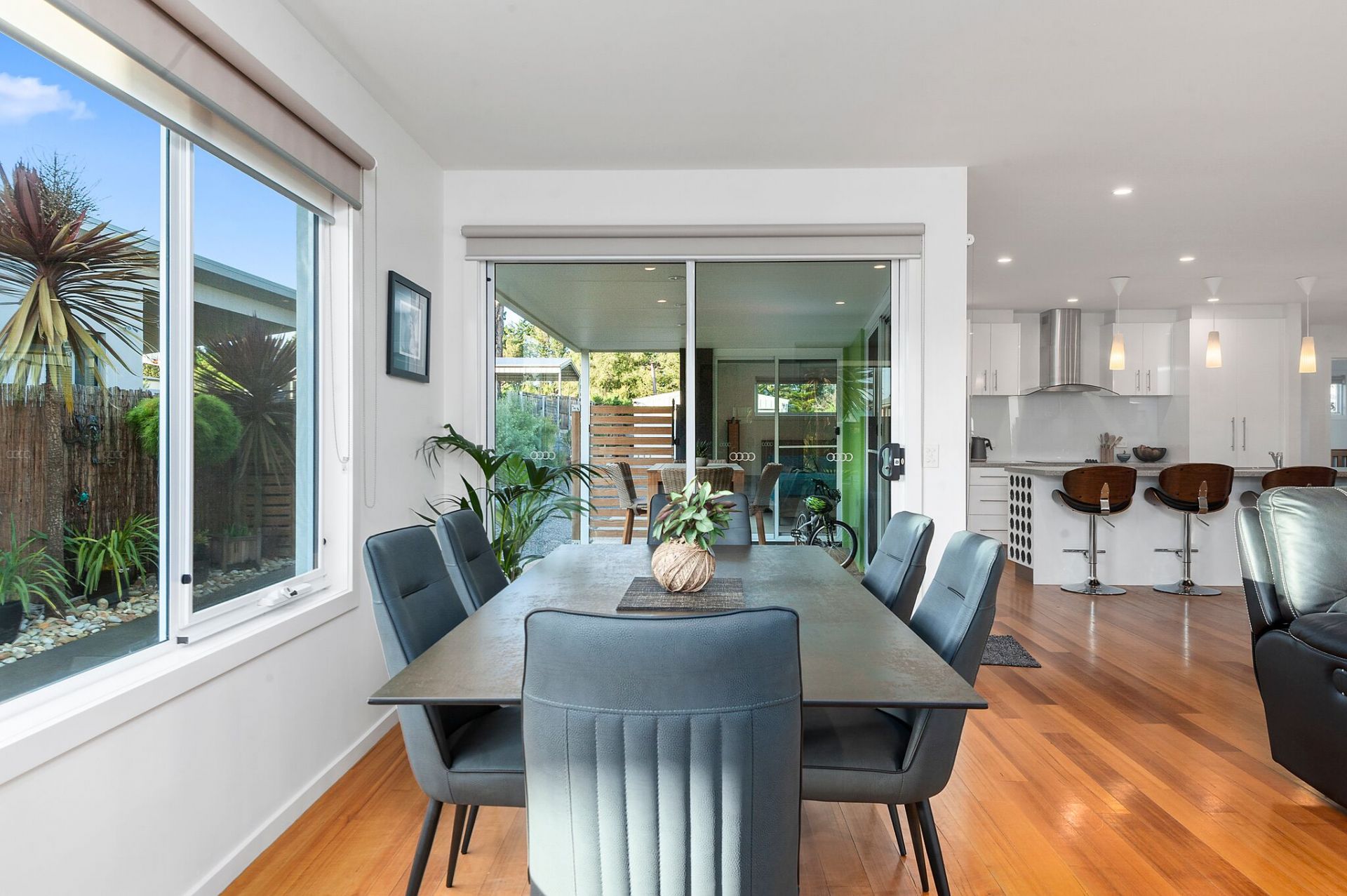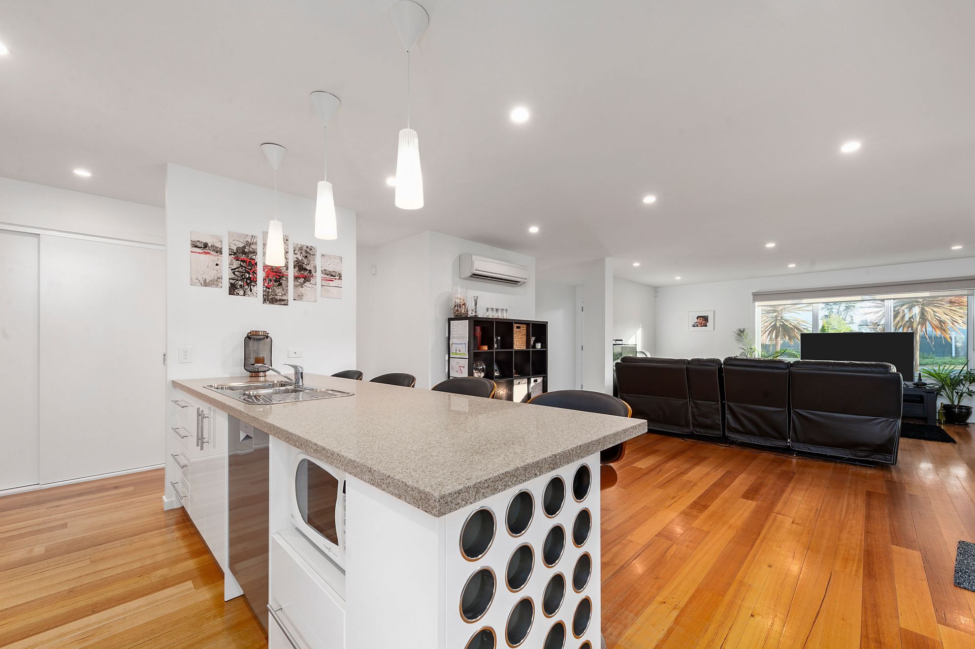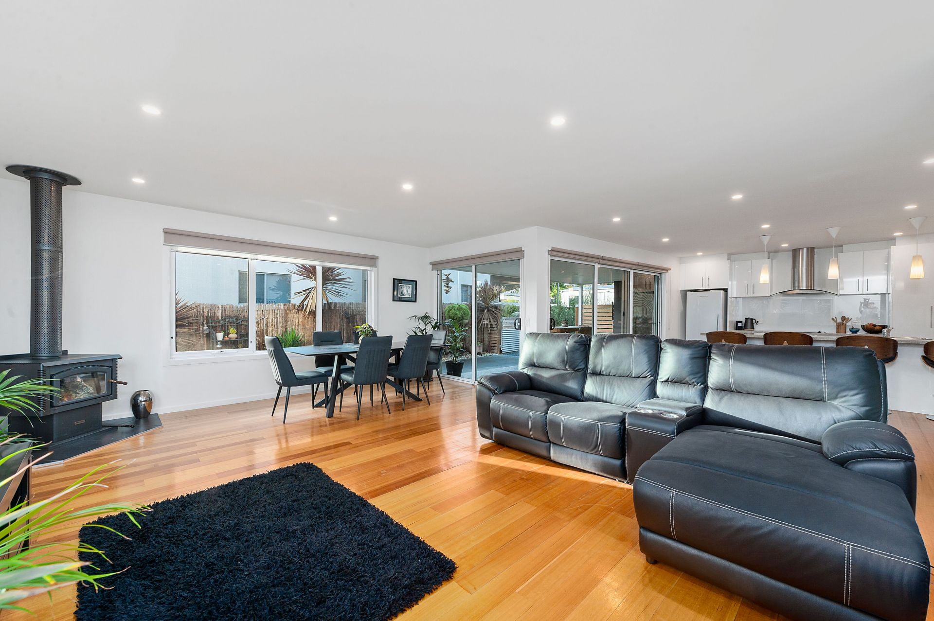 A spacious living area boasting large windows, polished floor boards and wood heater for those cool winter nights. Enjoy entertaining in your open plan dining and modern kitchen with island bench, built-in wine rack and large bi-fold glass doors opening out to a covered external deck area of exposed aggregate concrete.