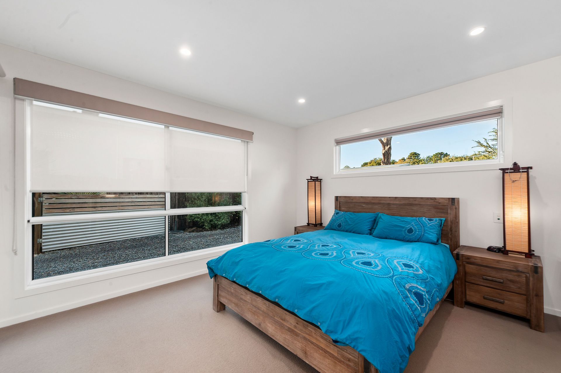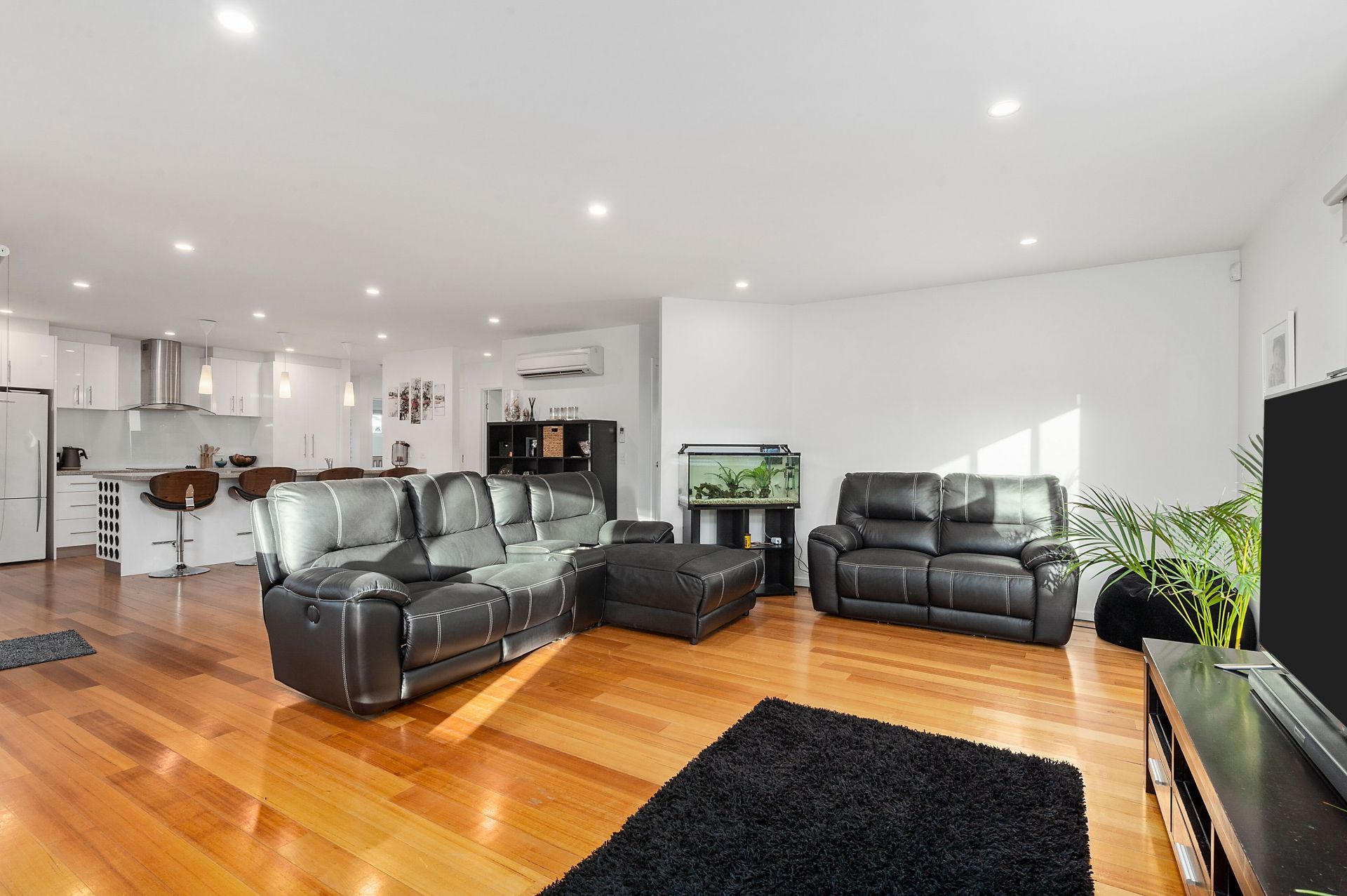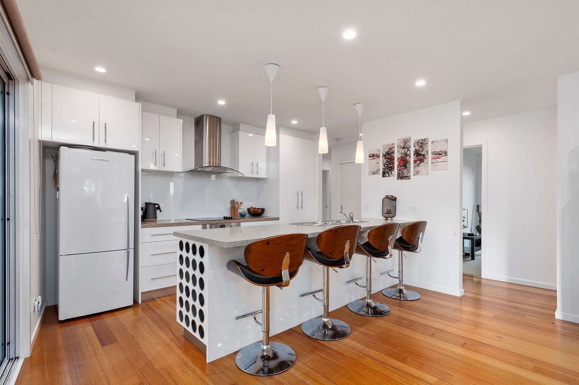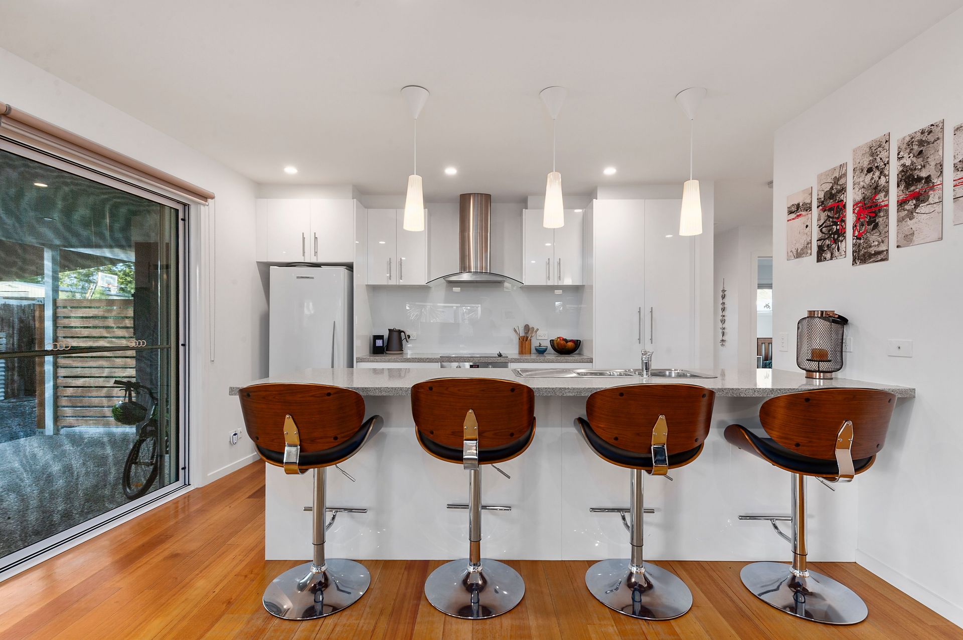 A spacious living area boasting large windows, polished floor boards and wood heater for those cool winter nights. Enjoy entertaining in your open plan dining and modern kitchen with island bench, built-in wine rack and large bi-fold glass doors opening out to a covered external deck area of exposed aggregate concrete.