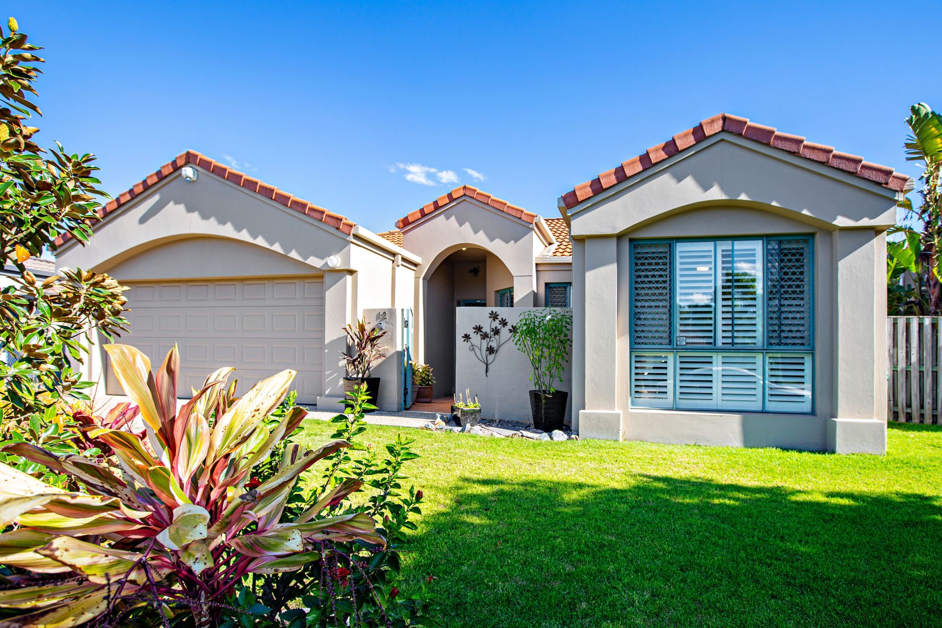 Low maintenance gardens and flat back yard with gate access to a park.