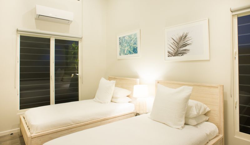 To create maximum privacy bedroom 2 is located at the opposite end of the villa where 2 King single beds in coastal whitewash wood create flexible sleeping arrangements for 2 children or another couple. This wing also has its own bathroom.