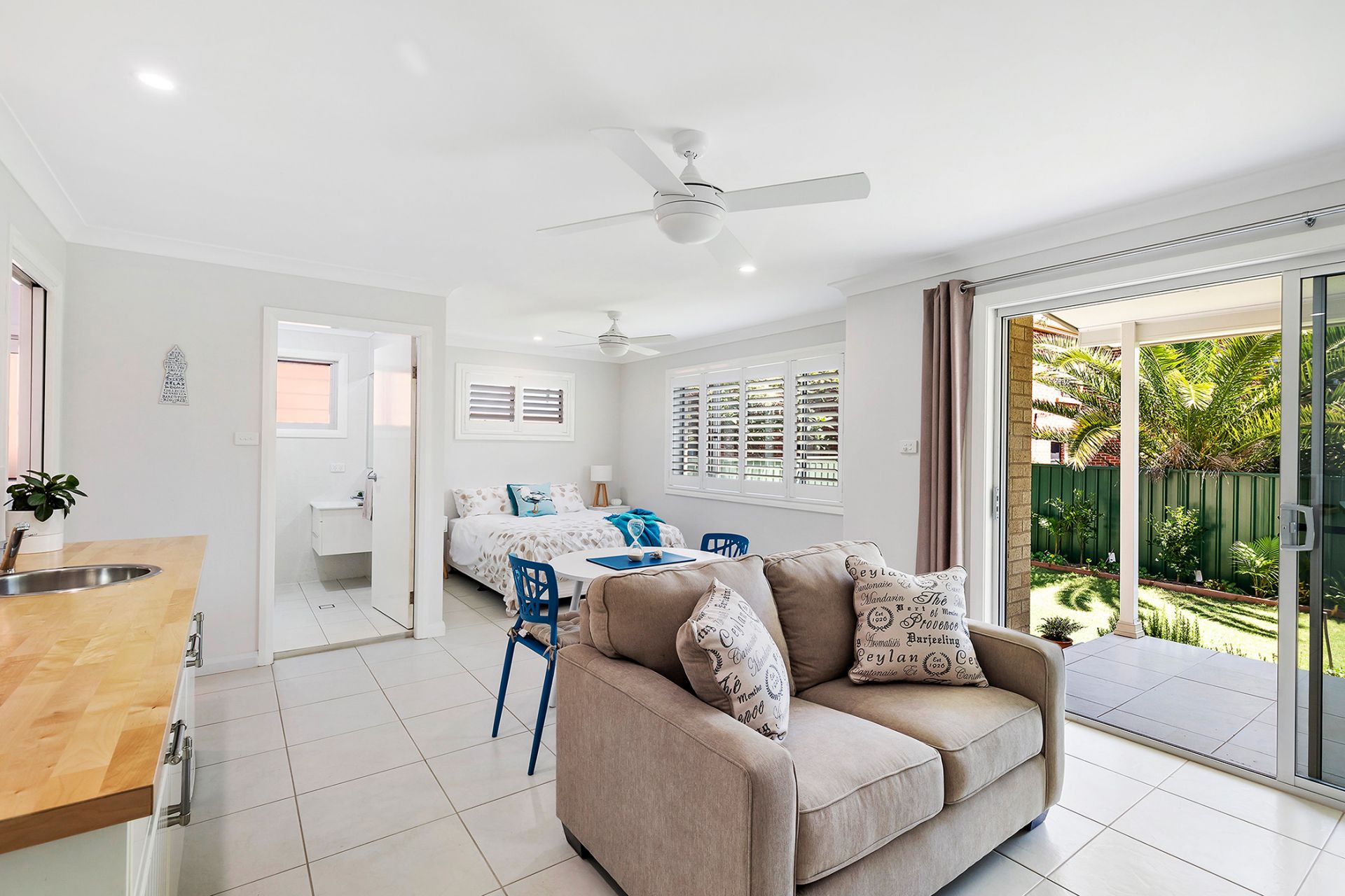 Enter the front door to a wide tiled hall that leads to the stairs and lift. The one bedroom granny flat, with a full size kitchen, was designed east/west to catch the sea breeze and light with glass sliding doors to the front and rear verandahs and gardens. The bedroom has a large wardrobe and the bathroom is styled with marble tiles and large shower area. To the rear of the property is a multifunctional room currently used as a studio apartment for visiting friends and family with kitchenette and bathroom, but would be an amazing, large home office with direct client access from the front door or this area could be used as a family rumpus room for the kids/teenagers to have their own space away from the adults, with access to the low maintenance fully enclosed backyard. The laundry is well designed with plenty of storage and exterior access. The large double garage has a storage area and auto doors.