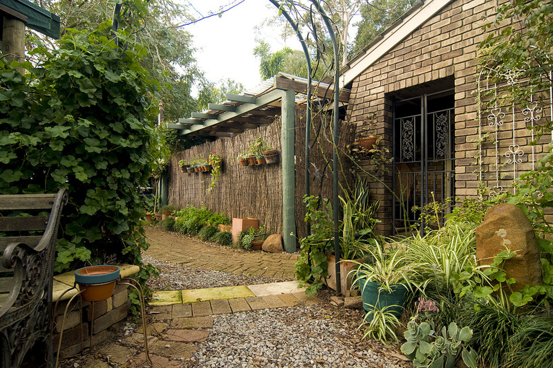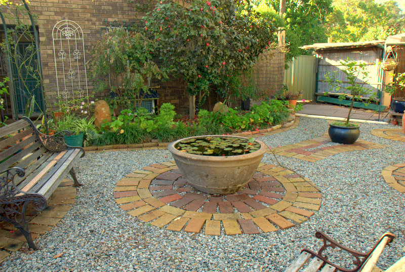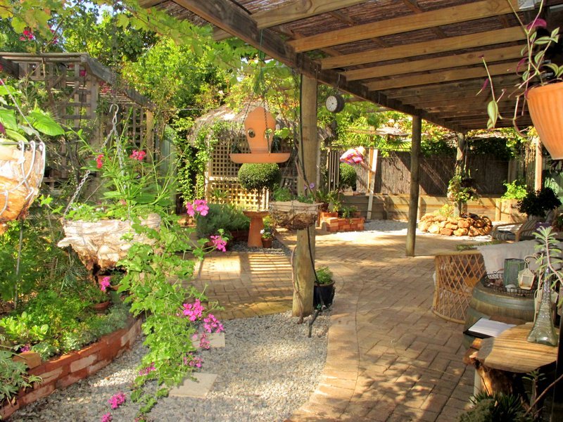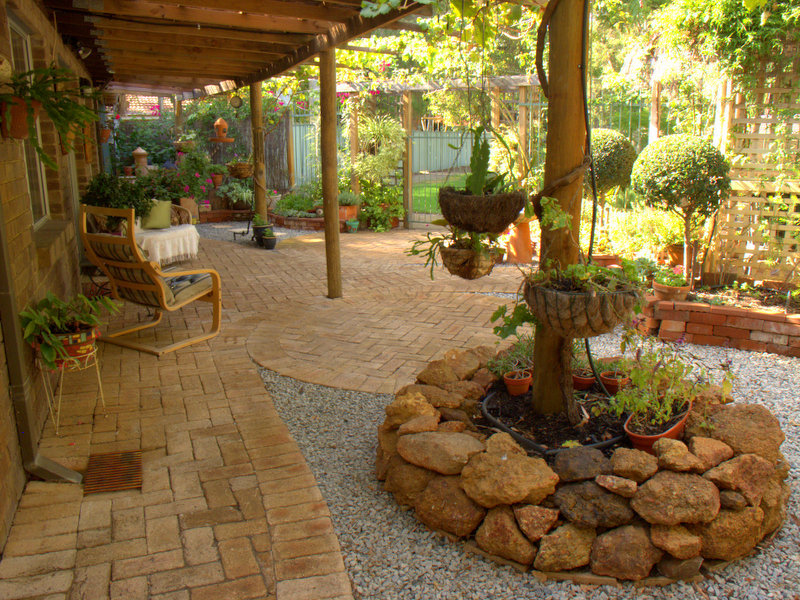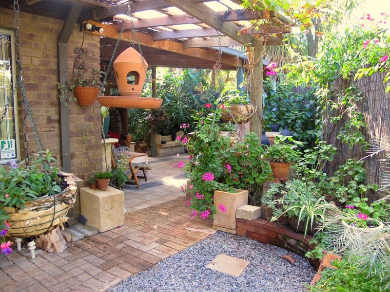 Ducted air evaporative con and reverse cycle split system, slow combustion Kent wood-fire, mediterranean Fremantle stone paved alfresco area, several shady garden rooms connected by paved and gravel paths, NO grass to mow!