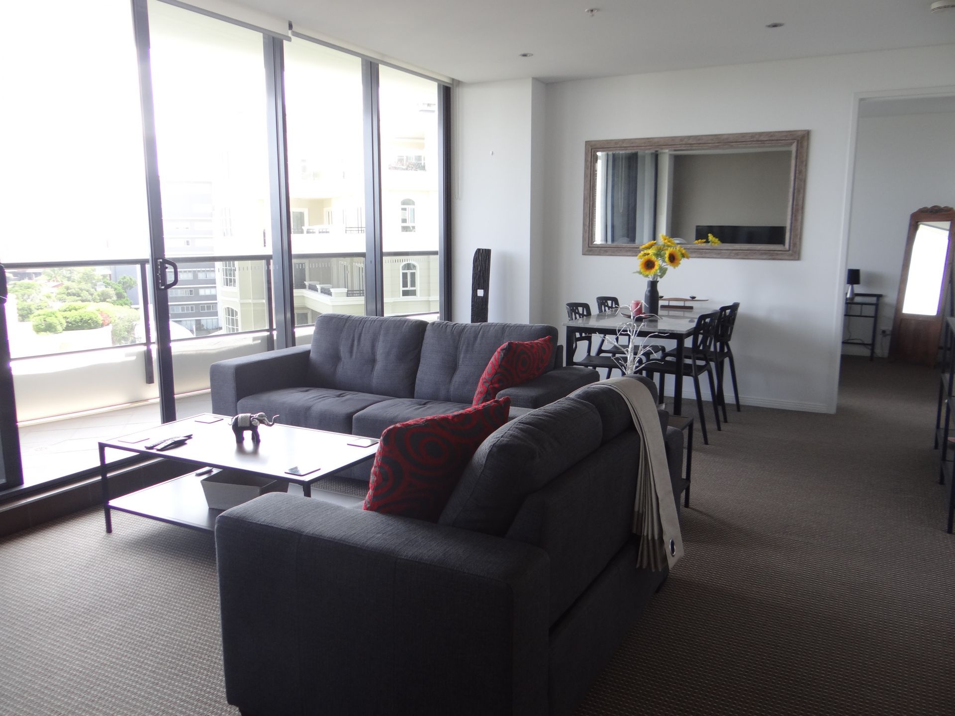 Full length sliding doors to the balcony reveal the amazing views over the river and skyline to the Hinterland Mountainranges.
