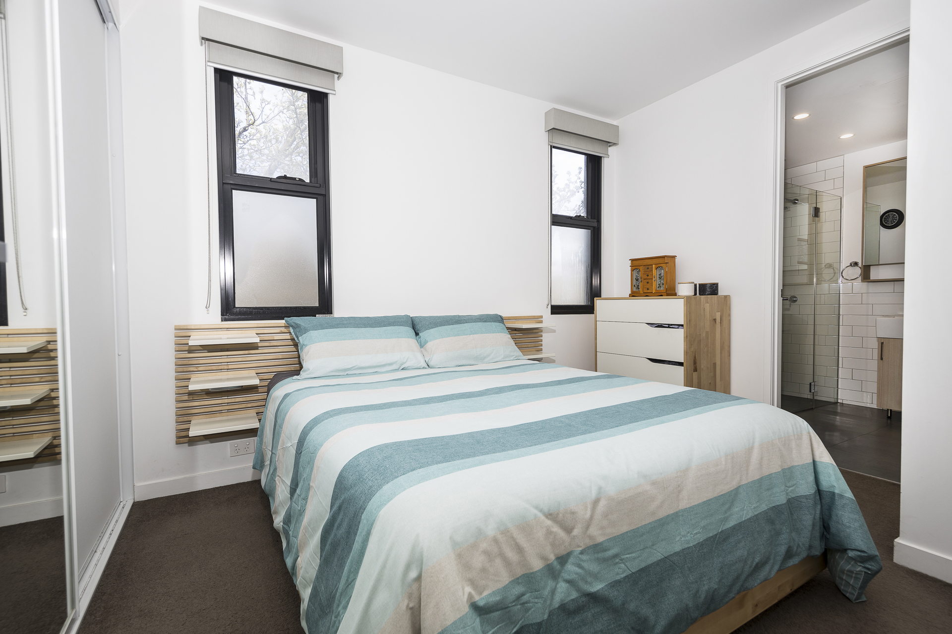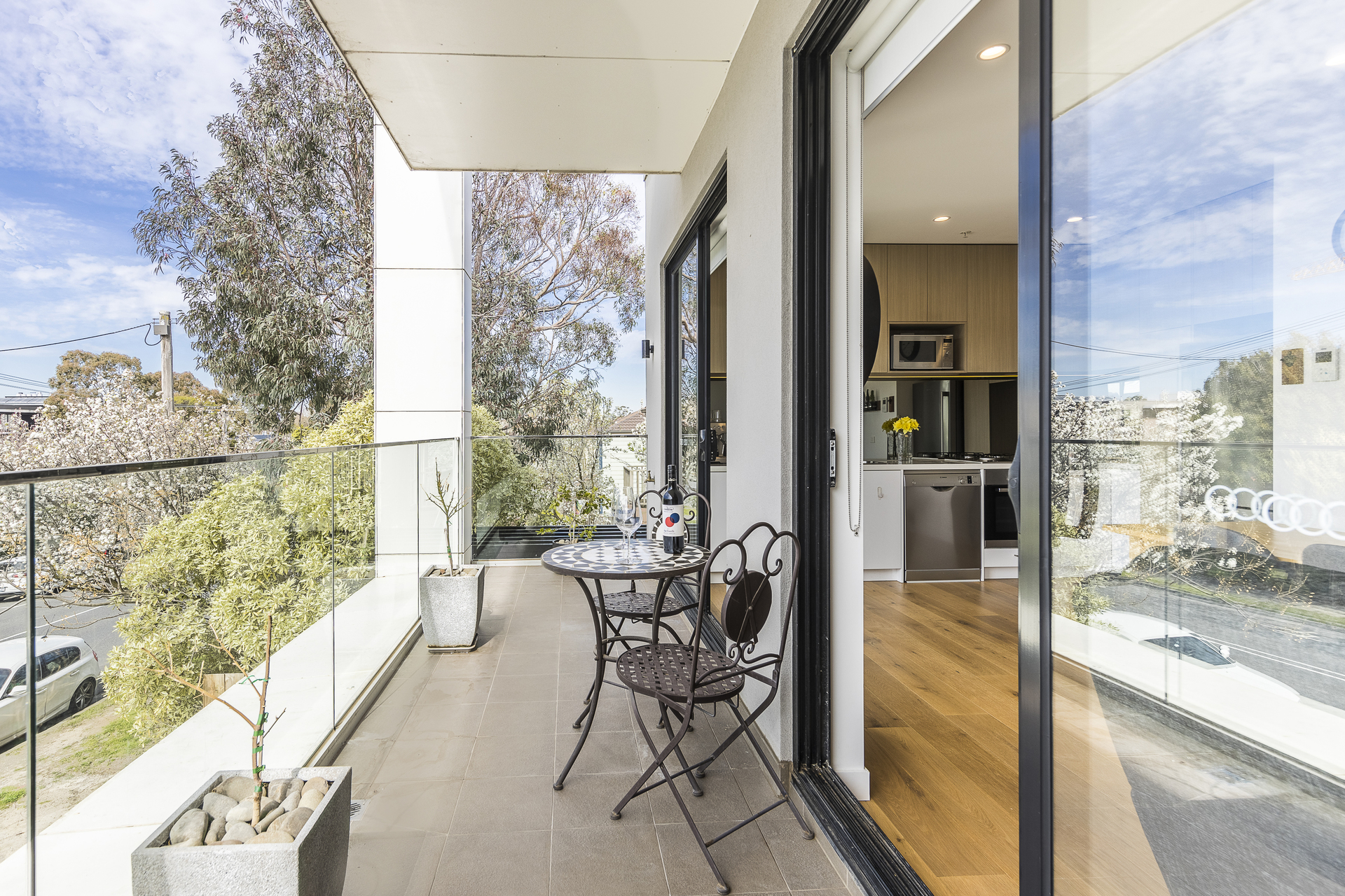 The apartment opens up into a comfortable sized entry area, which flows into the spacious living and dining space, with 9ft ceilings and two sets of full height sliding doors/windows to the balcony. The balcony and windows have an easterly aspect opening out on to the tree-lined Station Street, offering views with beautiful seasonal variety while capturing the morning sun from the balcony. The open view to the street frontage gives the place an open and spacious feeling, without neighbouring buildings blocking out daylight and compromising views.