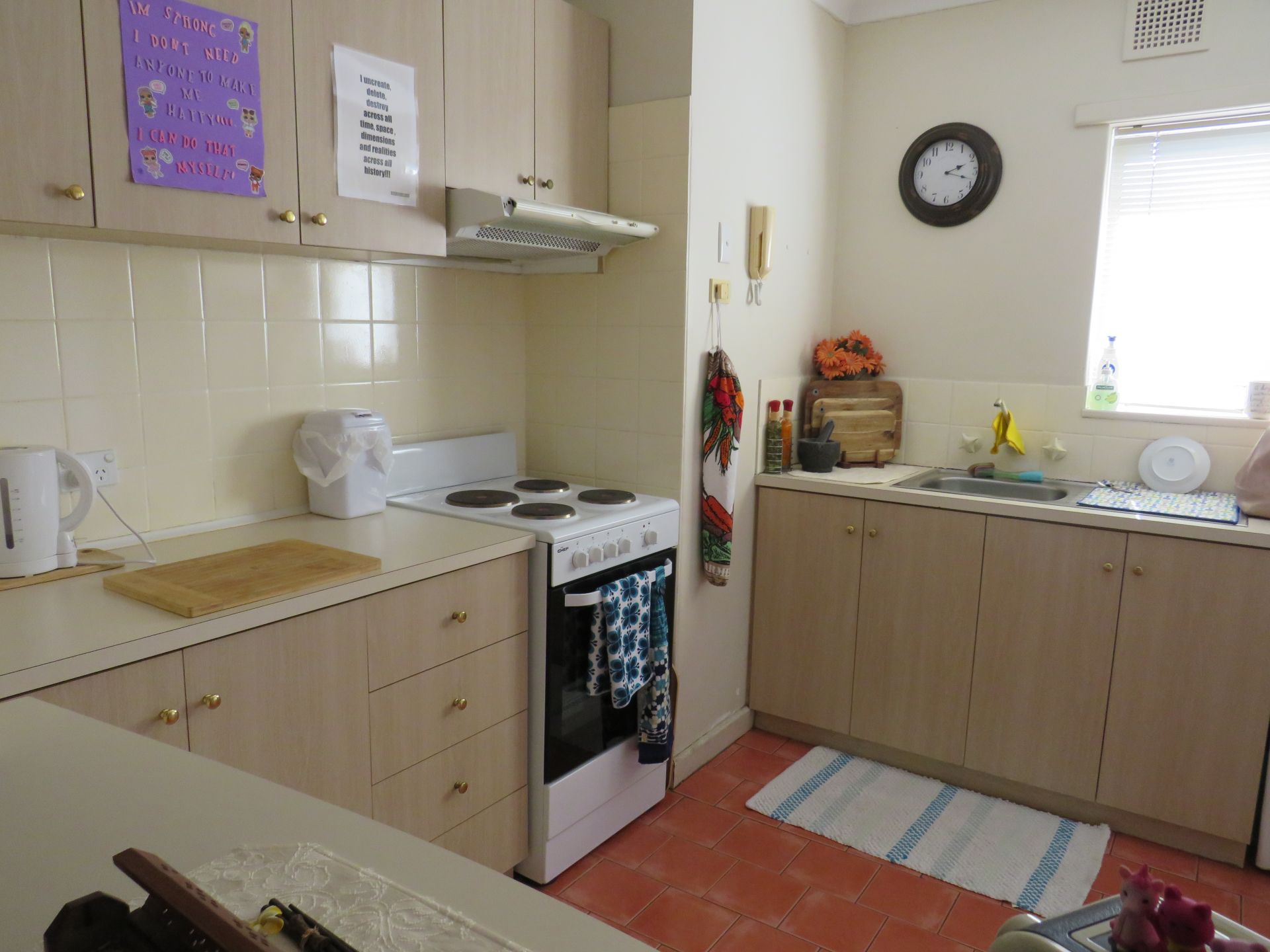 Breakfast bar through from kitchen to lounge area with plenty of cupboards in the kitchen with recess ready for a dishwasher. New electric stove.