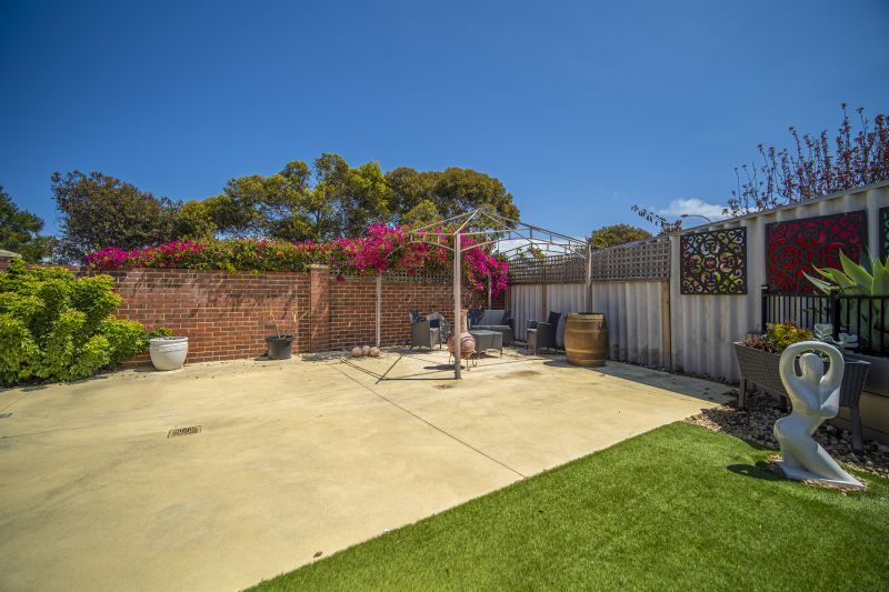 Artificial Lawn area for kids play equipment / dog and fully enclosed landscaped easy-care gardens including a lemon tree and paved liquid limestone, rear colorbond gate.