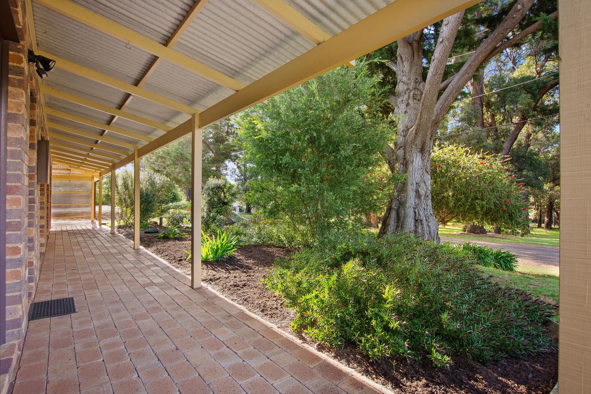 The very well maintained and attractively presented brick and steel roofed house is in an elevated, private position with verandahs on three sides and extensive brick paving. The home offers three bedrooms (two with built-in robes) and one bathroom with a separate toilet. There are open plan dining and family room areas adjoining the country style kitchen, and a separate living room that features a raked pine ceiling and pine cladding to the lower walls. There is a generous covered outdoor space accessible through sliding glass doors from the dining and family room areas.