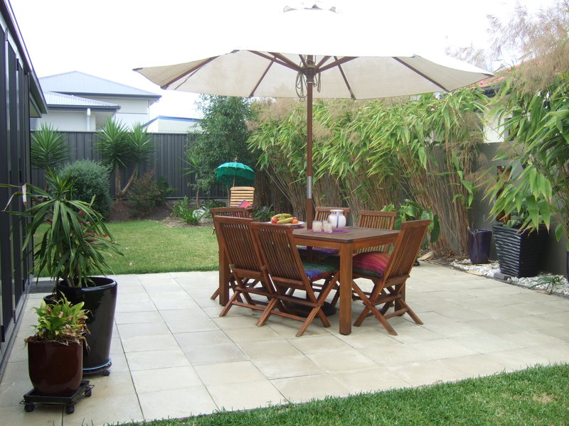 Low maintenance garden with private paved patio adjacent to the Alfresco.