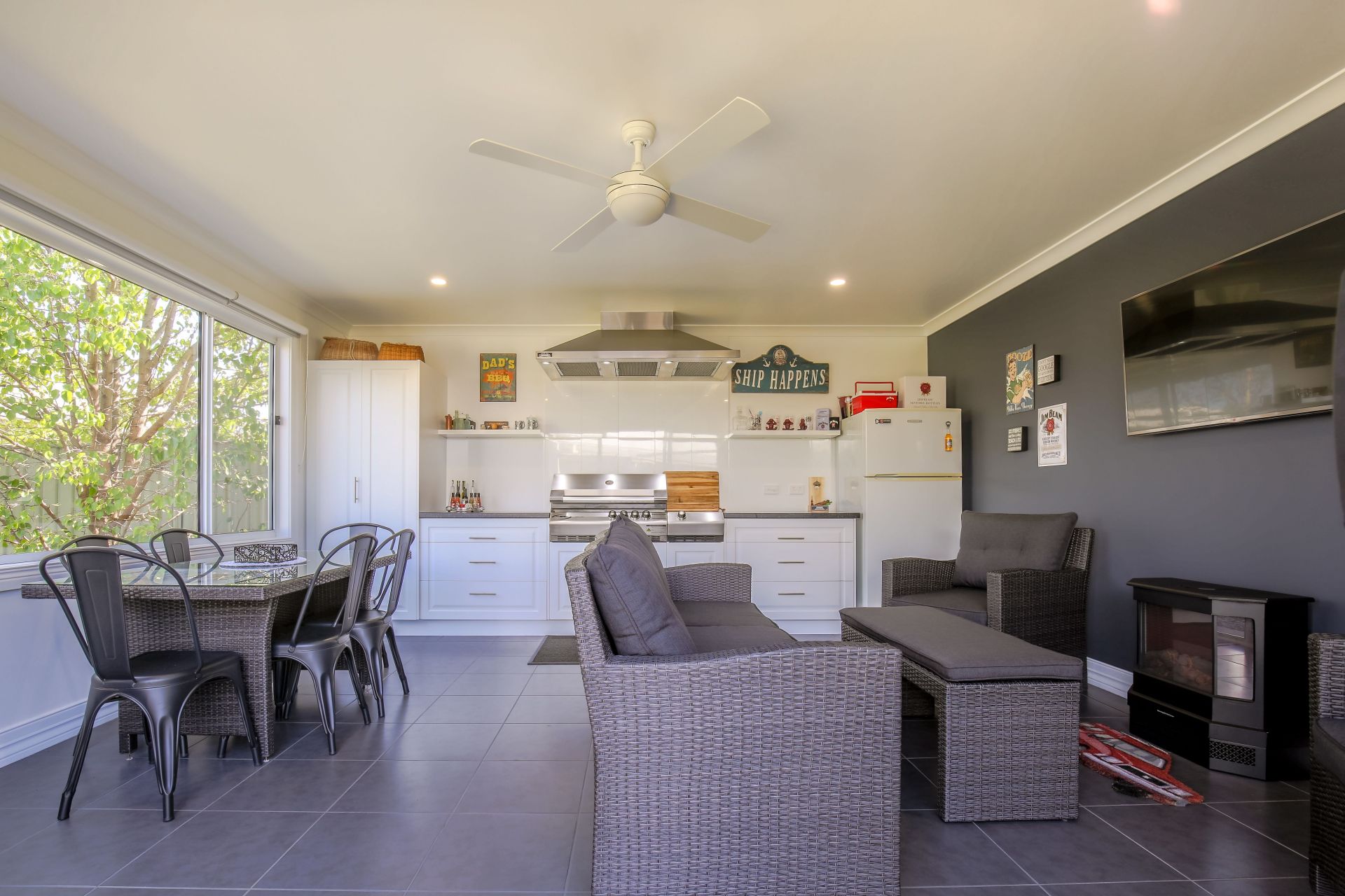Fully enclosed alfresco room which is nestled into the garden complete with kitchenette, built in gas BBQ and stainless steel exhaust hood which makes it perfect for entertaining as the large sliding door and windows bring the outside in.