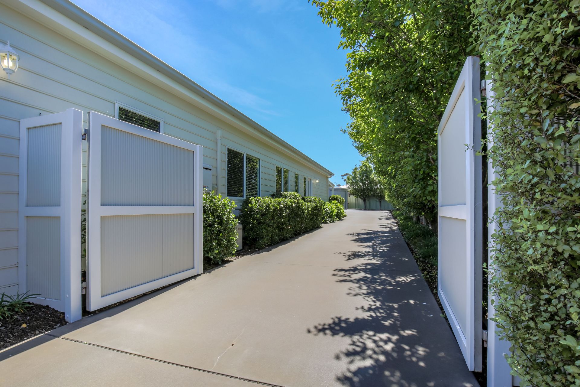 A long concrete driveway with remote opening gates.