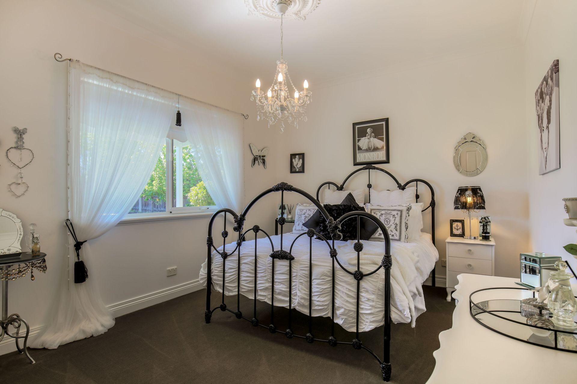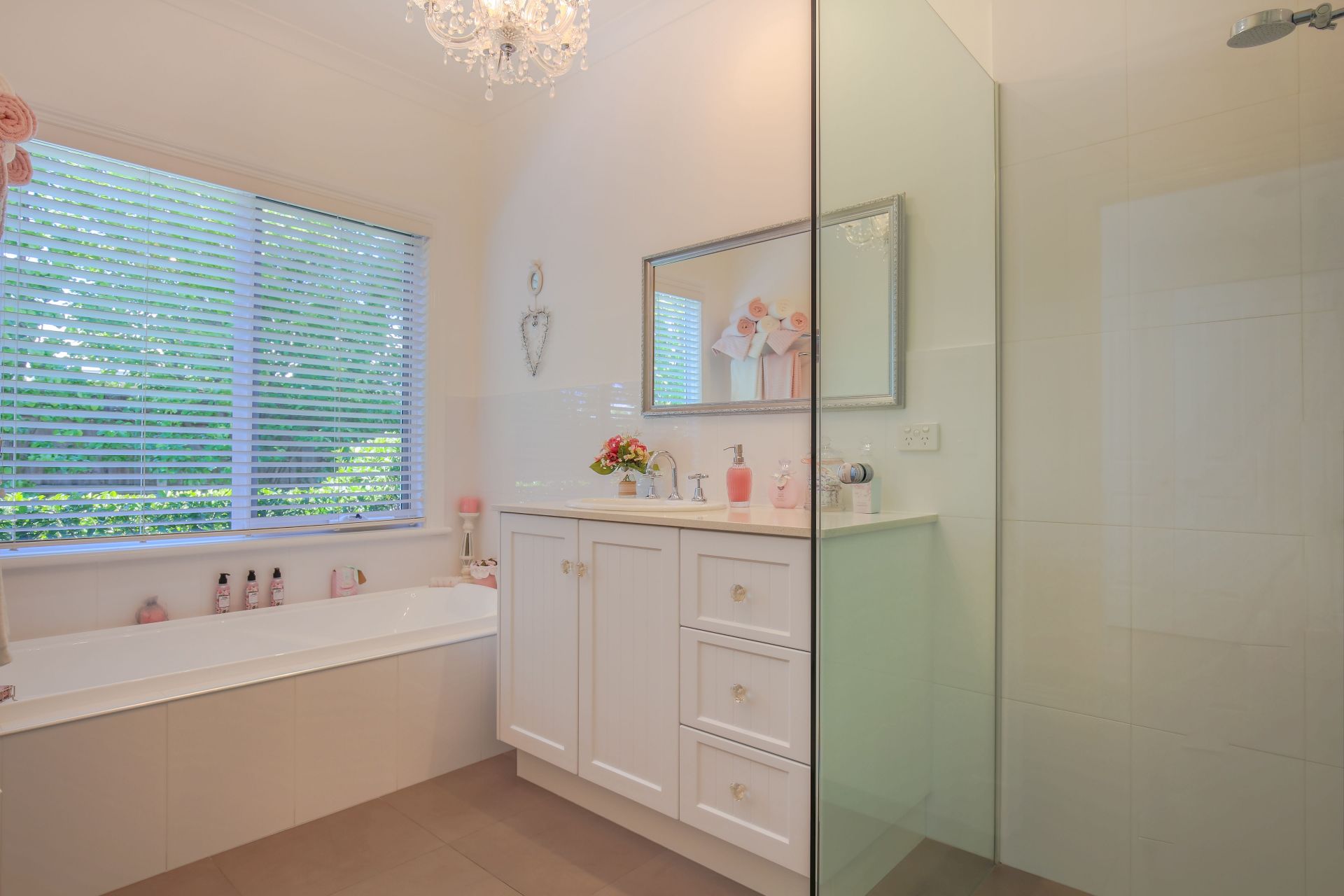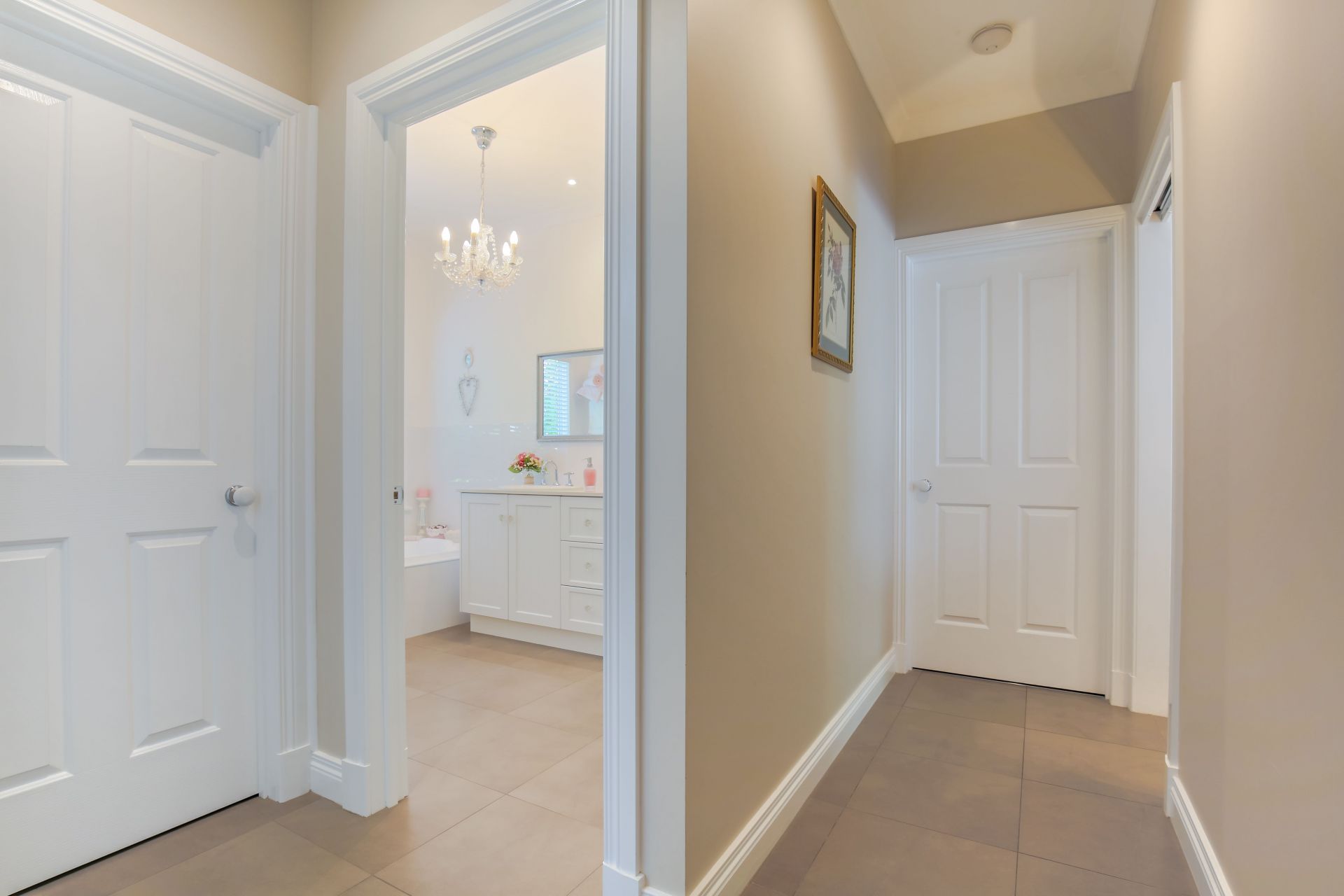 Ceiling roses with chandeliers and LED down-lights throughout