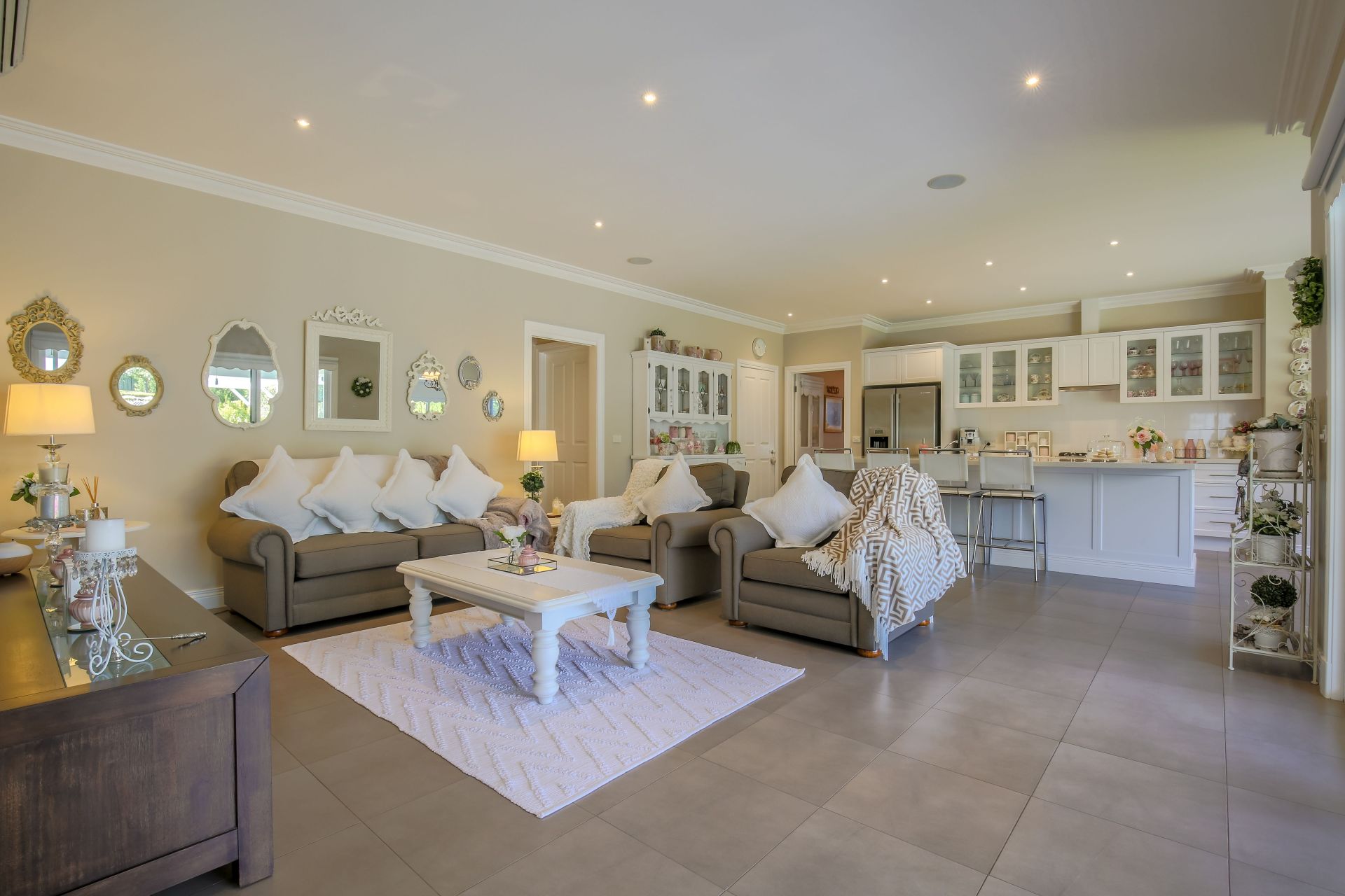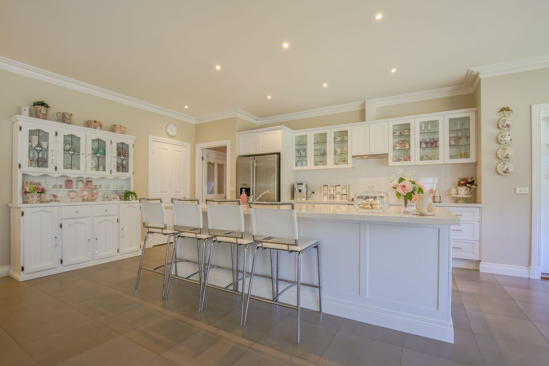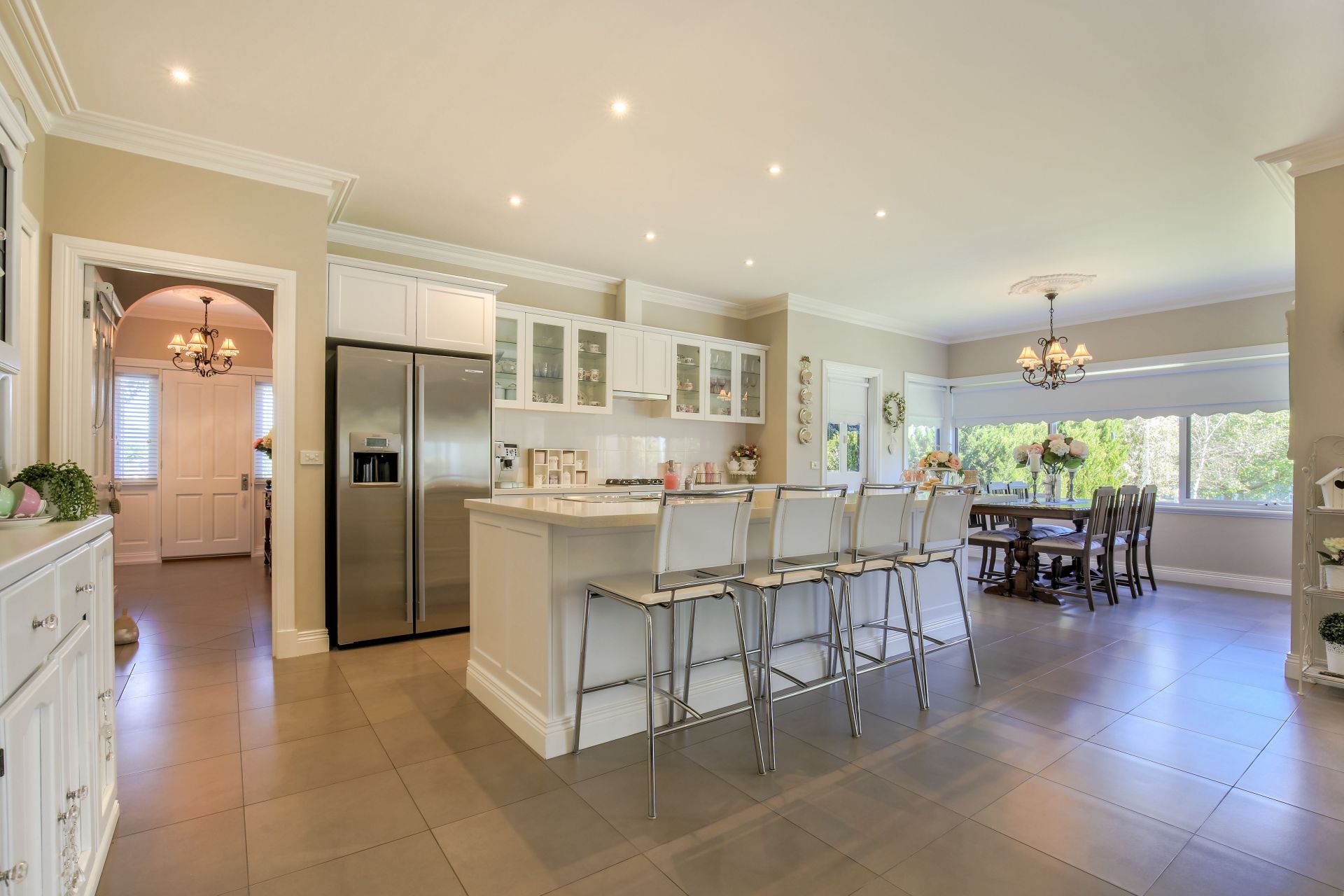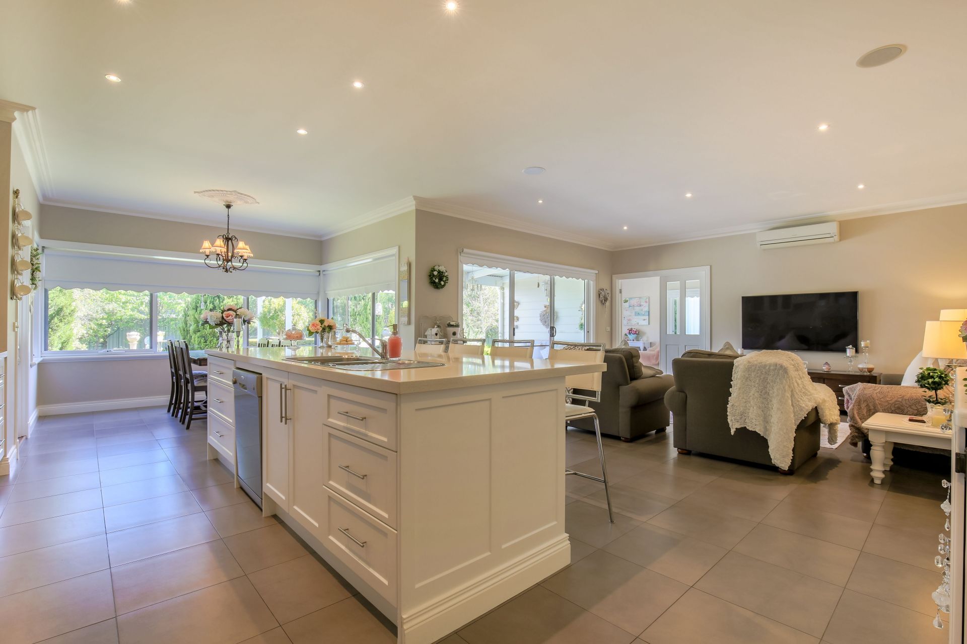 A spacious open plan Kitchen, Meals & Family room with plenty of natural light and quality cabinetry including vinyl wrap doors, Caesarstone bench tops and a huge island bench.