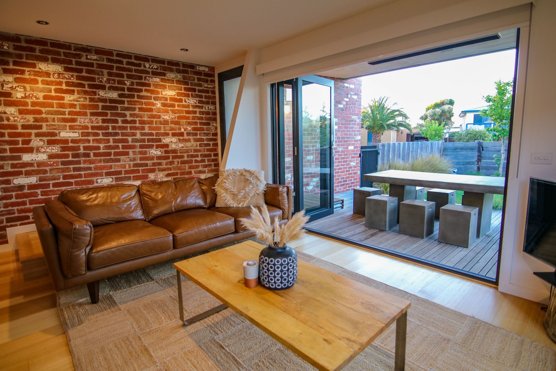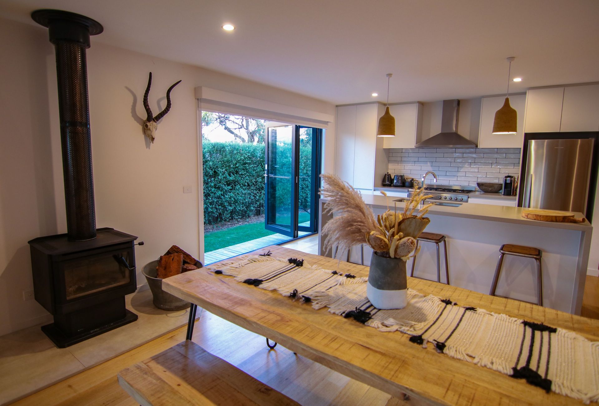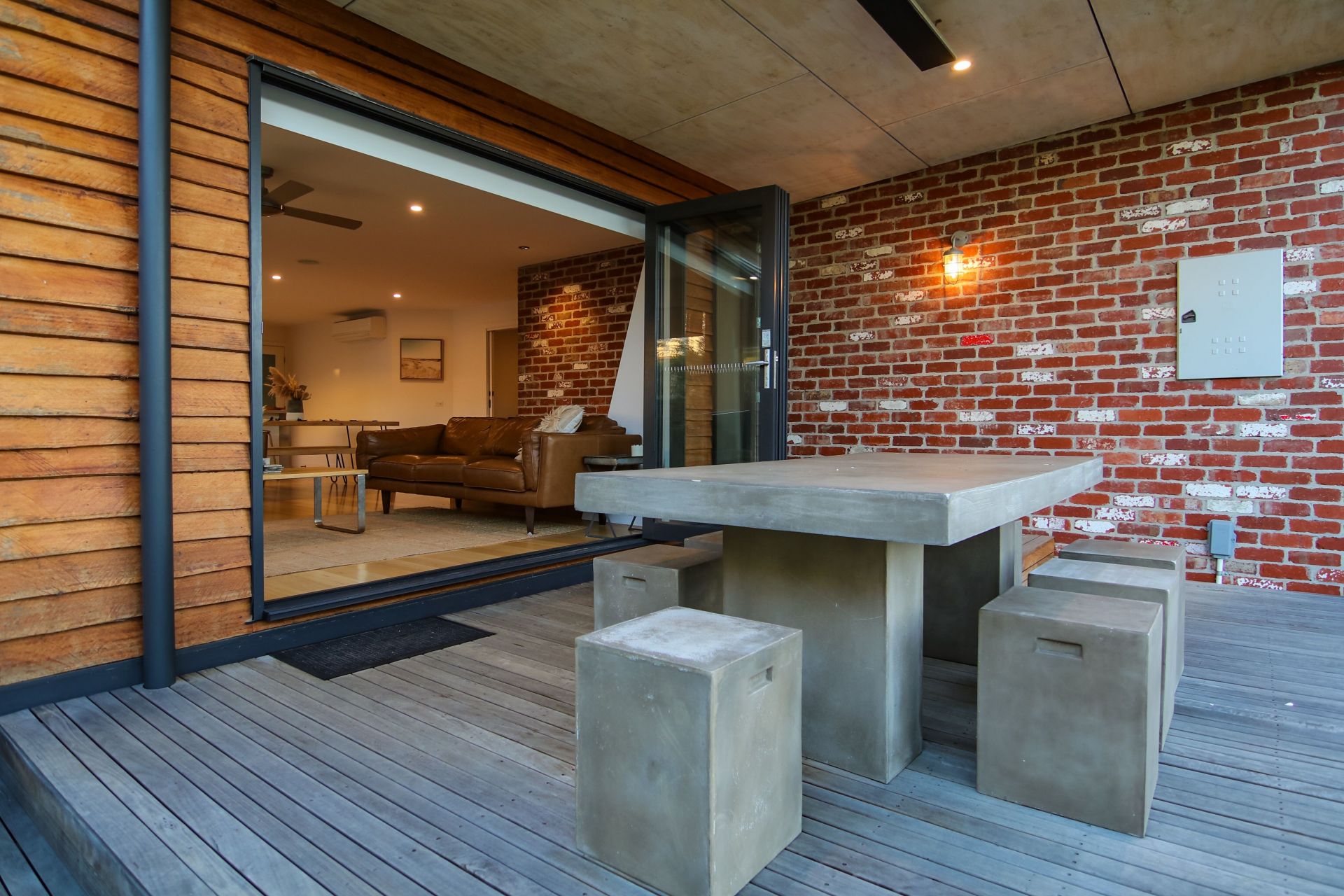 Externally, the unpretentious design begins with recycled brick veneer cladding flowing from the front garage to the inside of the home, acting as a feature upon entry and into the study area. The alfresco area along with the main living area has been positioned to the front of the dwelling to take advantage of the northerly aspect. A seamless transition exists from outside in to the front and side of the dwelling via bi-folding doors blurring the lines between internal and external living in the warmer months. An exposed galvanised steel beam wraps around the Alfresco roof, which is supported by a large, singular Ironbark feature post. Lightweight cladding finishes the remainder of the house, with rustic natural edge Silvertop Ash weatherboards the standout here. Along with the already established low maintenance garden, the Silvertop Ash Radial decking has been left to weather naturally with an outdoor shower nestled close to the laundry. The predominate front yard has been enclosed by feature timber fencing which promotes privacy whilst maintaining vehicular access. Enough space has specifically left to the side of the dwelling for vehicle storage (boat, caravan, etc.) if required. The rear yard has a private deck that leads directly off the master bedroom, with a generous sized 4m x 3.6m garden shed and additional wood storage to the rear.