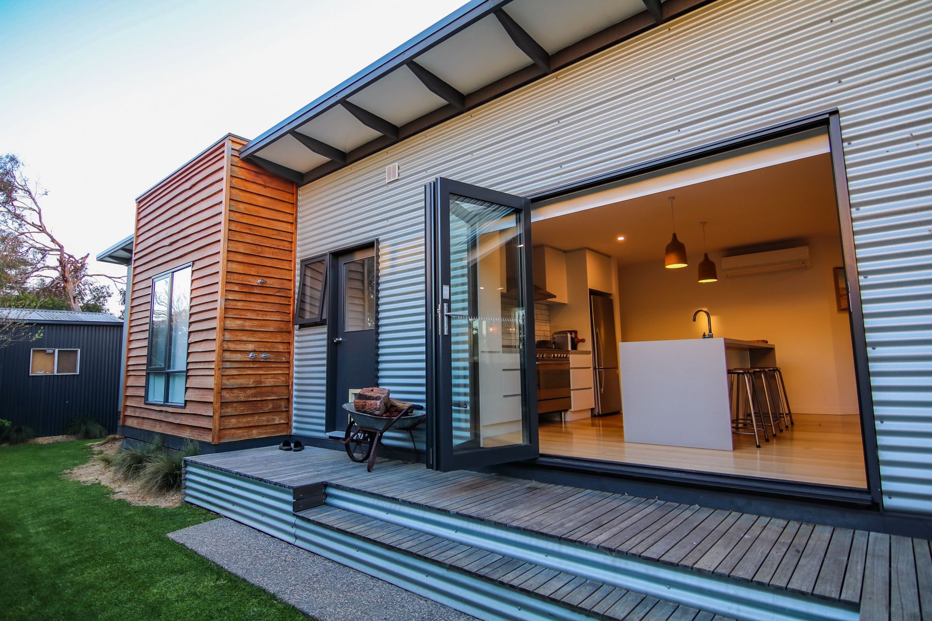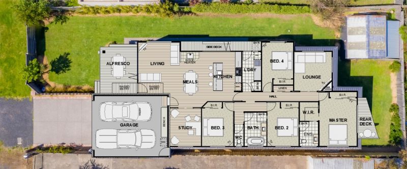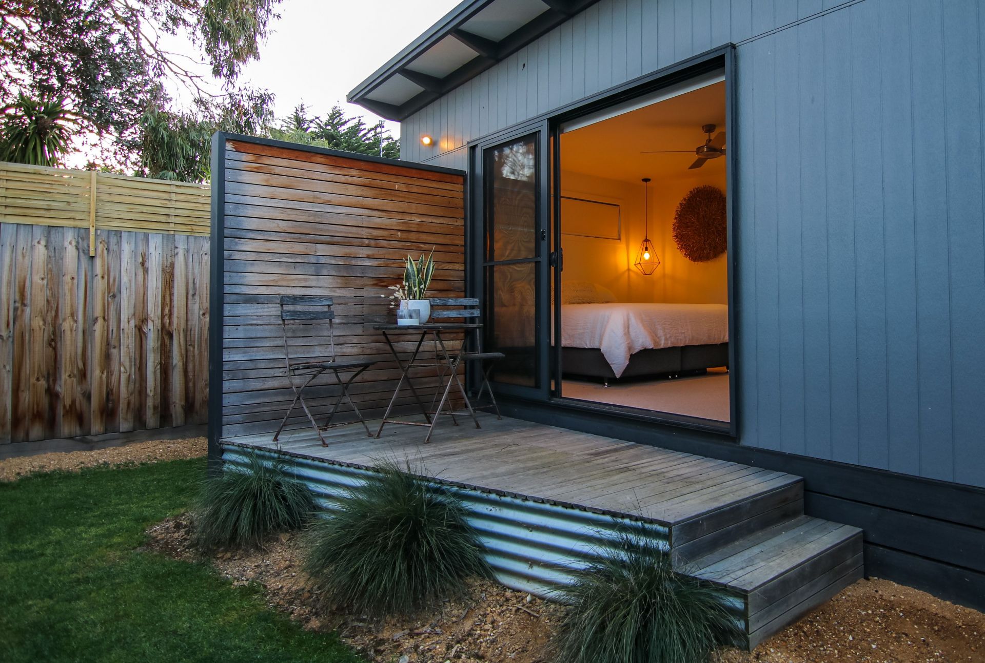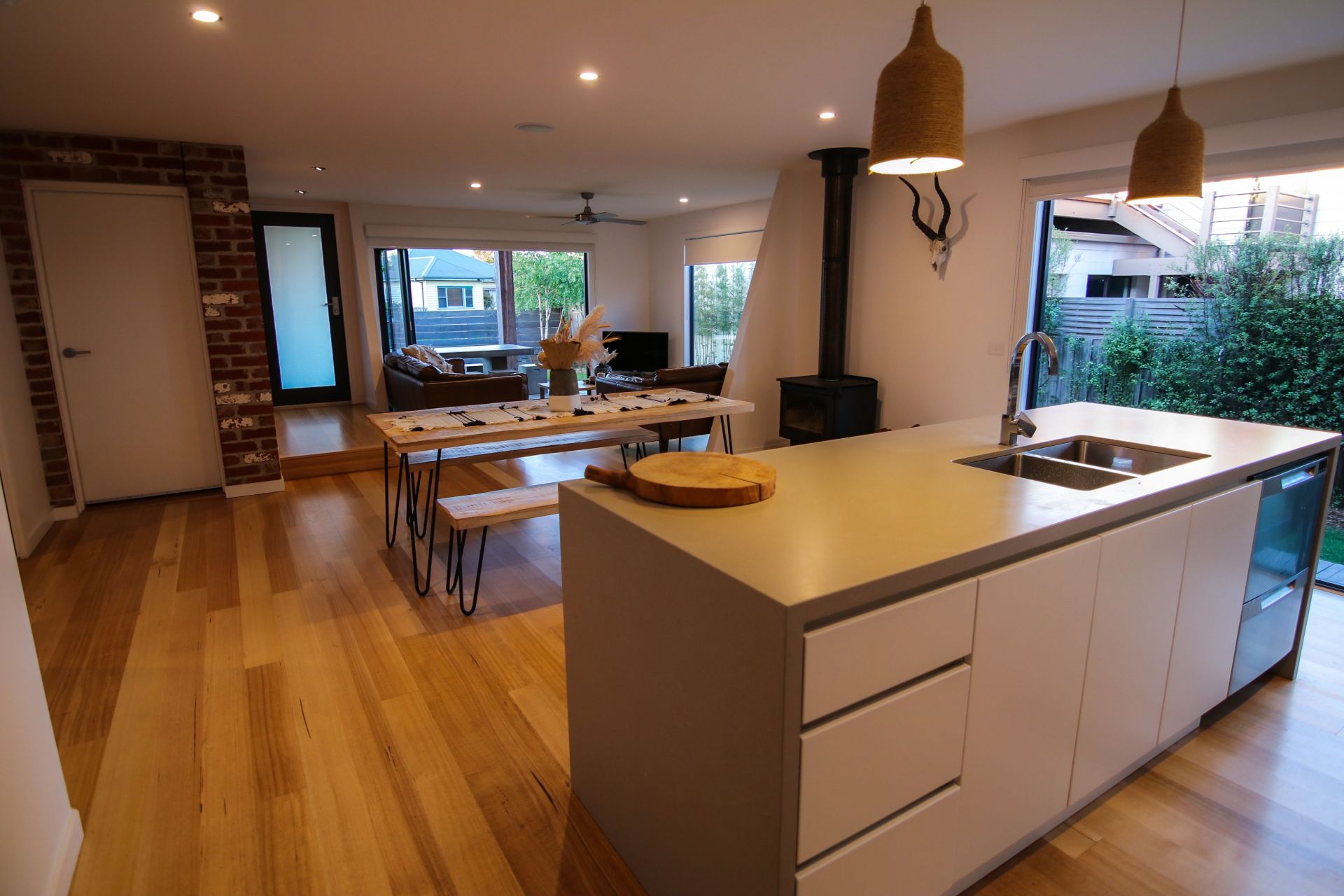 Externally, the unpretentious design begins with recycled brick veneer cladding flowing from the front garage to the inside of the home, acting as a feature upon entry and into the study area. The alfresco area along with the main living area has been positioned to the front of the dwelling to take advantage of the northerly aspect. A seamless transition exists from outside in to the front and side of the dwelling via bi-folding doors blurring the lines between internal and external living in the warmer months. An exposed galvanised steel beam wraps around the Alfresco roof, which is supported by a large, singular Ironbark feature post. Lightweight cladding finishes the remainder of the house, with rustic natural edge Silvertop Ash weatherboards the standout here. Along with the already established low maintenance garden, the Silvertop Ash Radial decking has been left to weather naturally with an outdoor shower nestled close to the laundry. The predominate front yard has been enclosed by feature timber fencing which promotes privacy whilst maintaining vehicular access. Enough space has specifically left to the side of the dwelling for vehicle storage (boat, caravan, etc.) if required. The rear yard has a private deck that leads directly off the master bedroom, with a generous sized 4m x 3.6m garden shed and additional wood storage to the rear.