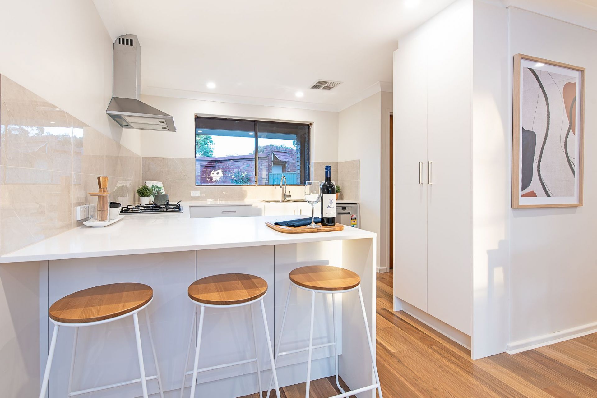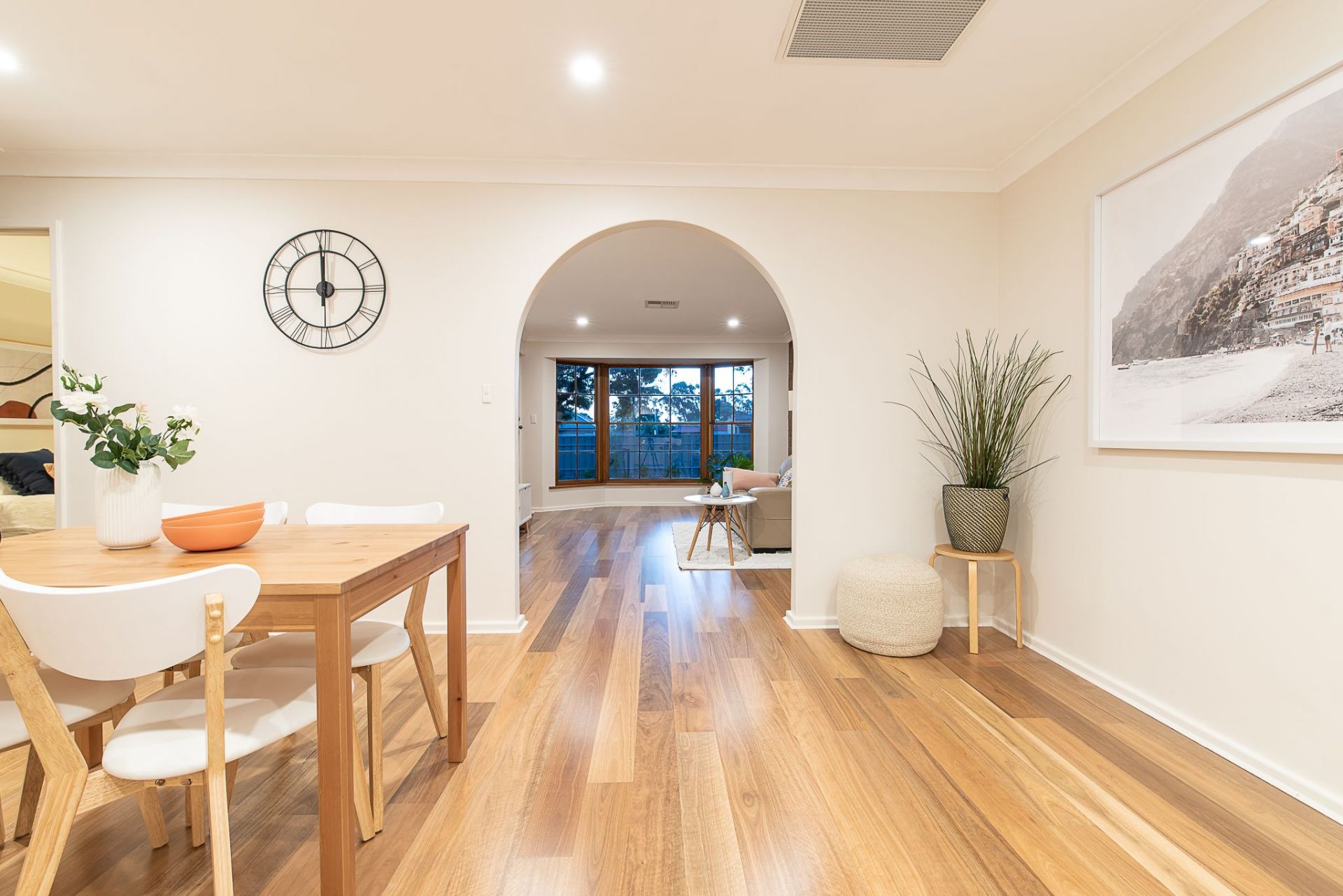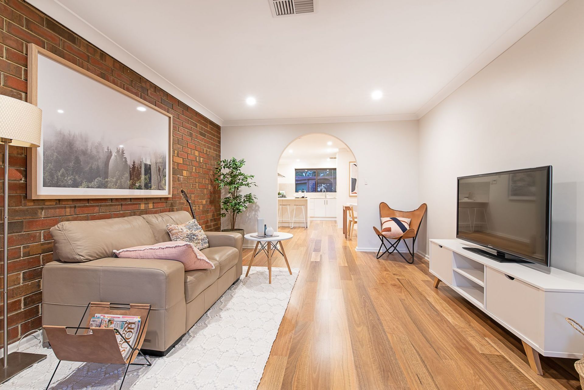 A light-filled sitting room greets you via the front entry, with a bay window overlooking the manicured front garden. Spotted gum timber flooring leads to the open plan kitchen and dining space, that inspires thoughts of entertaining the family. The newly renovated kitchen features stone benchtops with breakfast seating that strike a beautiful contrast with the timber floors. The stainless-steel appliances, gas cooktop, built-in pantry and dishwasher offer modern living with sightlines across the private rear spread of lawn.