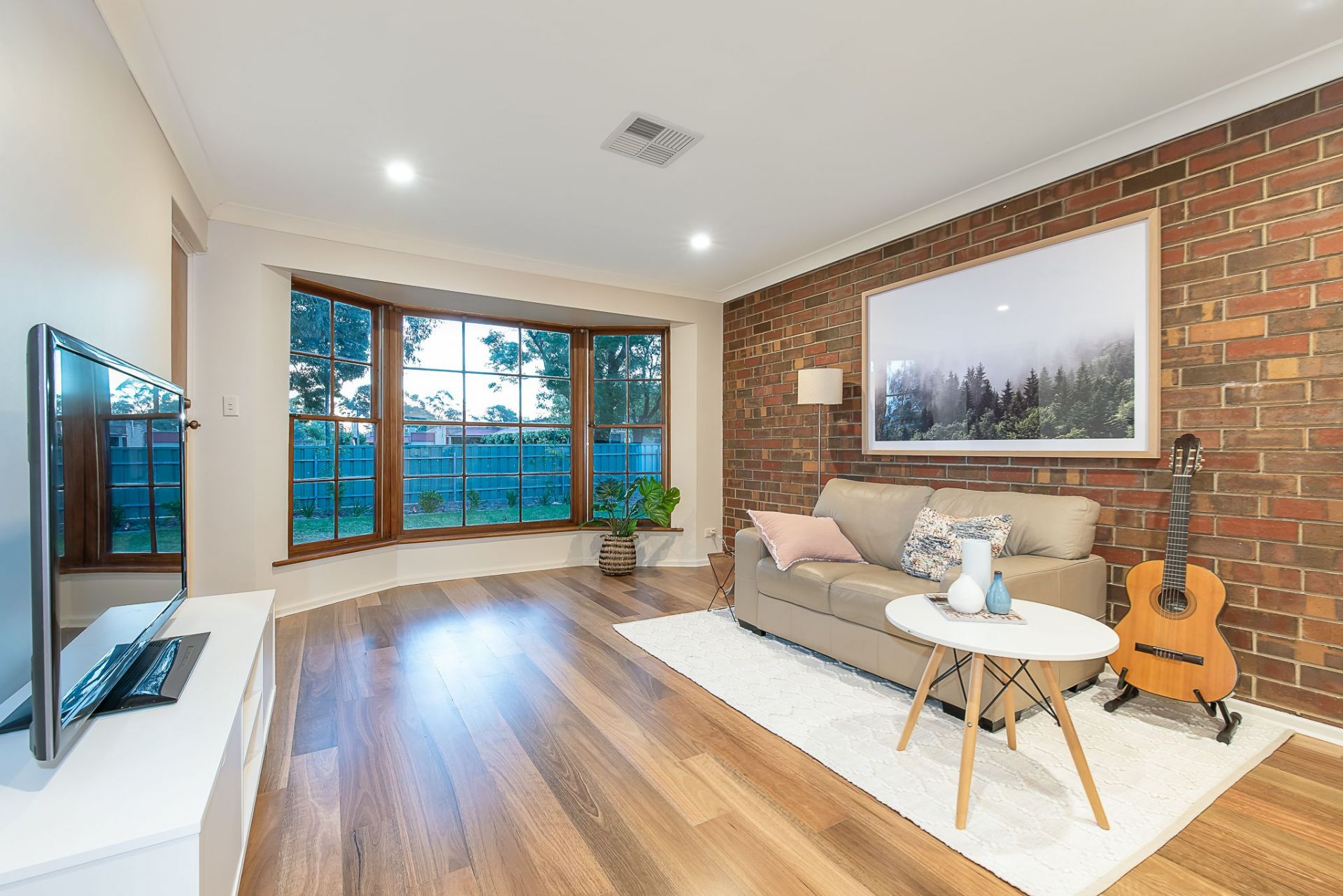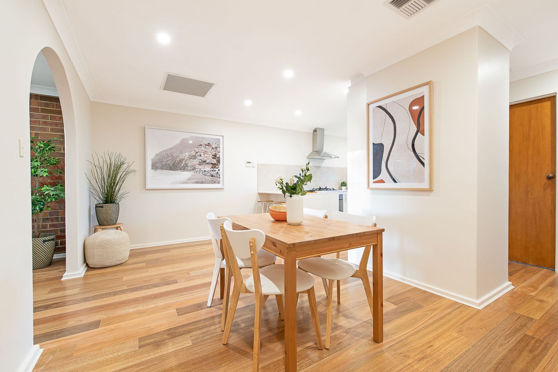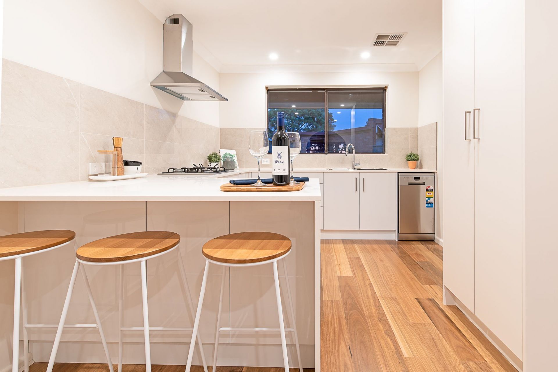 A light-filled sitting room greets you via the front entry, with a bay window overlooking the manicured front garden. Spotted gum timber flooring leads to the open plan kitchen and dining space, that inspires thoughts of entertaining the family. The newly renovated kitchen features stone benchtops with breakfast seating that strike a beautiful contrast with the timber floors. The stainless-steel appliances, gas cooktop, built-in pantry and dishwasher offer modern living with sightlines across the private rear spread of lawn.