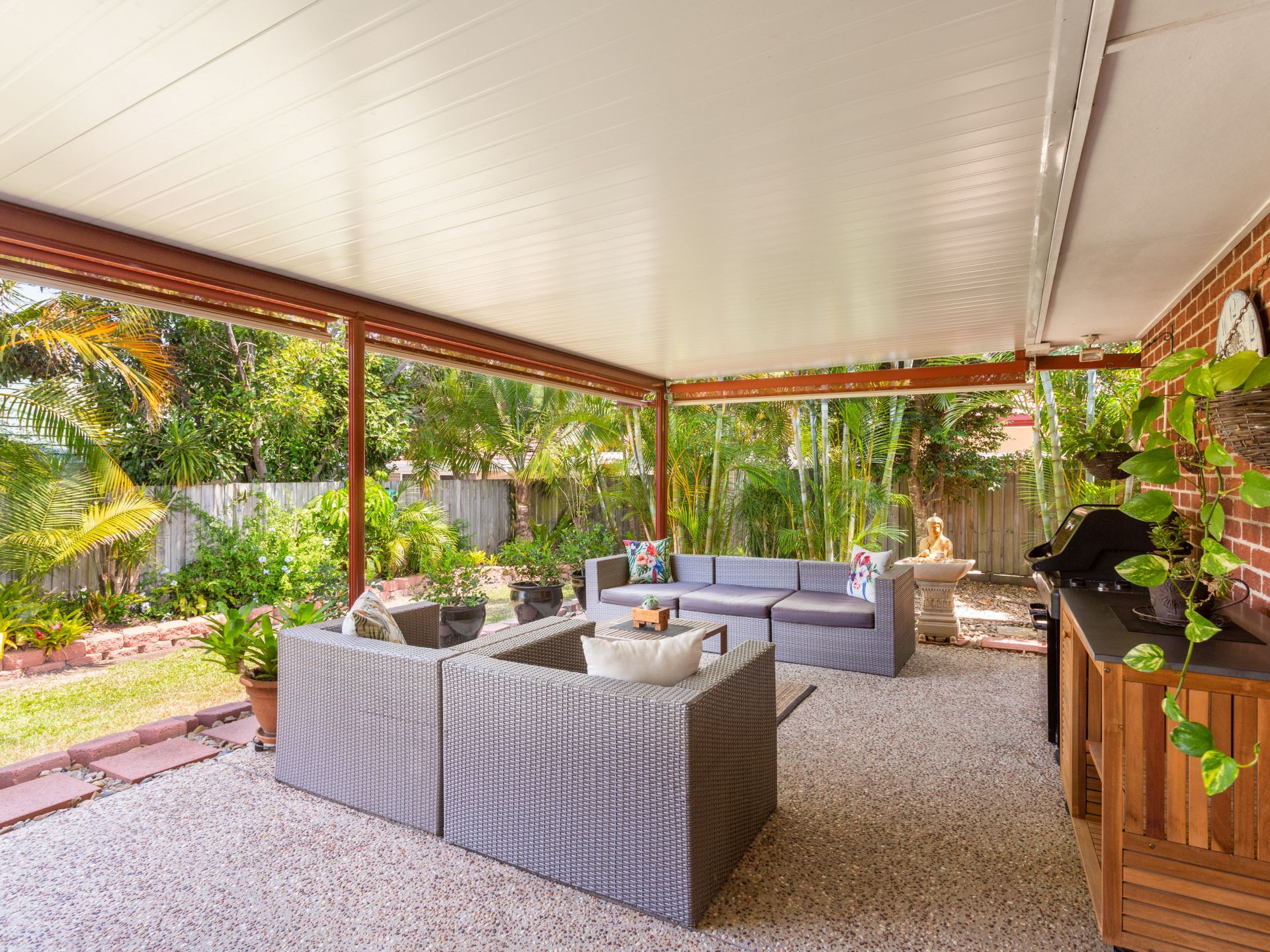 Outdoor undercover entertaining area, with wind-down screens overlooking grassed yard and established easy care gardens