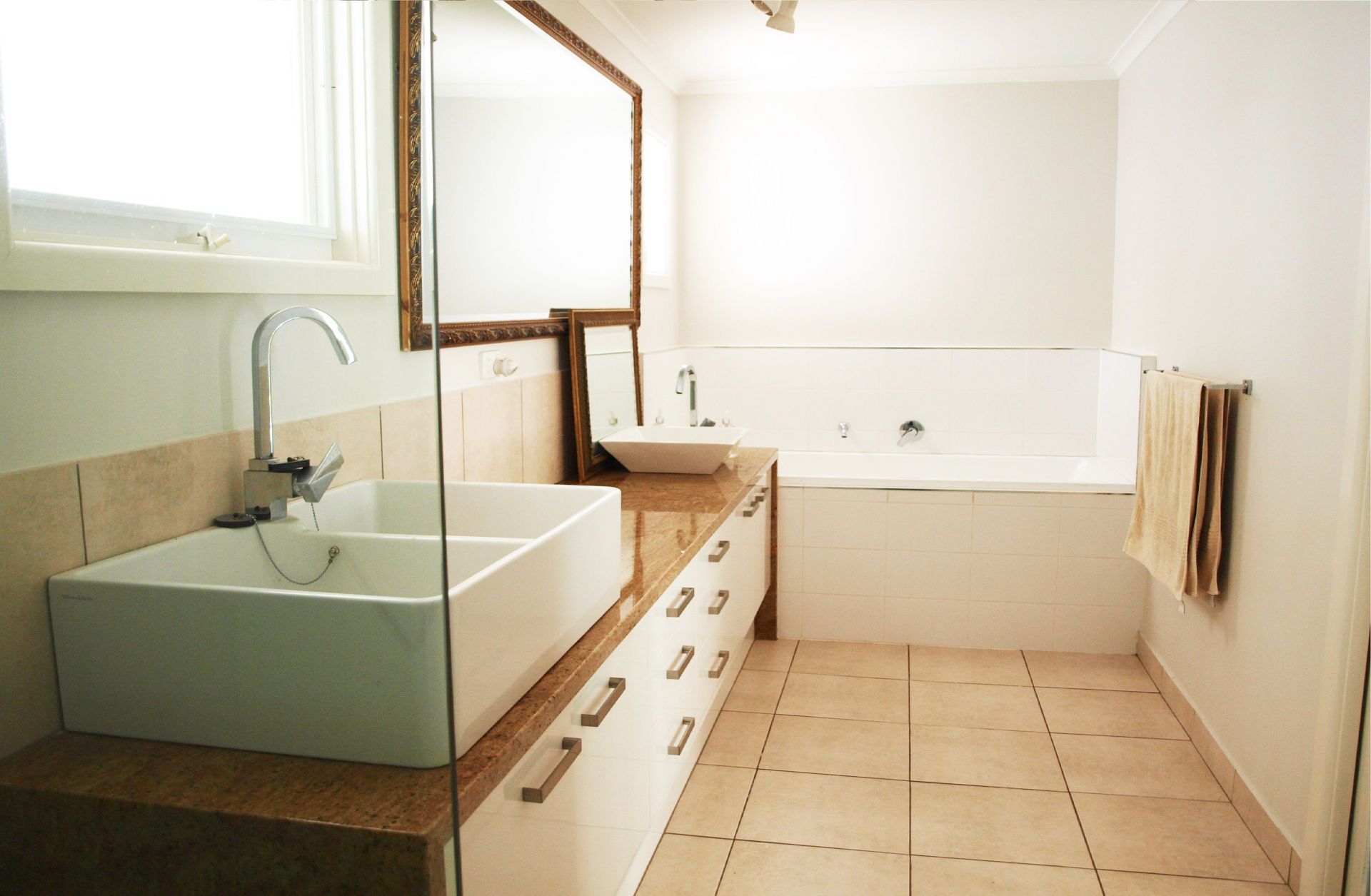 Main bathroom has double shower, double sinks, stone bench and the deepest bath you're likely to see.
