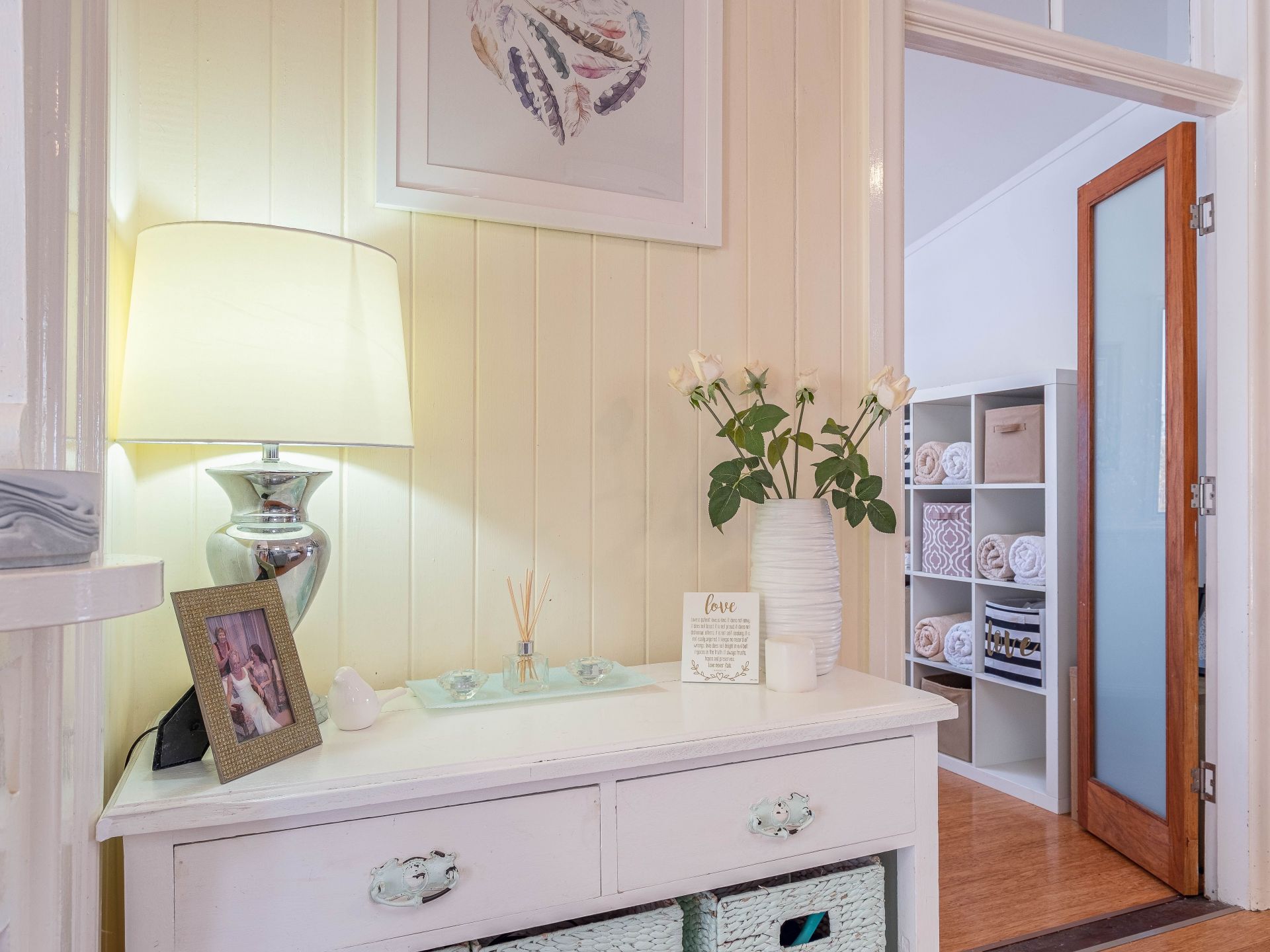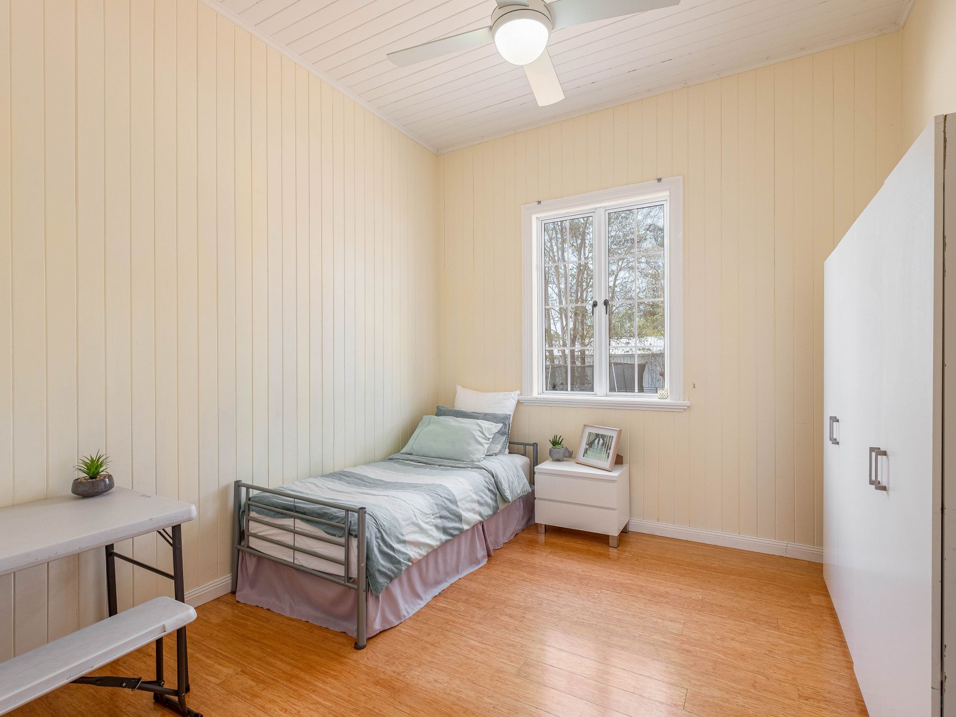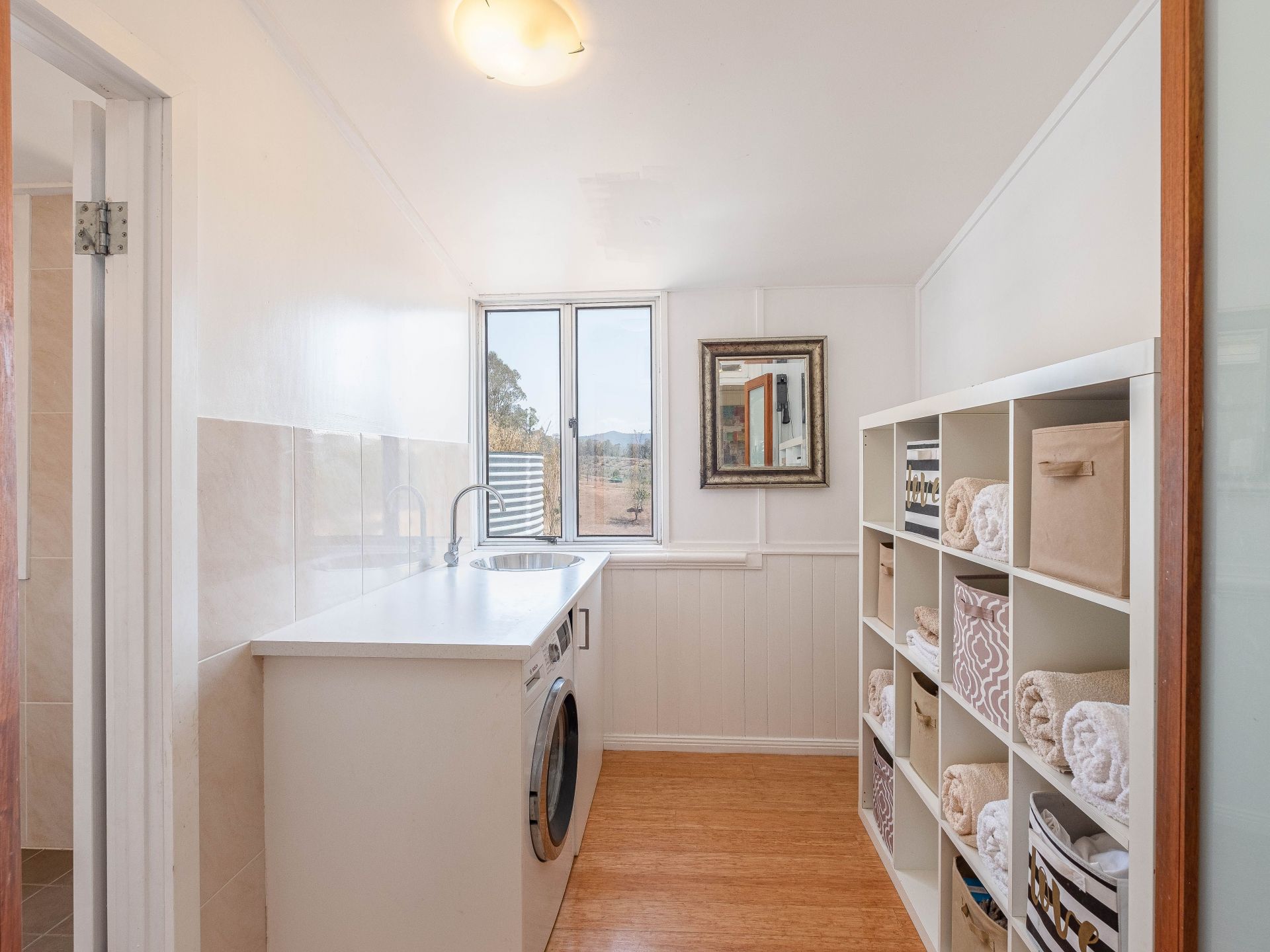 Bamboo flooring throughout (tiles in bathroom)