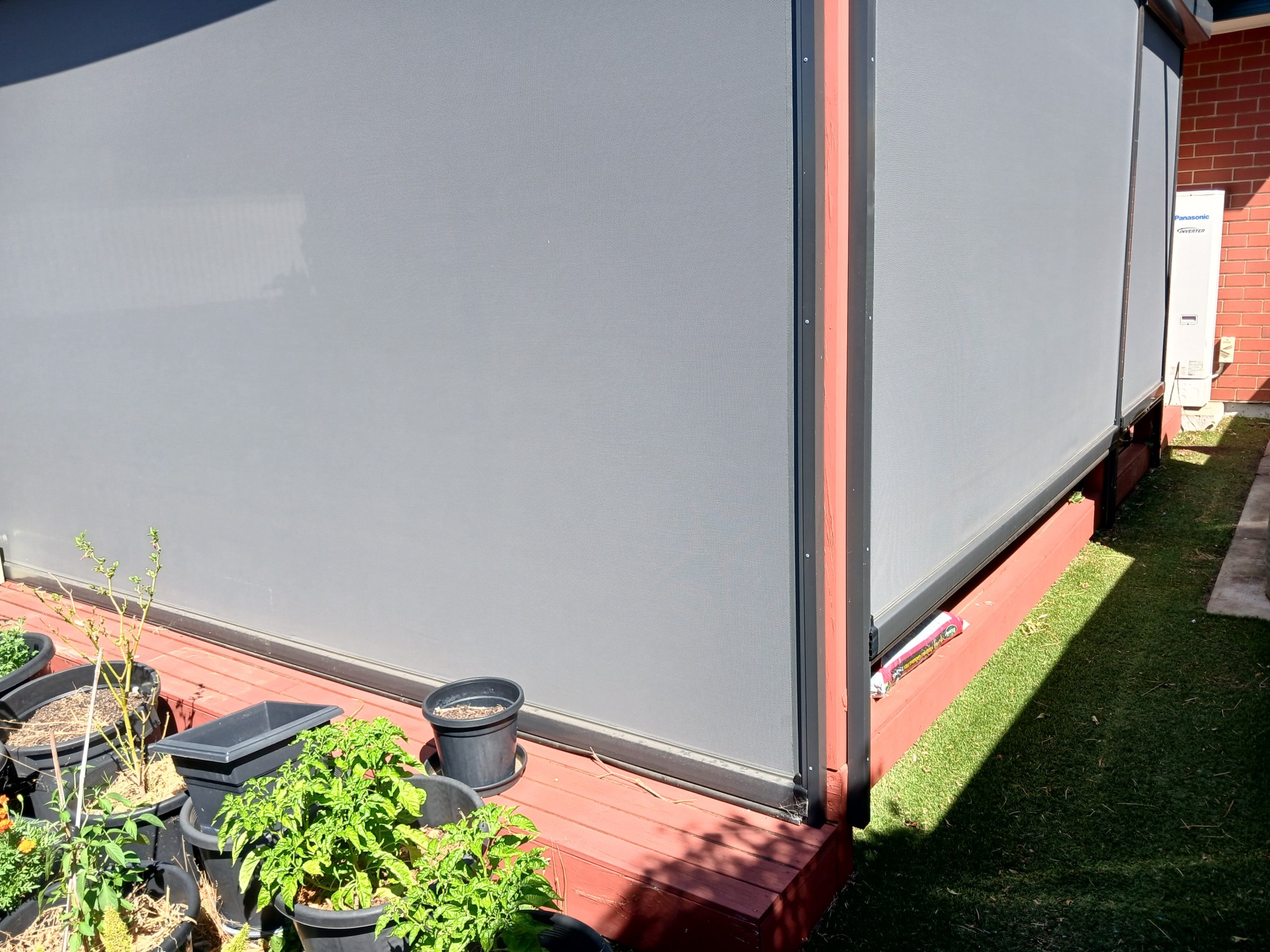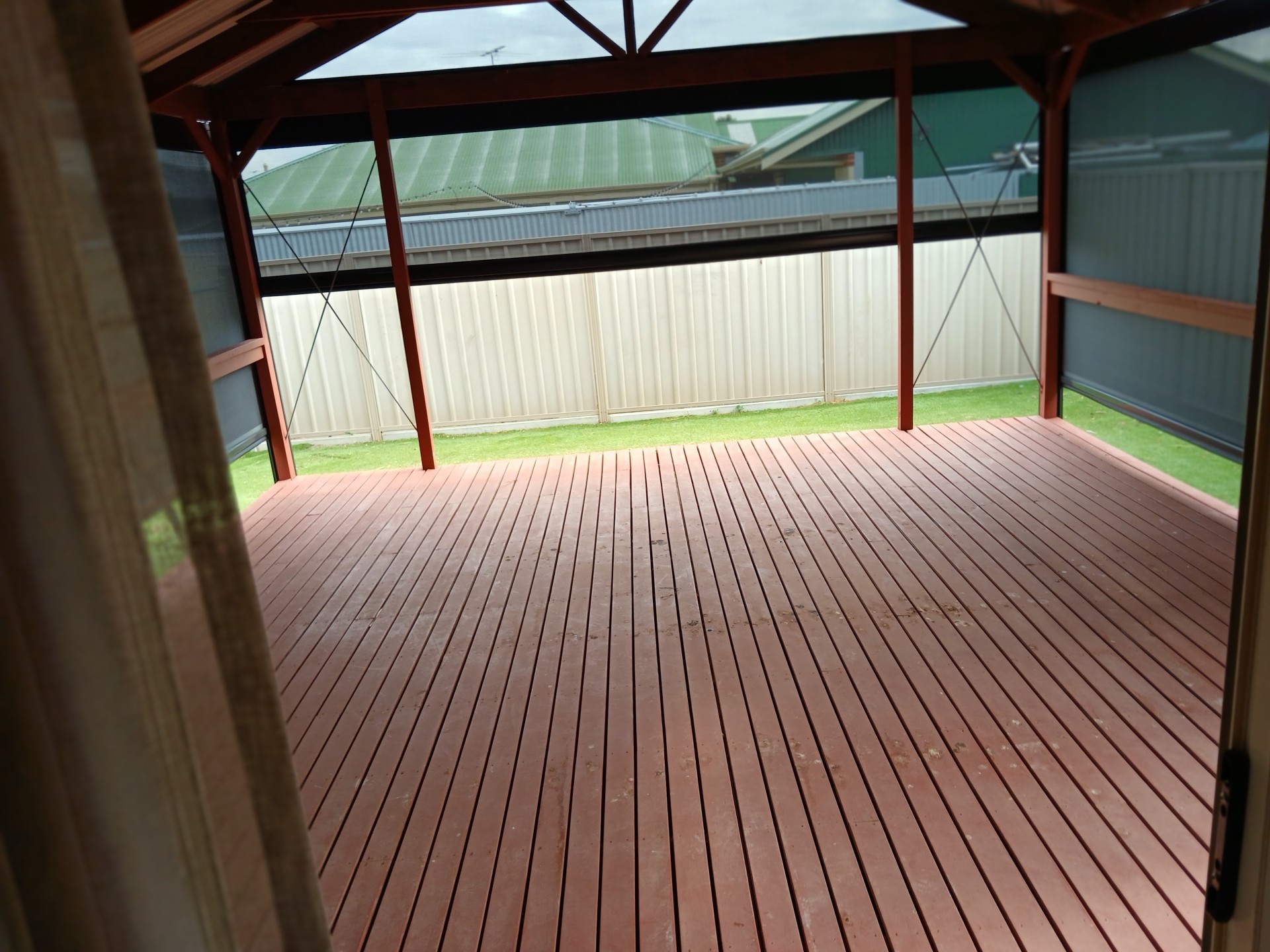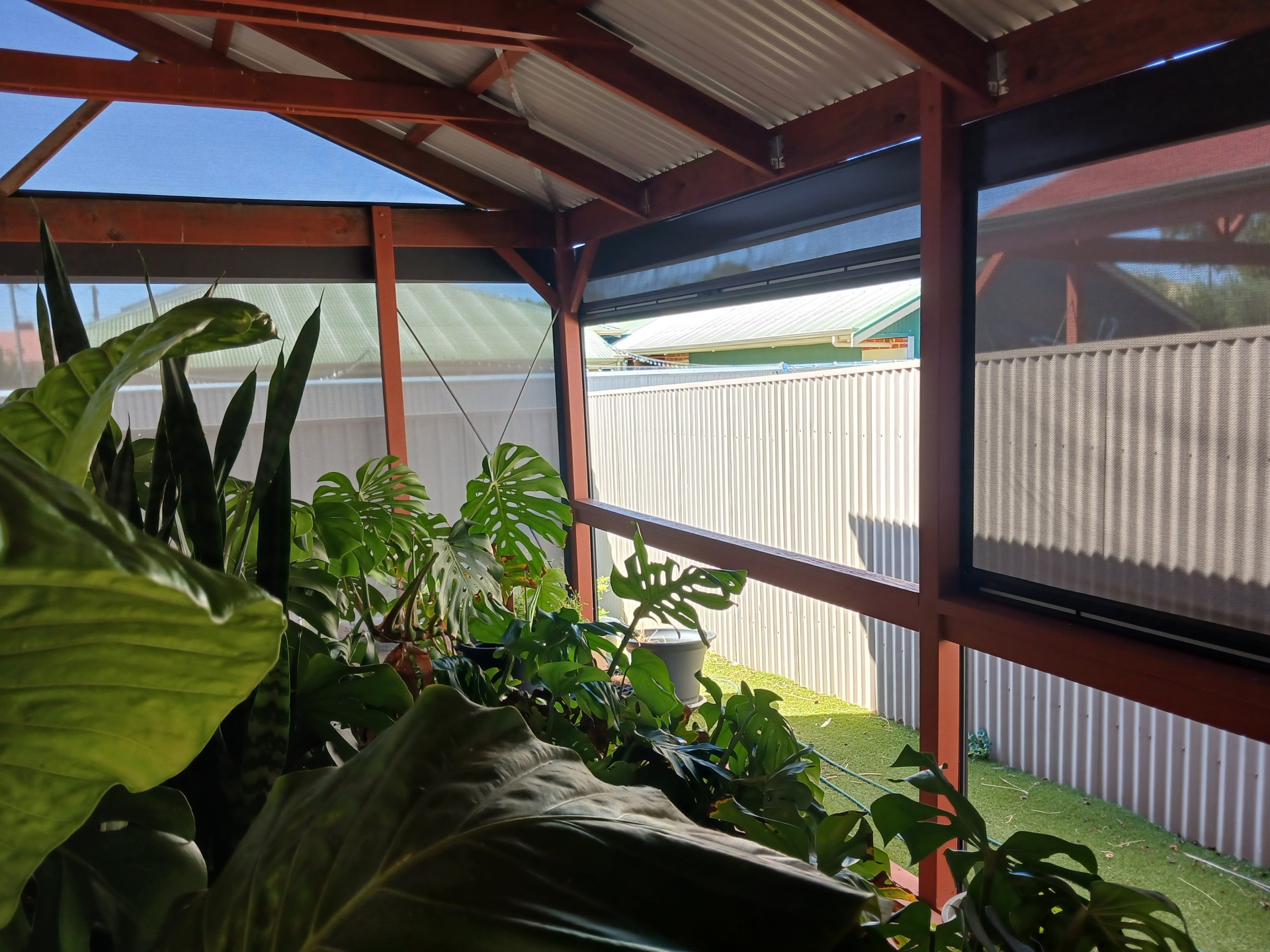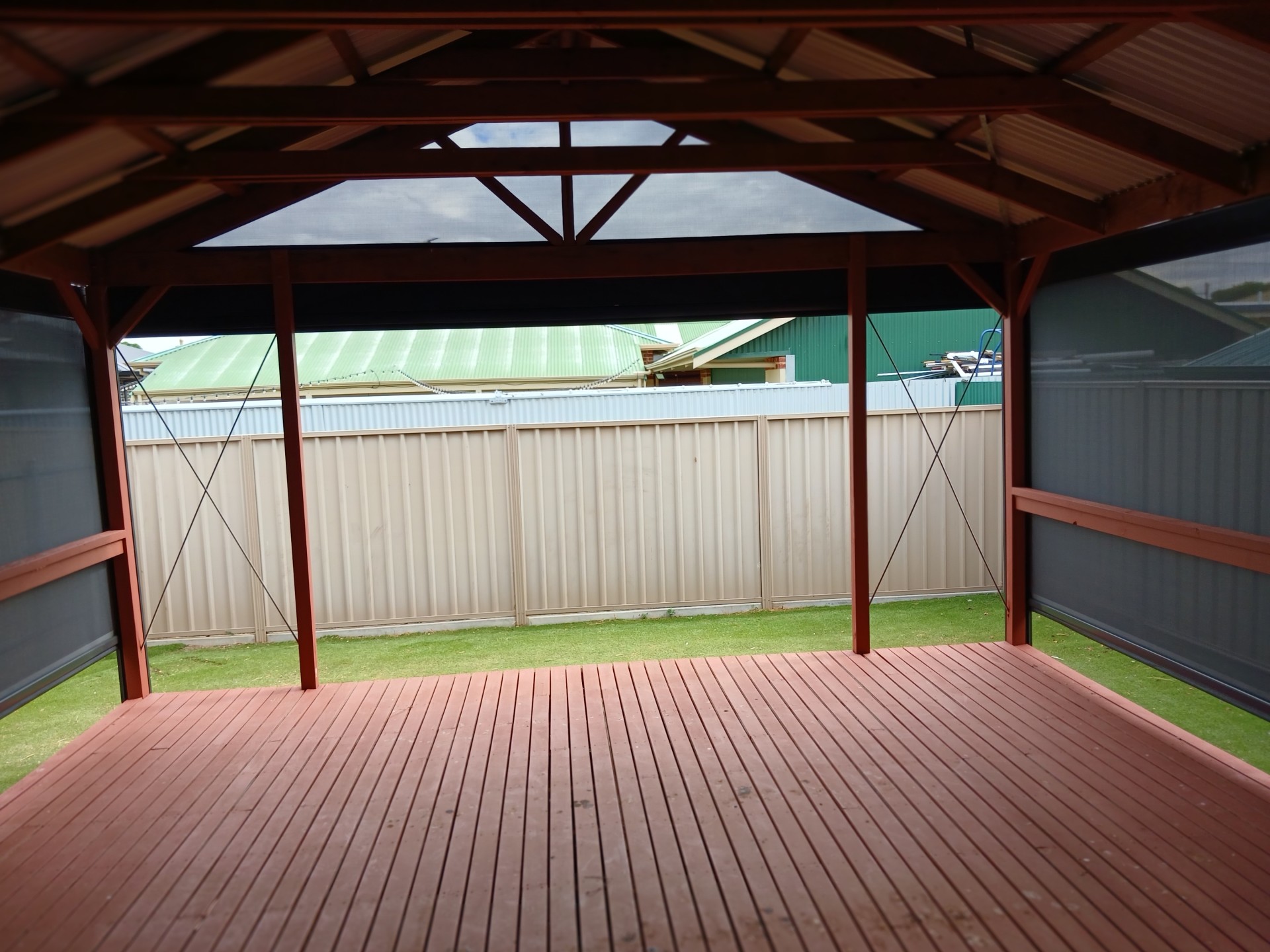 Huge Pergola ( 30 sq m +) with roof at rear, with complete adjustable ziptrack enclosed shadecloth very windproof, excellent entertaining space