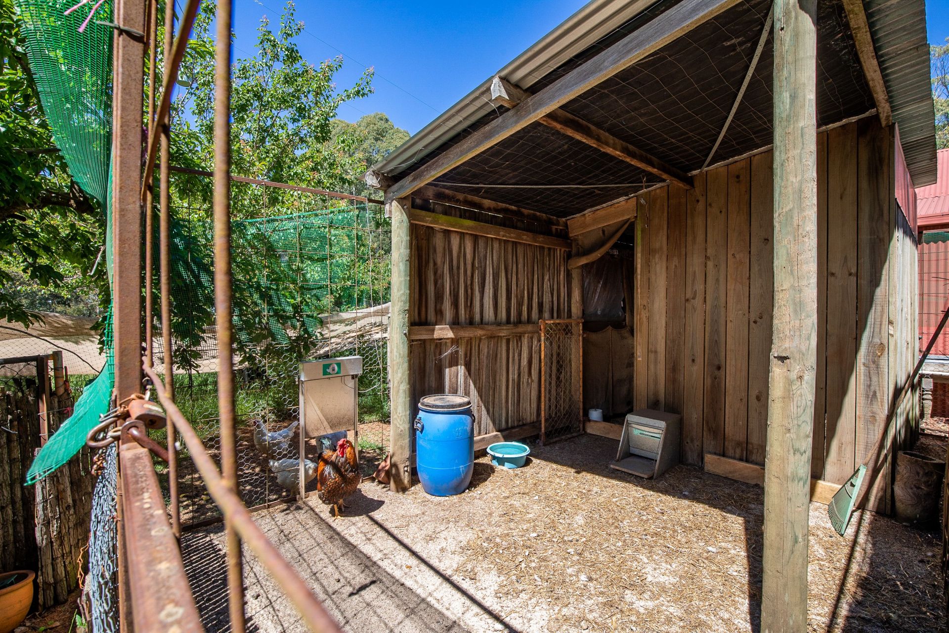 The 600sqm barn is fully set up with power, lighting, water hot and cold. There is a storage room and benches and a fully self contained accommodation area that was originally an office area. You may choose to continue with the existing Host Farming short term holiday let or turn it into a granny flat or accommodation for employees etc. It has a very large open plan set up that has a full kitchen, bathroom and wood fire heating. The Barn really has to be seen to be fully appreciated. As well as the barn there are several other outbuildings nearer the house, a large 3 bay machinery shed with workshop and wood shed built into the side, has power and lighting installed. There is the mandatory chook shed and a rustic old hewn timber stable next to the established fruit tree orchard.