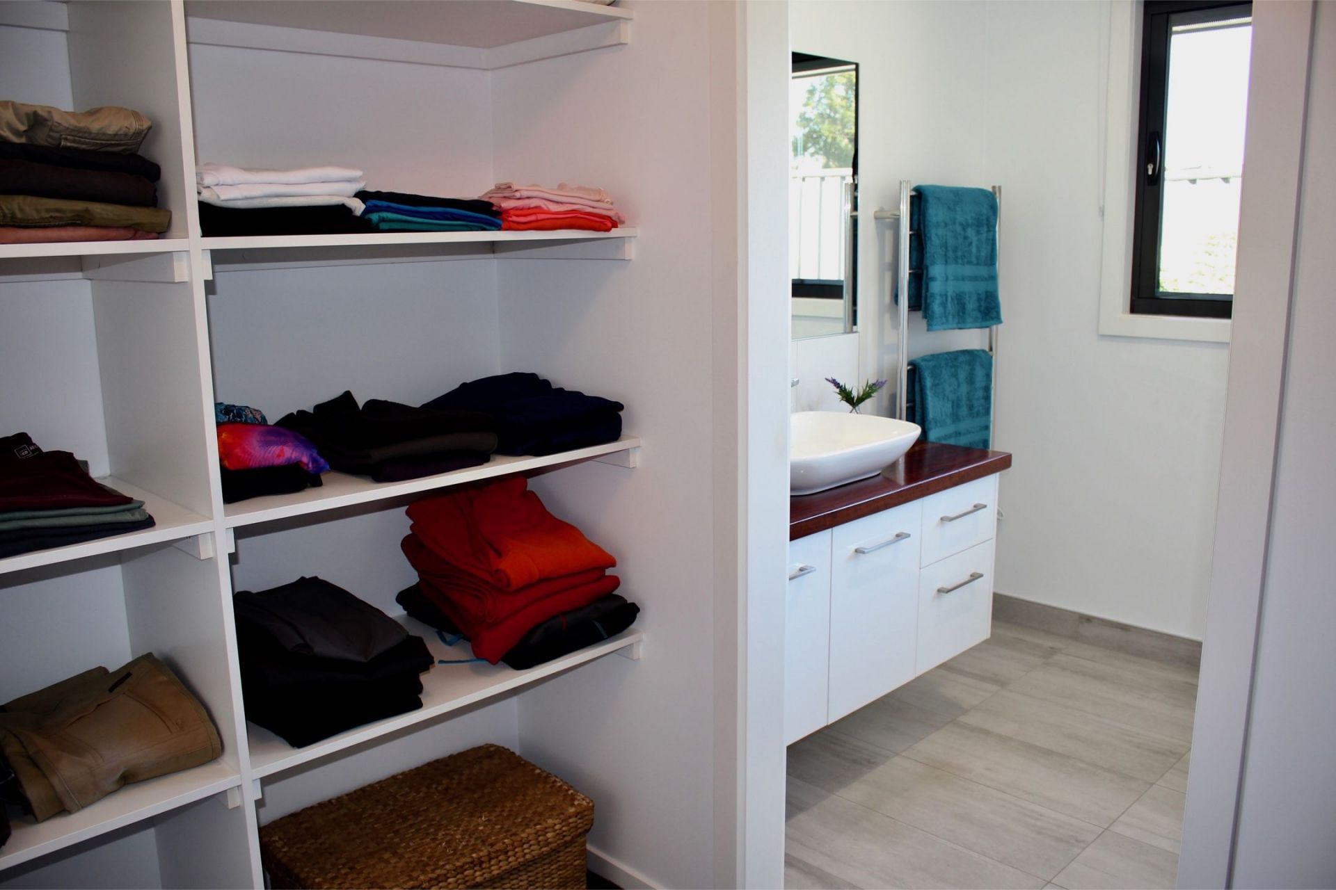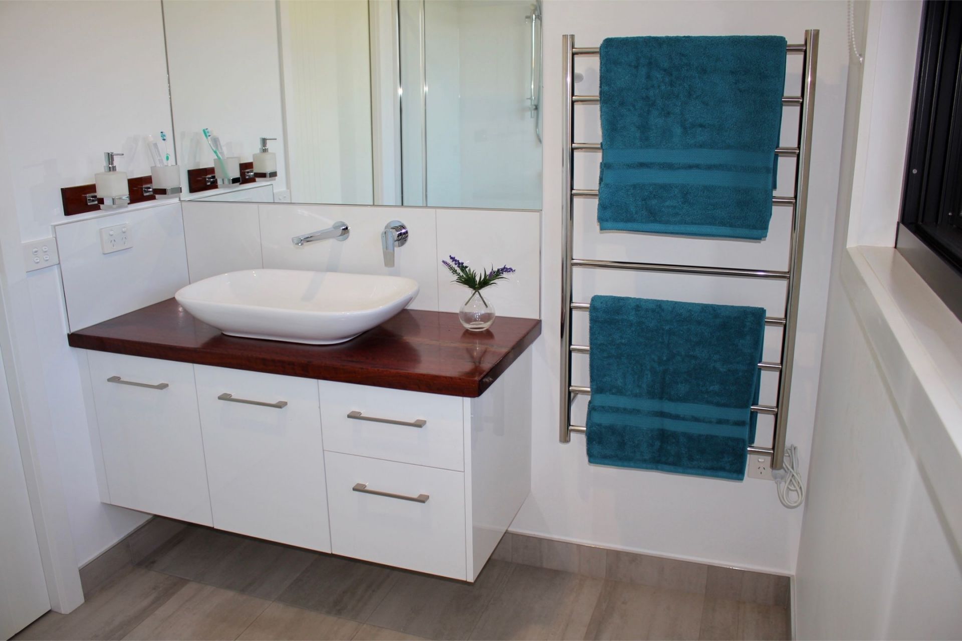 The Master bedroom has a generous walk-in-robe and ensuite complete with a stunning custom Redgum vanity and heated towel rail.