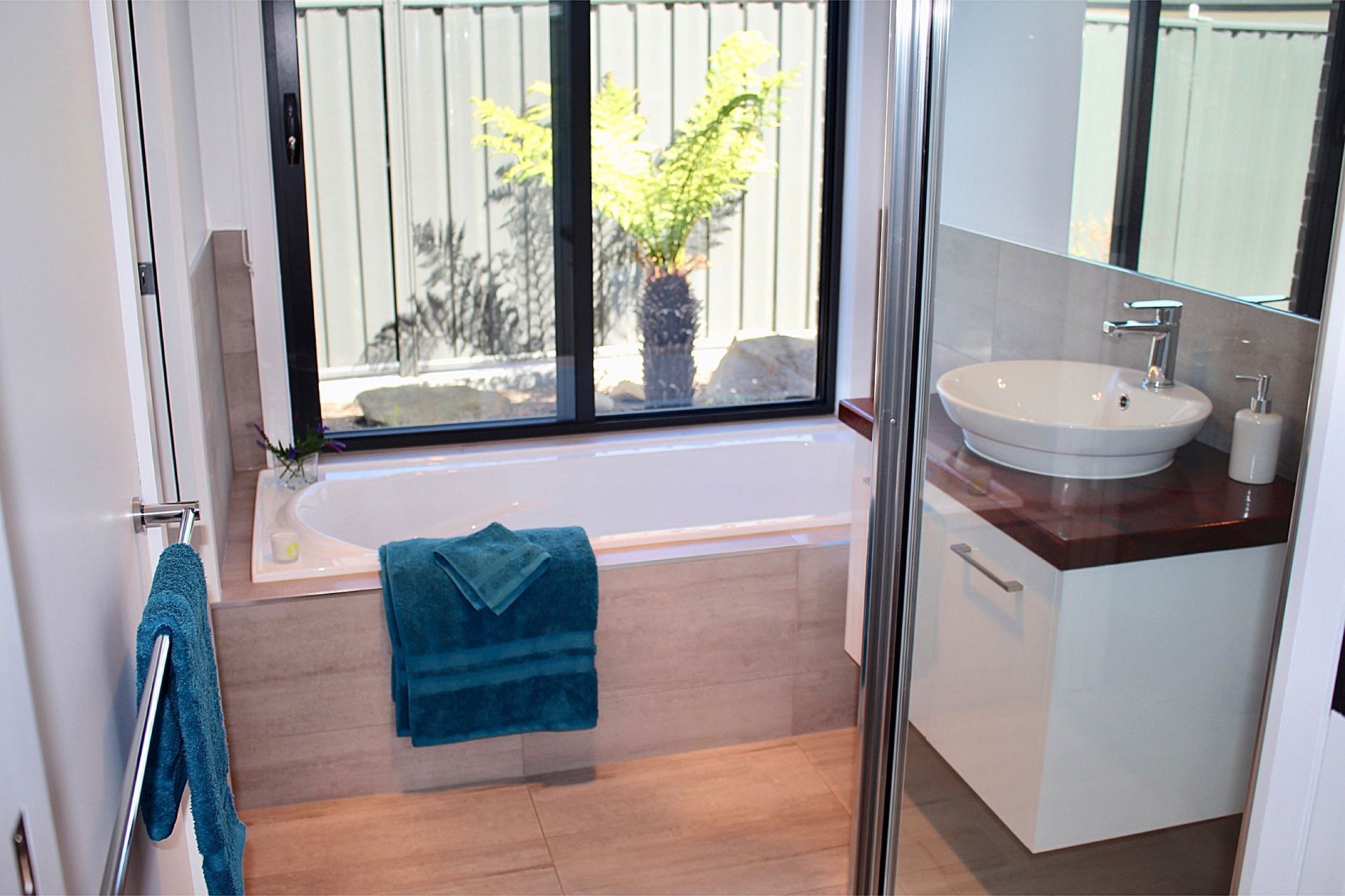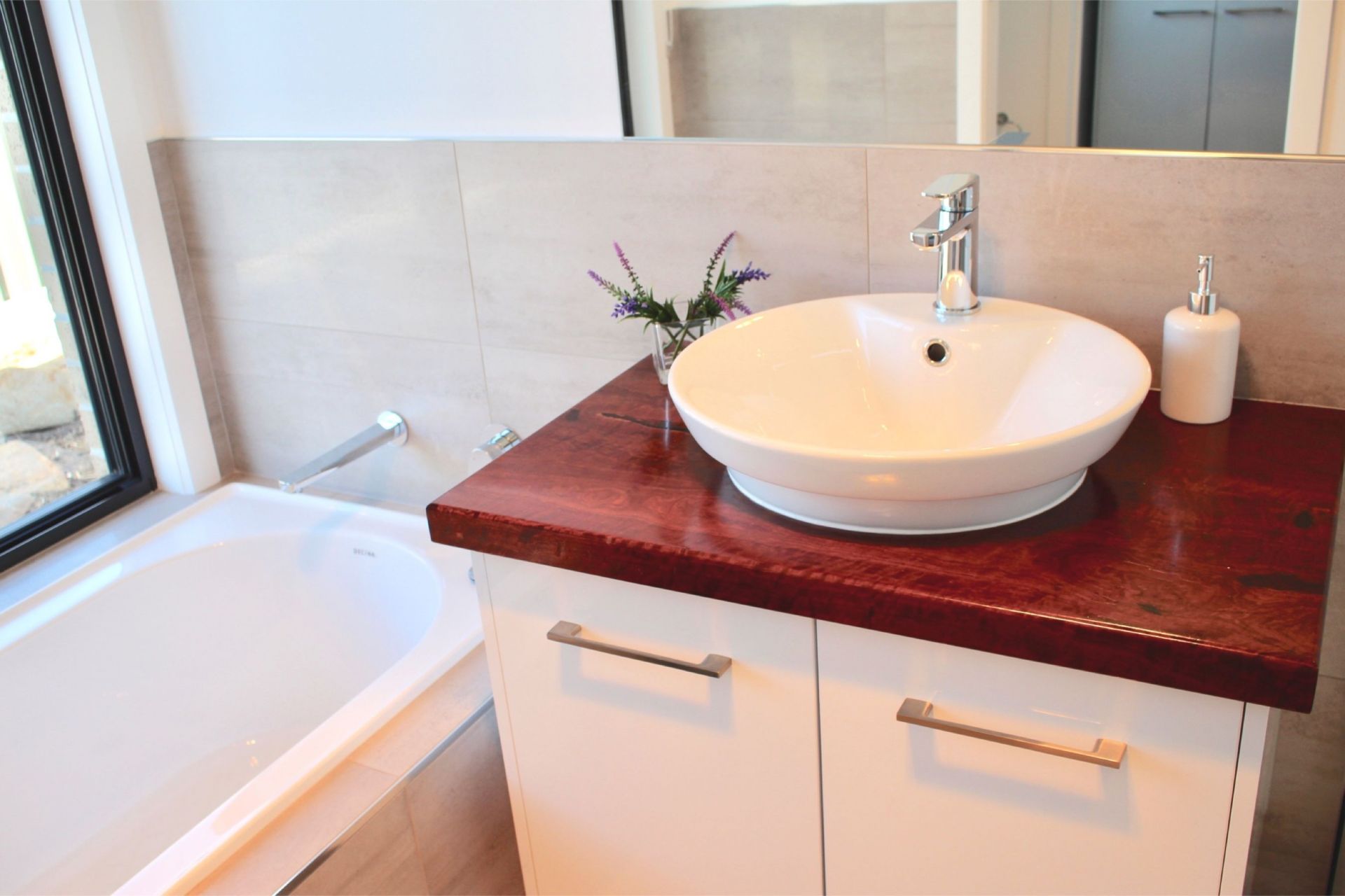 The main bathroom also includes a custom redgum vanity and a built-in bath with a view out to the private rear garden - perfect for that soak after a hard day.