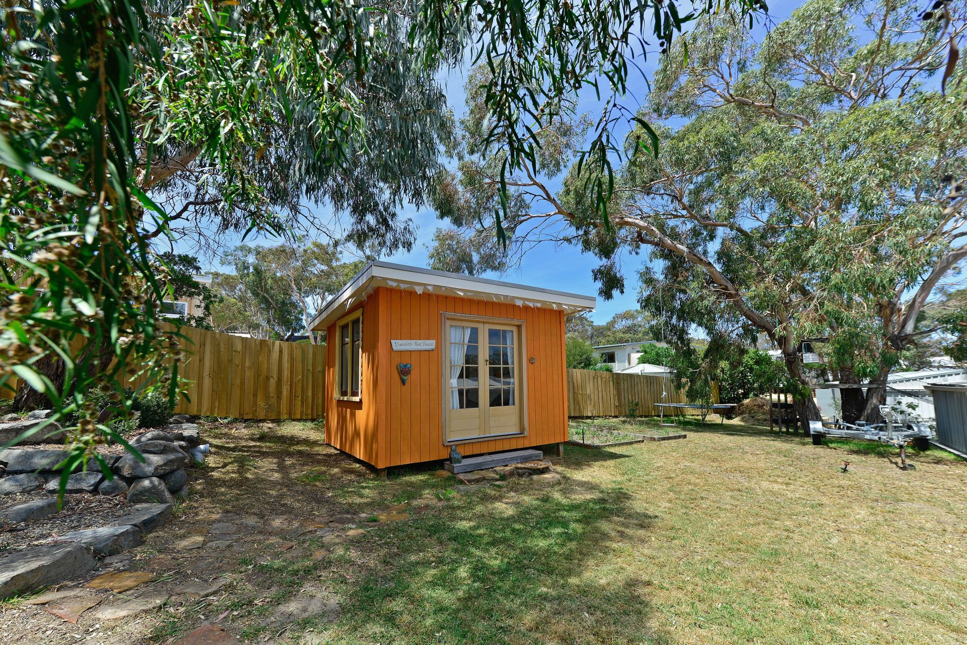 - Large tree house across two trees at back of the lot is a favorite with children;