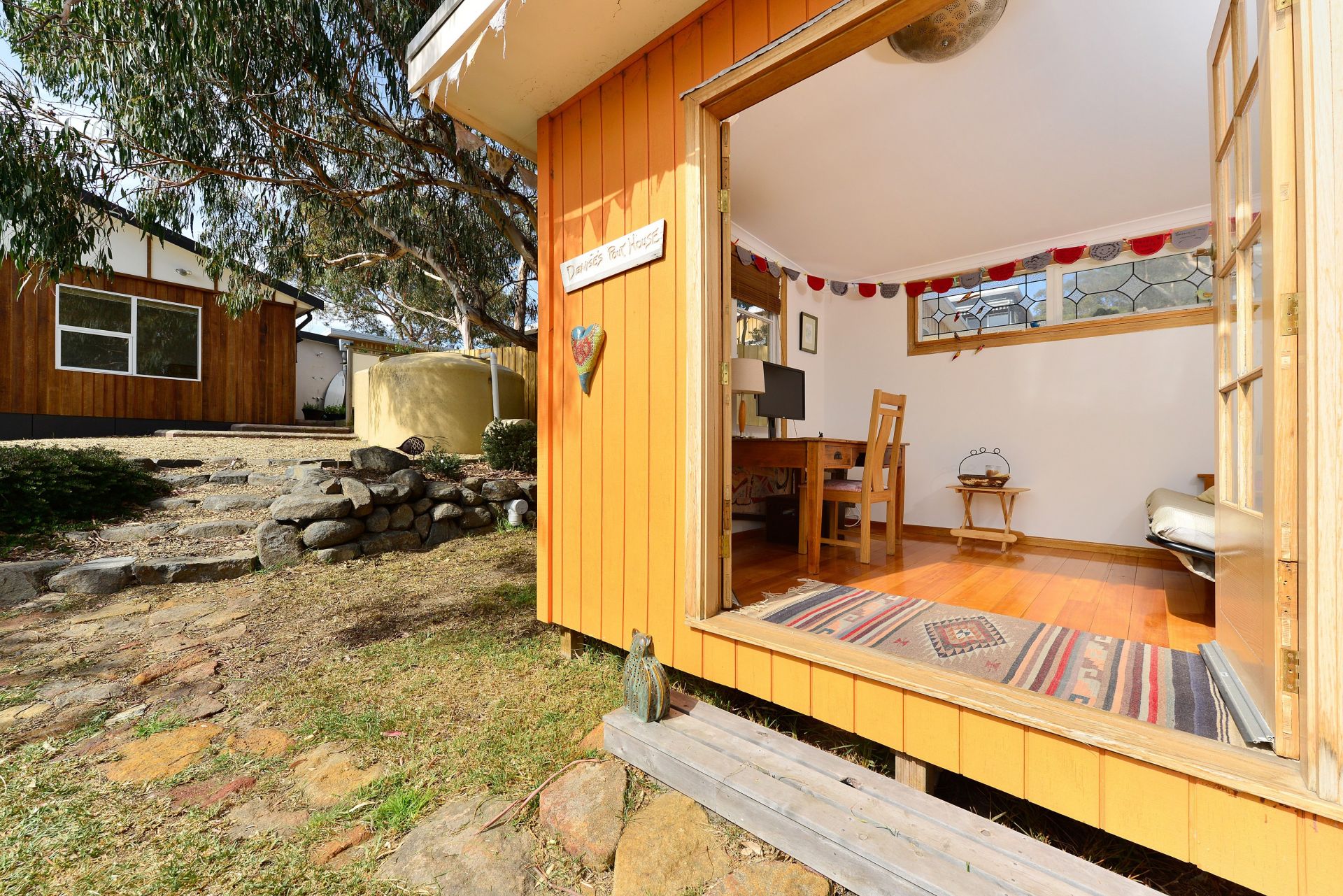 - Beautiful separate studio with oversize French doors, hardwood floors, power and lighting just steps from the house make this space perfect for office, yoga room, or guest retreat;