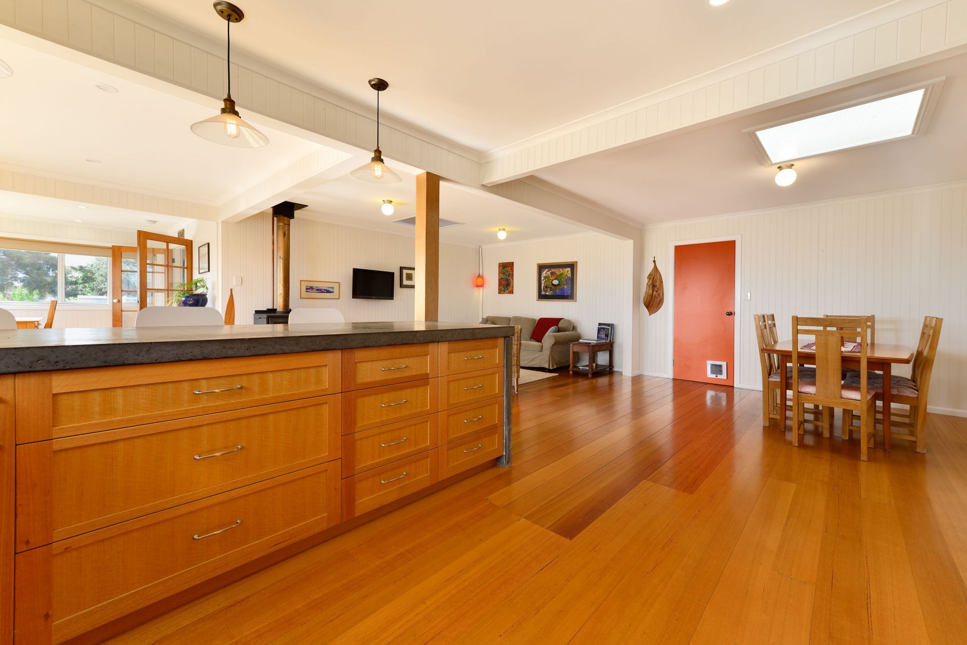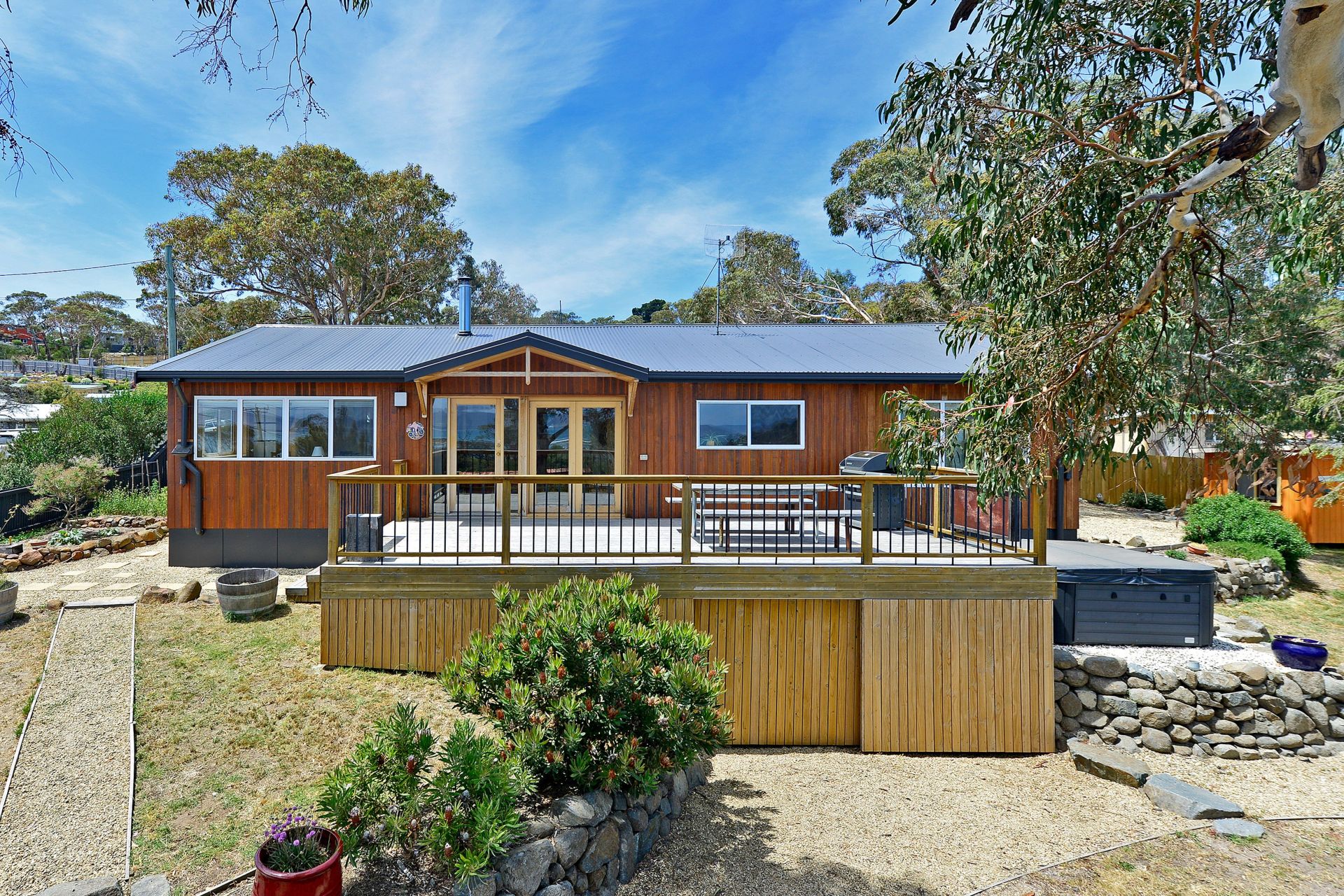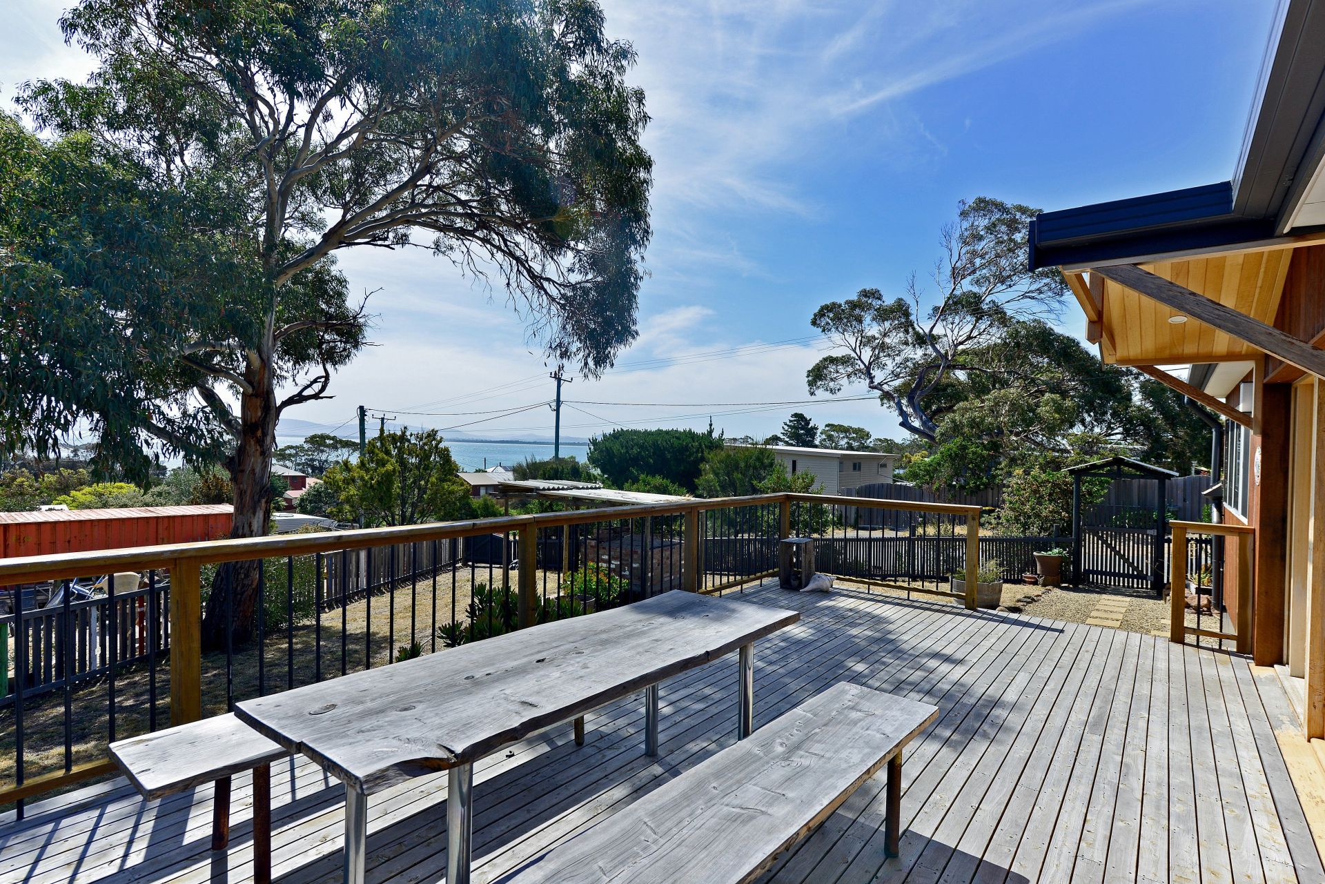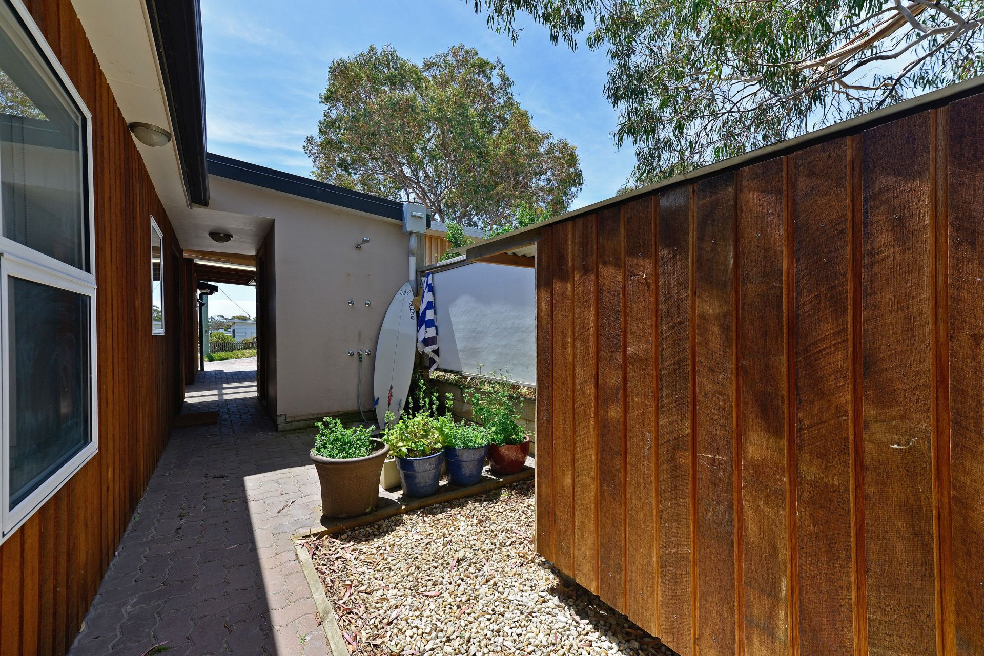 The house encourages an active beach lifestyle, with Park Beach, one of Tasmania's most spectacular beaches, just a block away on one side, and the scenic Red Ochre Beach a two minute walk at the bottom of the street. At the back entrance to the house is a private outdoor shower for washing off the saltwater, with an adjacent custom built surfboard cupboard. Weatherproof storage for bicycles, toys, firewood, additional surfboards and sundry items is available under the deck. Dodges Ferry children's park, shops, boat ramp, school are only a short stroll away.