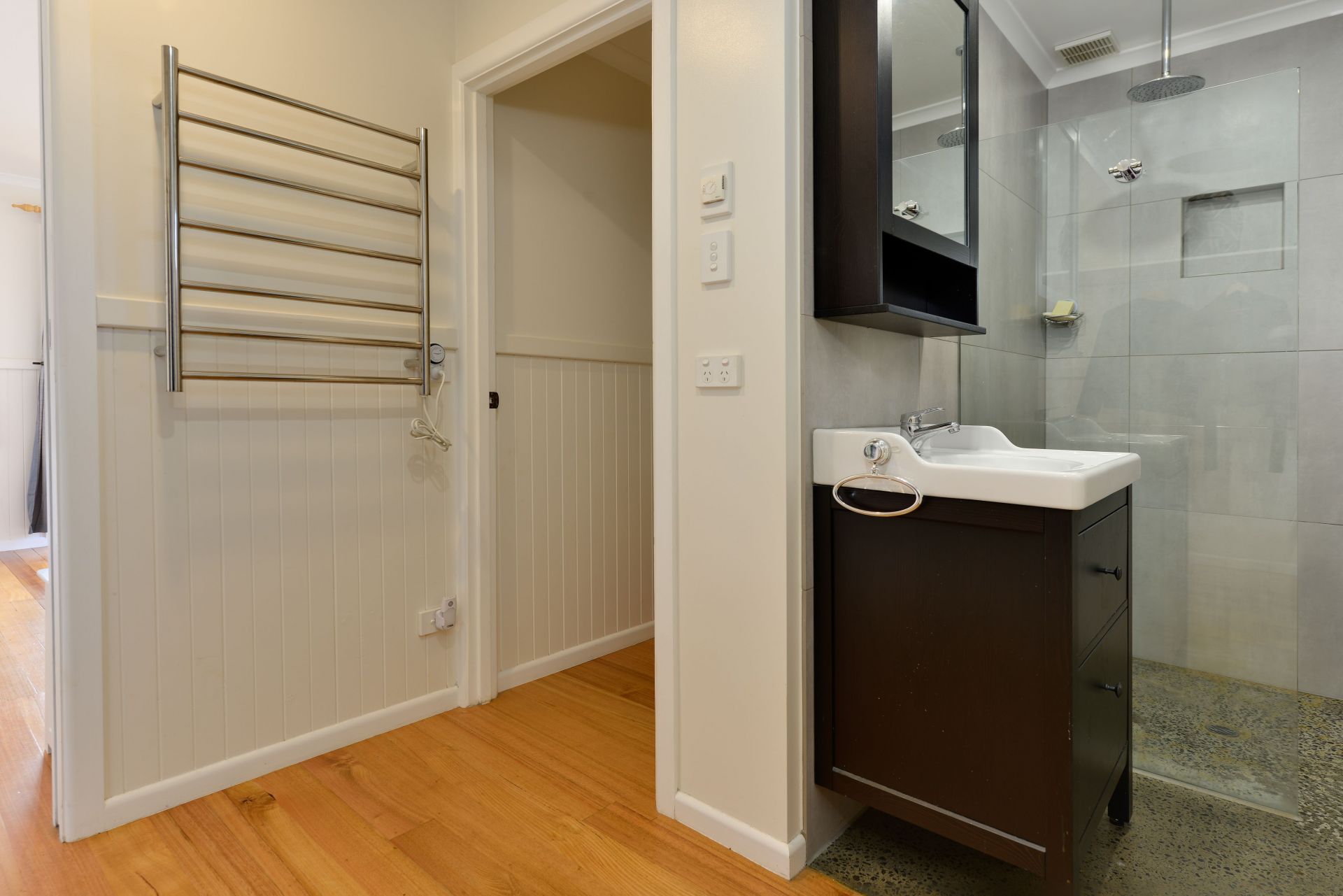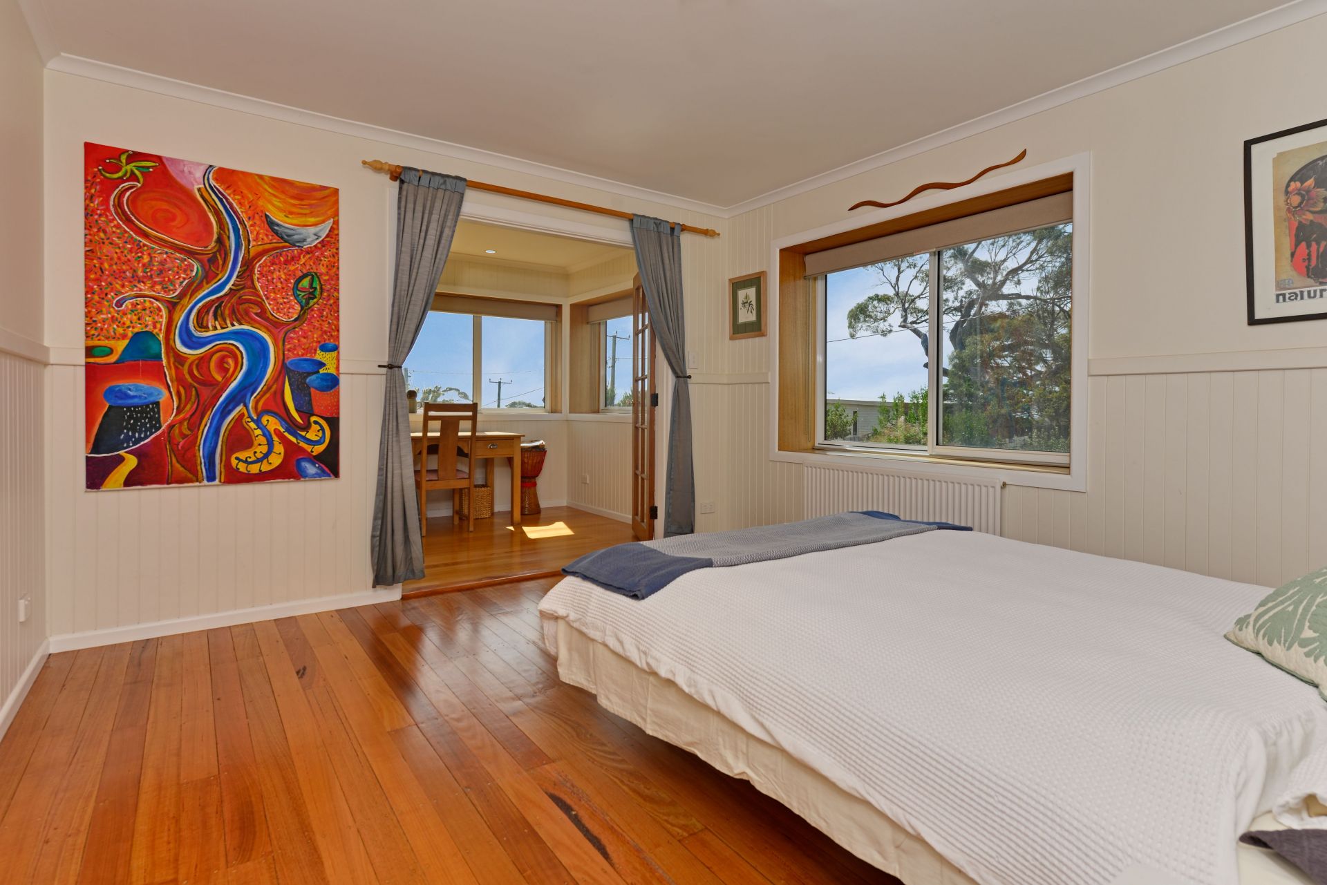 The master bedroom is set off from the living space by a sliding wall, opening into the sunroom that catches all day sun. The adult retreat includes the sunroom, connected by vintage French doors into the master bedroom, and flowing through to an en suite with separate toilet, hanging robe, dressing room, and shower. Heated floors, designer tiles and timber flooring complete this fabulous space.