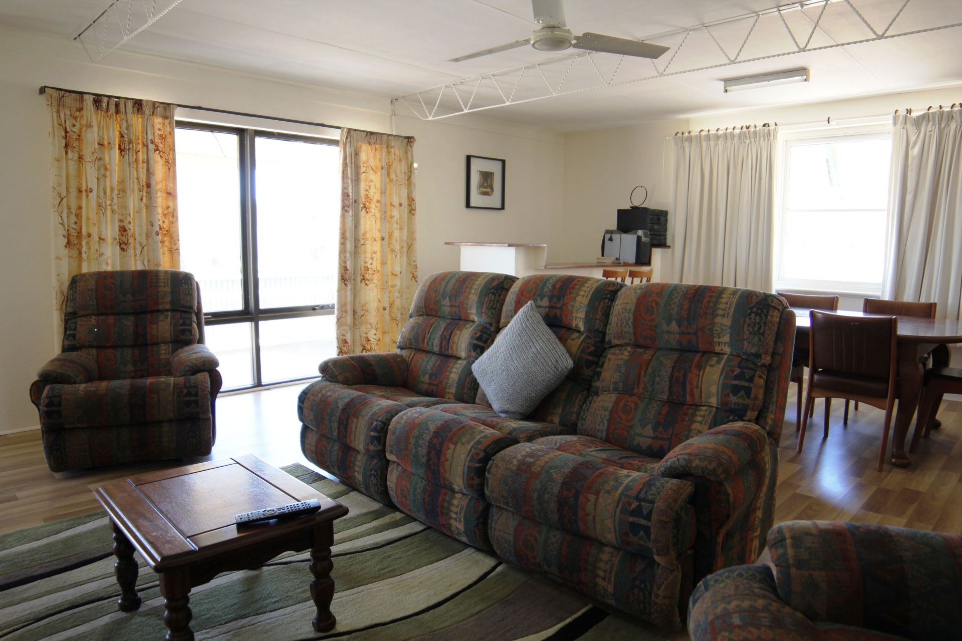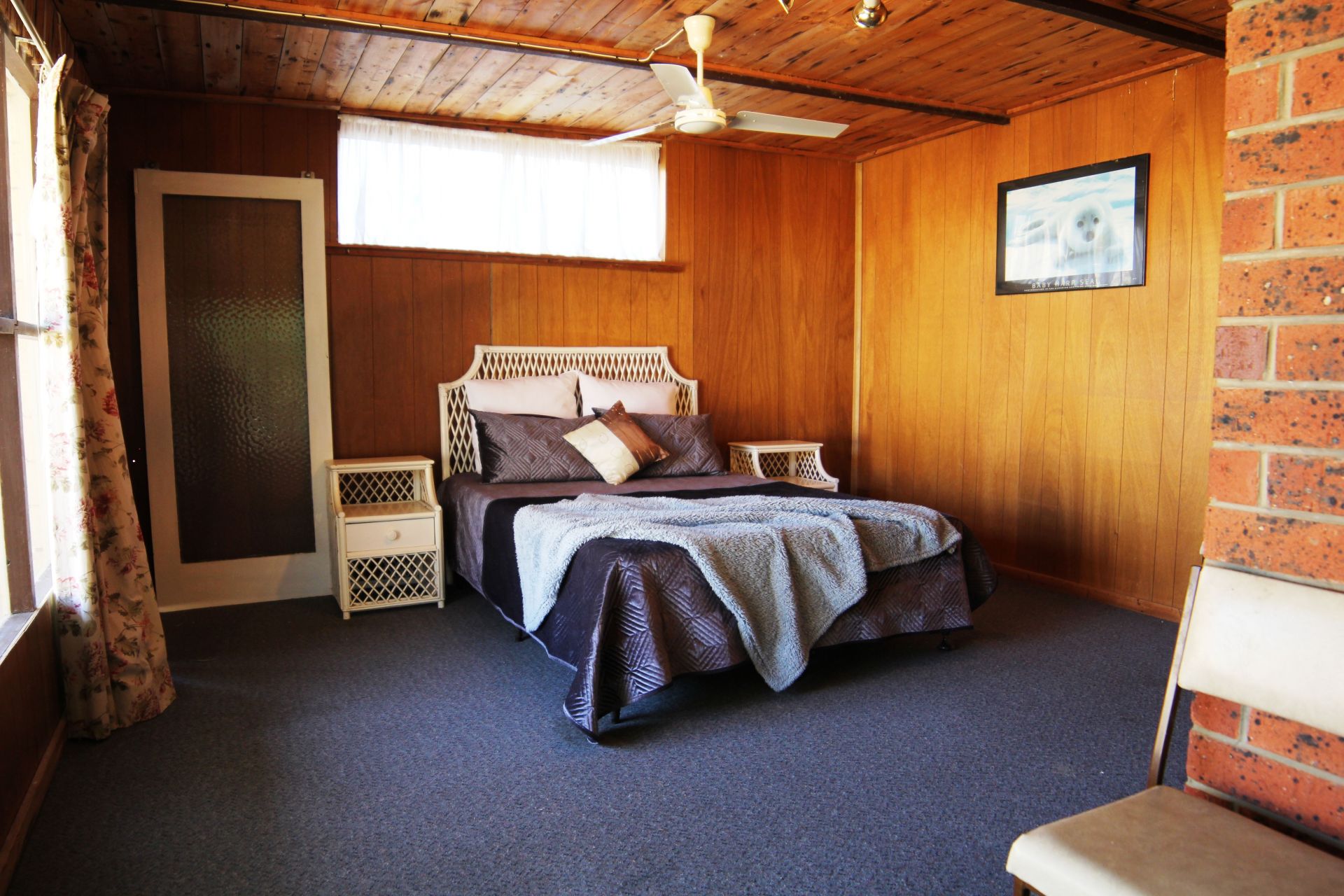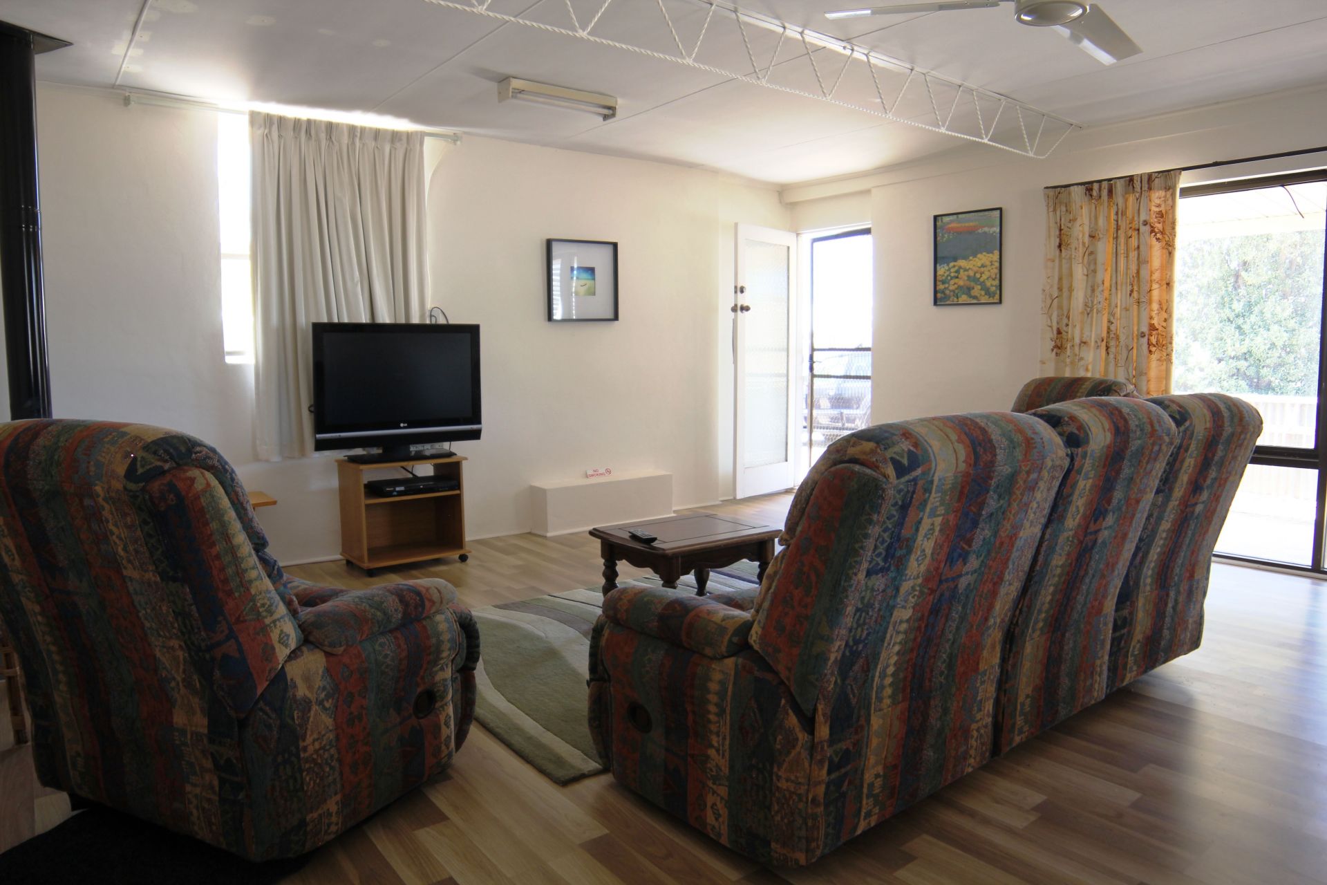 The large lounge room has plenty of room, there is a built in bar for the entertainment after a good days fishing, a combustion heater for the chilly nights and an air conditioner for the heat of the summer days.