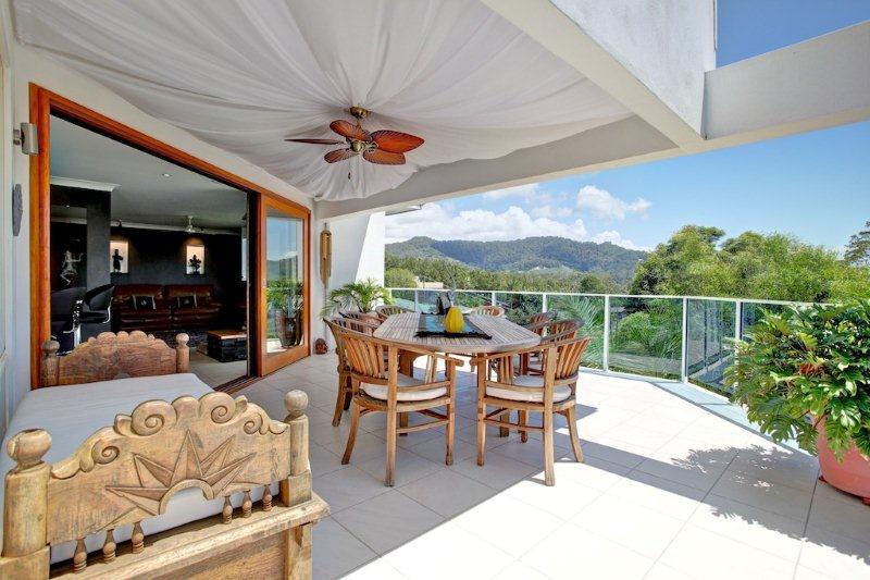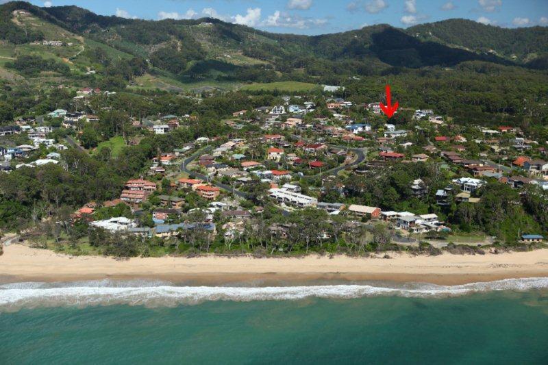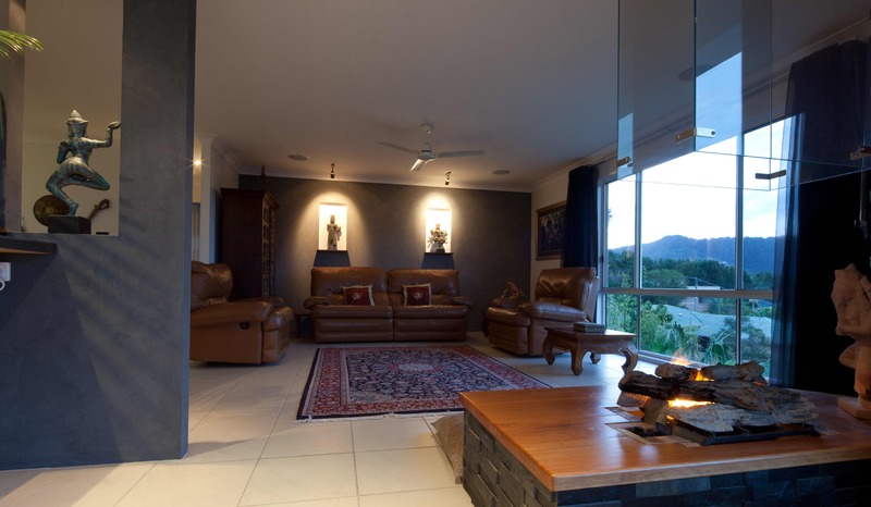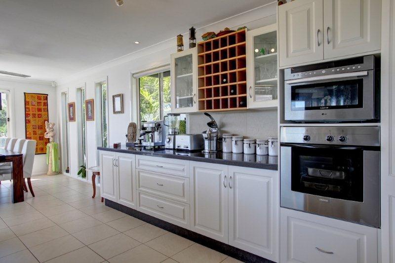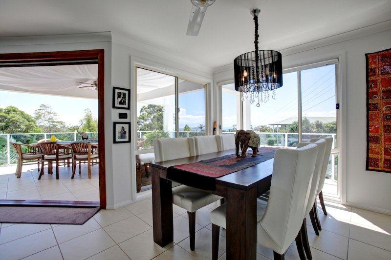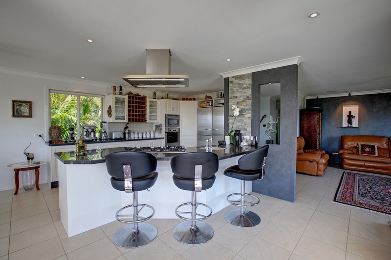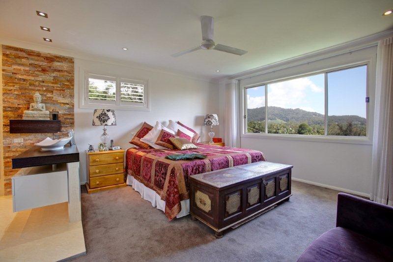 Lush gardens and a tranquil pond lead to the grand front entrance. Take the stairs up to the second level to discover a relaxed lounge area, a large open plan kitchen which sits at the heart of the living area and features quality Miele and Highland stainless steel appliances and a huge silk lined covered balcony all with stunning 180 degree views from the Solitary Islands to the mountains, and is a perfect place to relax any time of day thanks to the north-east aspect.