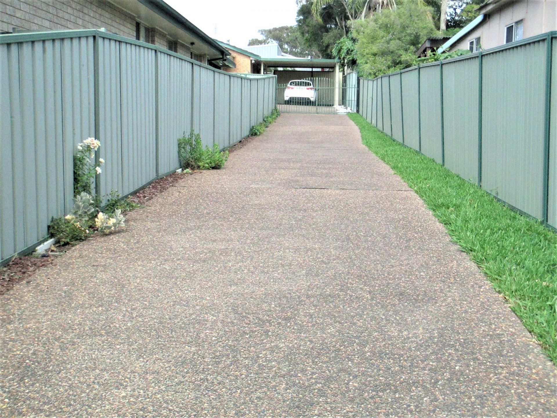 Carport (5.9m x 4.6m) for 1 car; and open space for a small car on pebblecrete at side of driveway.