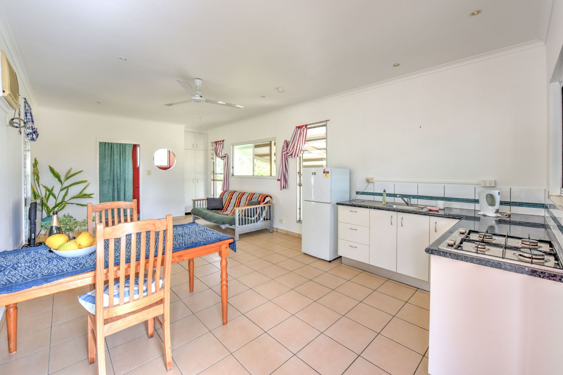 Large raised bedsit/cabin with a roofed veranda, deck and large cement patio, carport and yard, located in a quiet neighbourhood, next to bushland.
