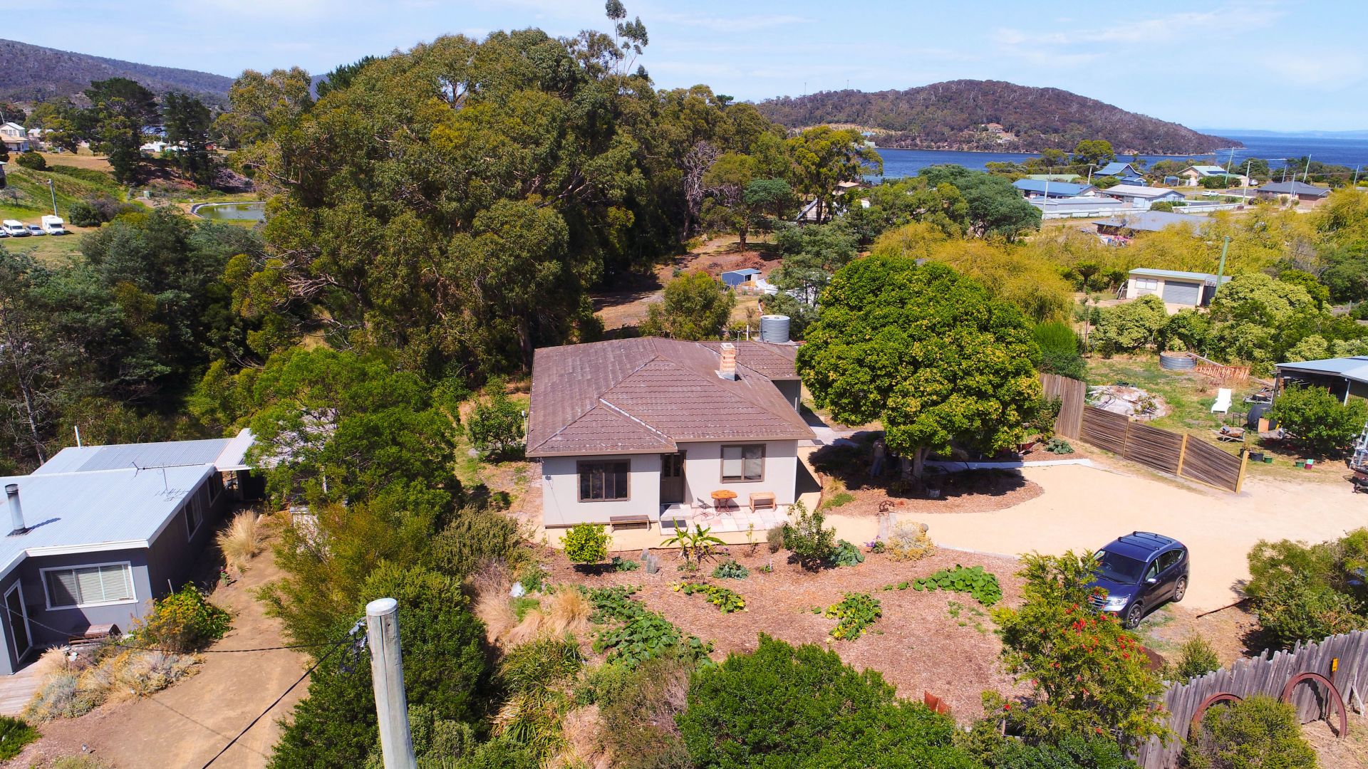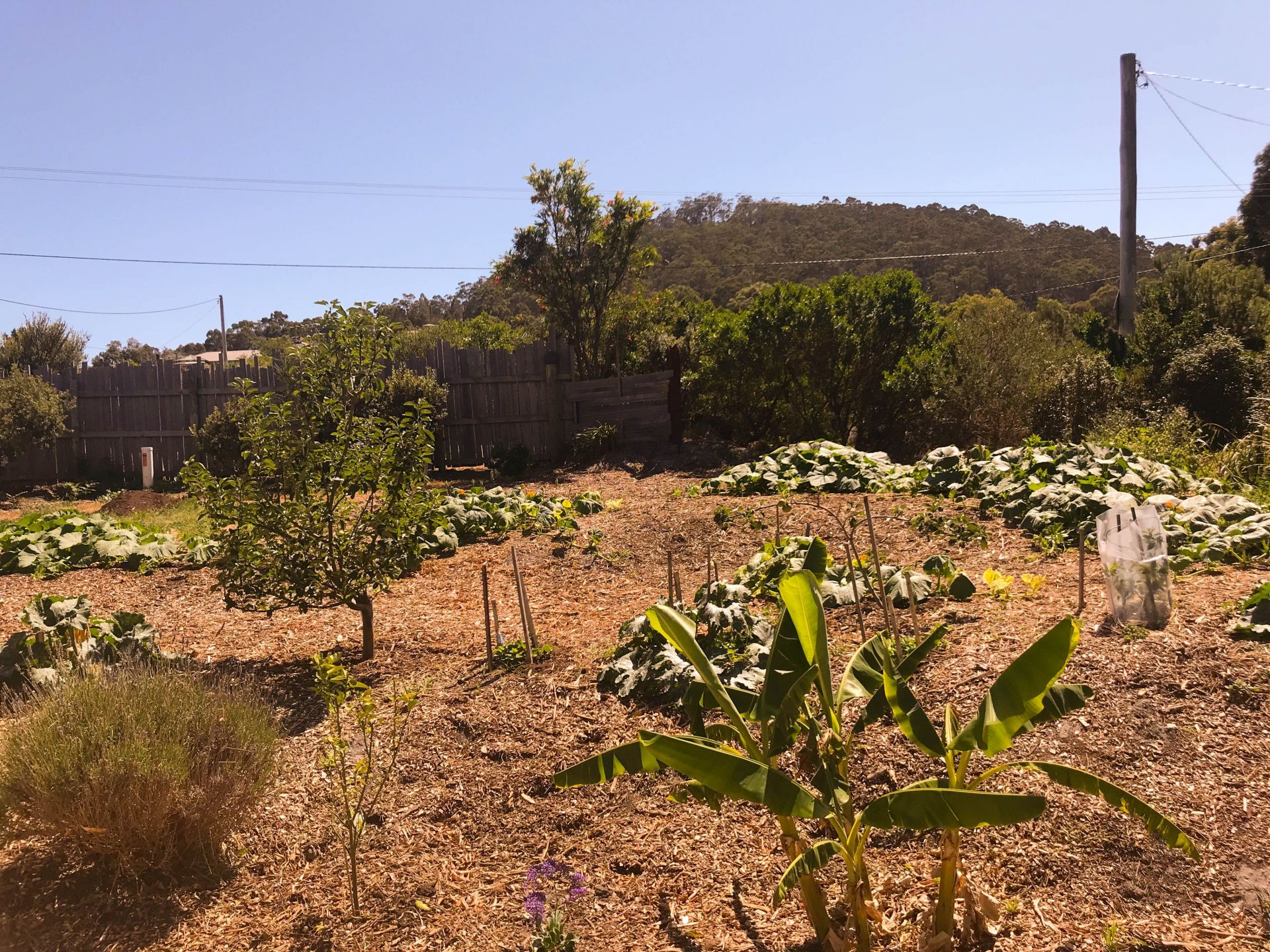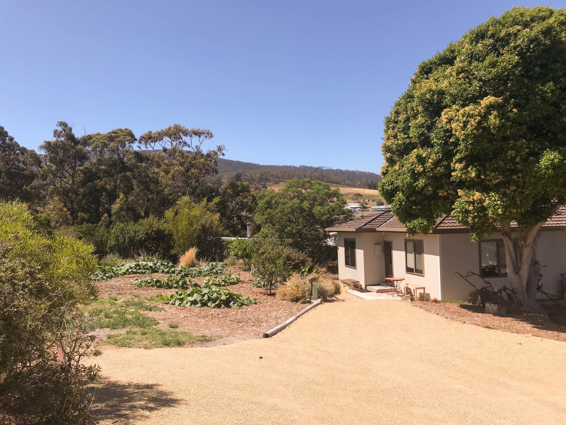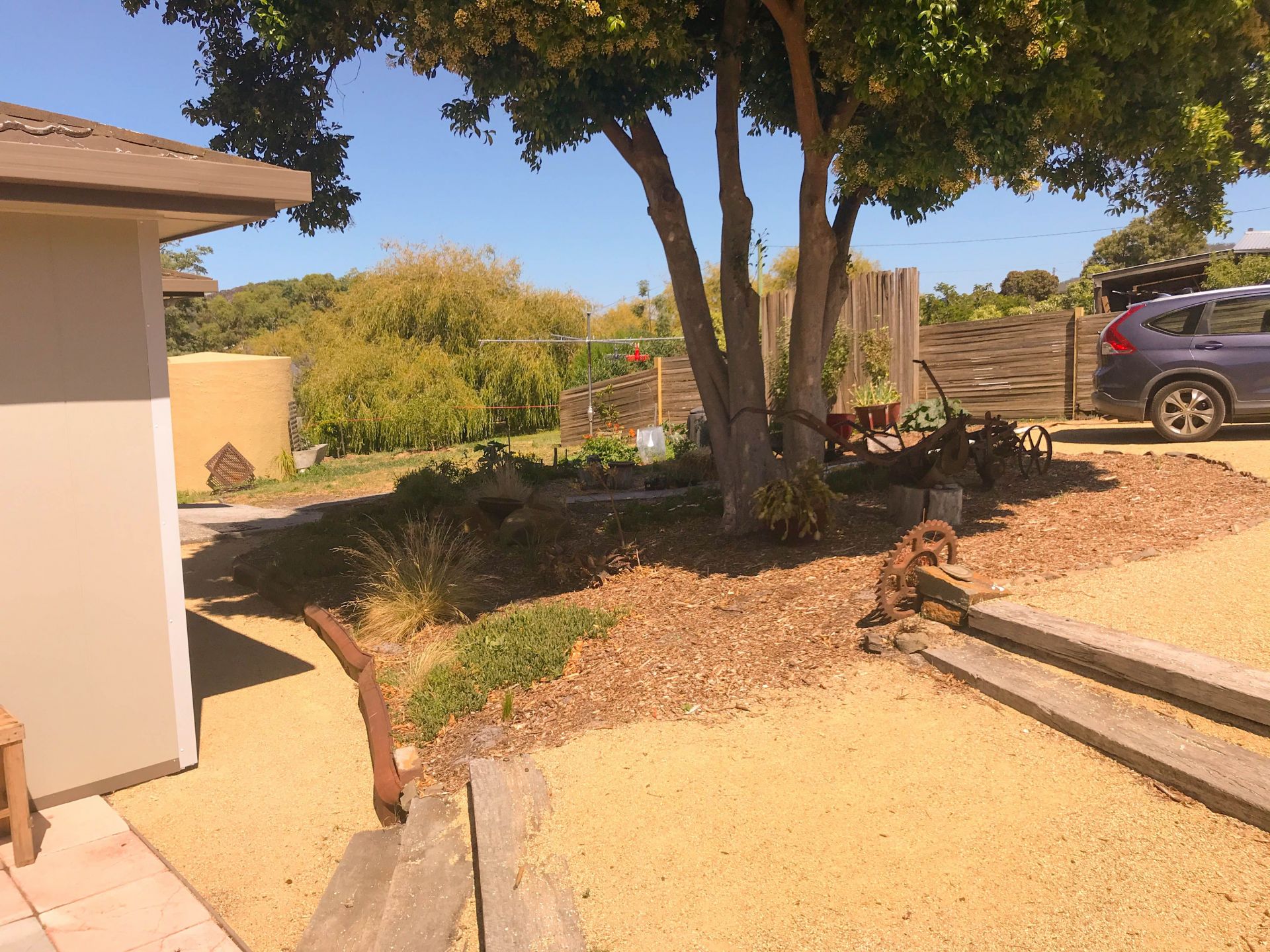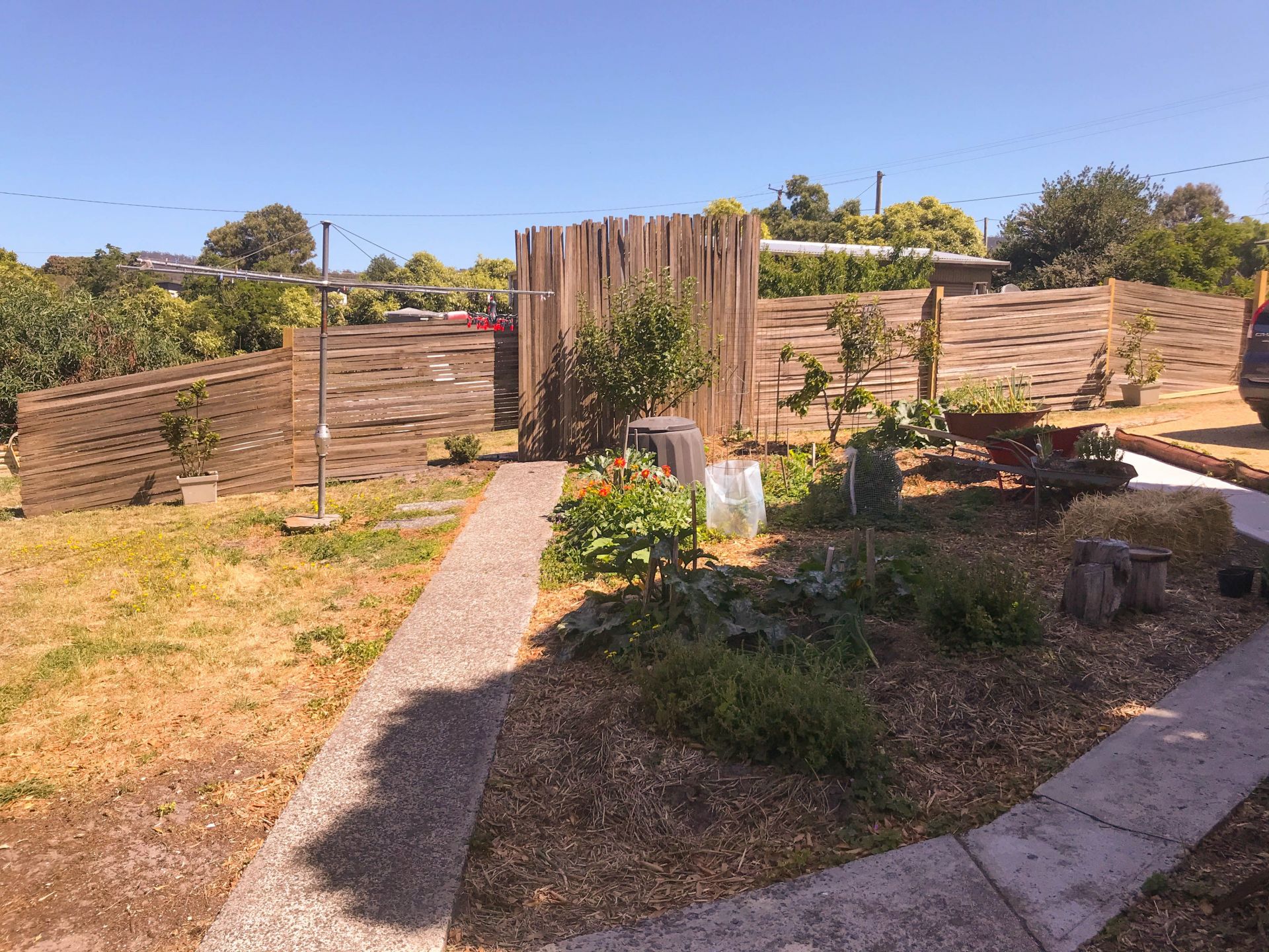- the yard has established fruit trees, vegetable gardens and shaded spaces