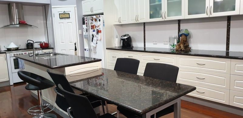 Kitchen features 5 burner gas cooktop with 900mm under bench oven, dishwasher, double plumbed in fridge recess, externally ducted range hood, abundance of cabinets & drawers, large walk-in pantry and gorgeous stone benchtops.