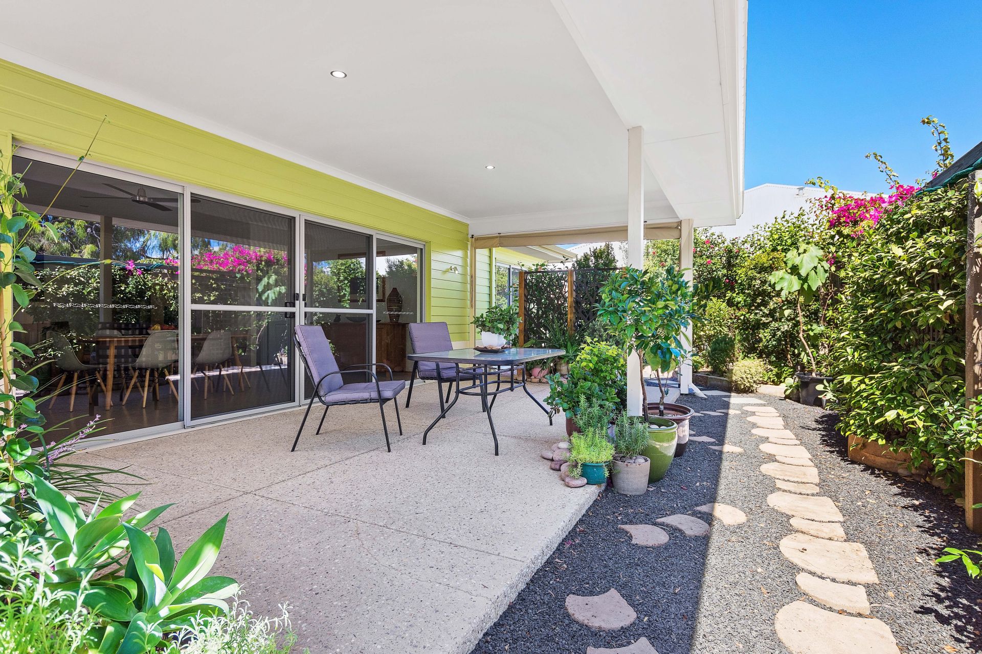 - Large open plan living (31c ceiling) looks out through 4 large sliding glass doors onto the generous aggregate concrete alfresco surrounded by lush green reticulated gardens