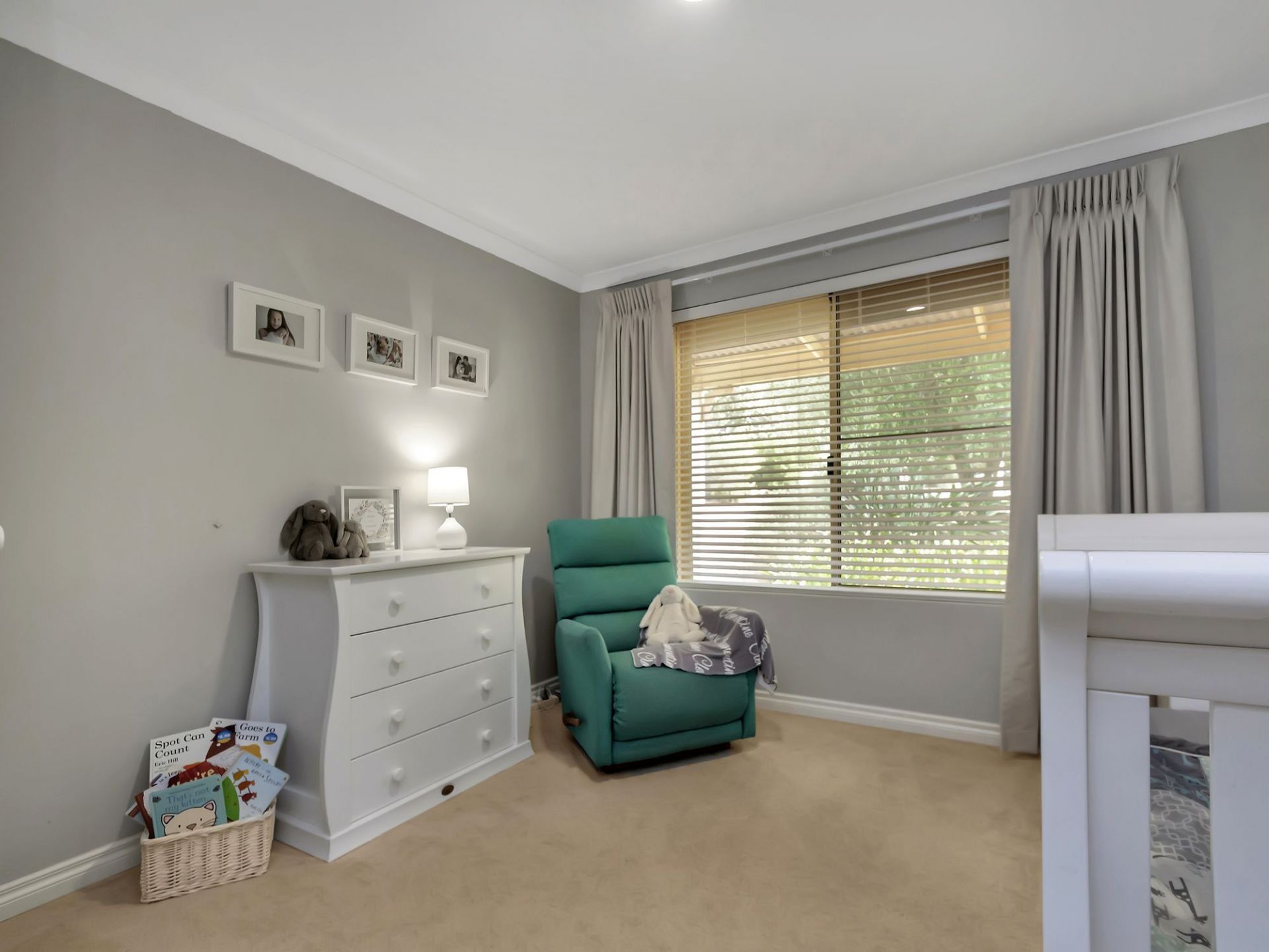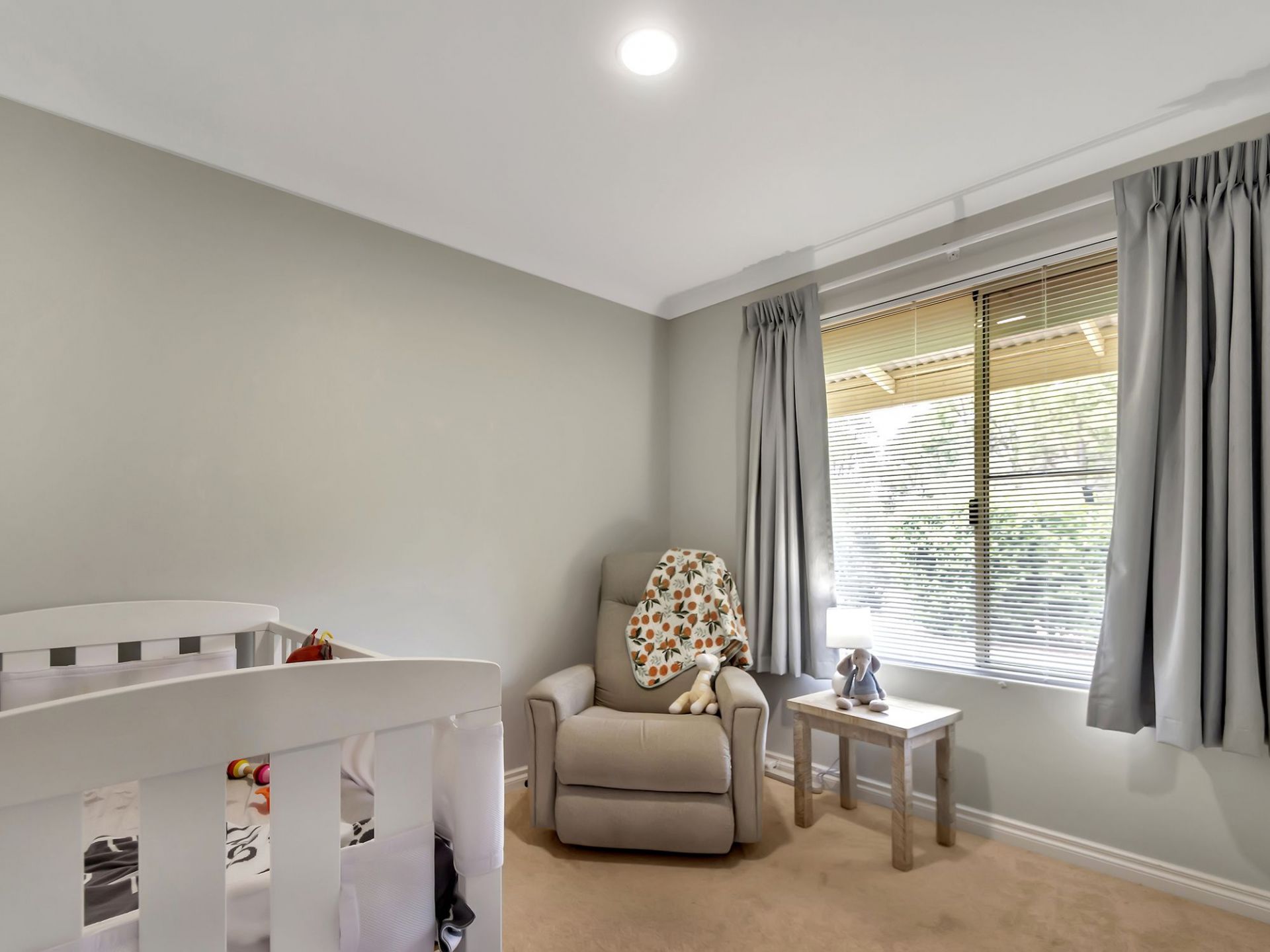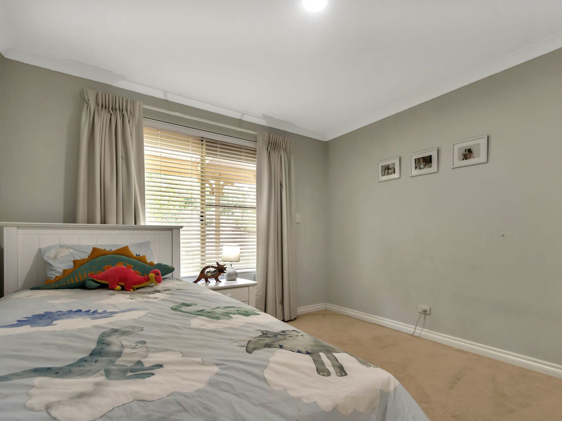 Neutral, sleek black-out curtains in all bedrooms