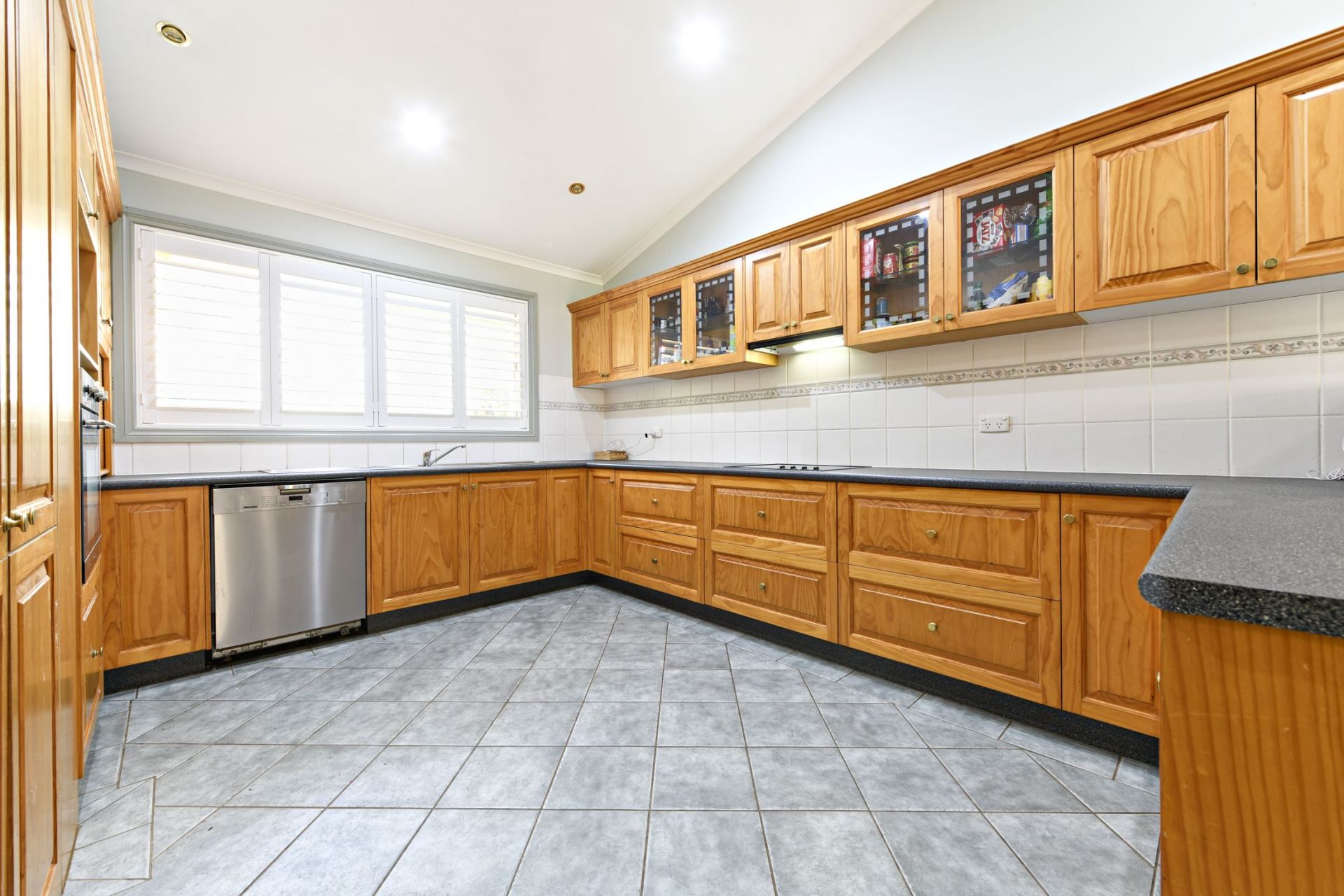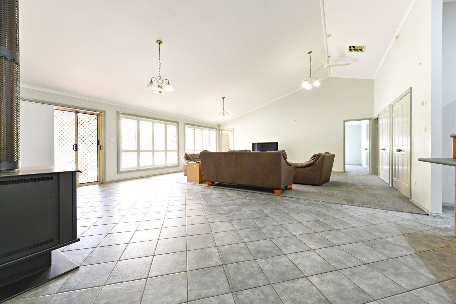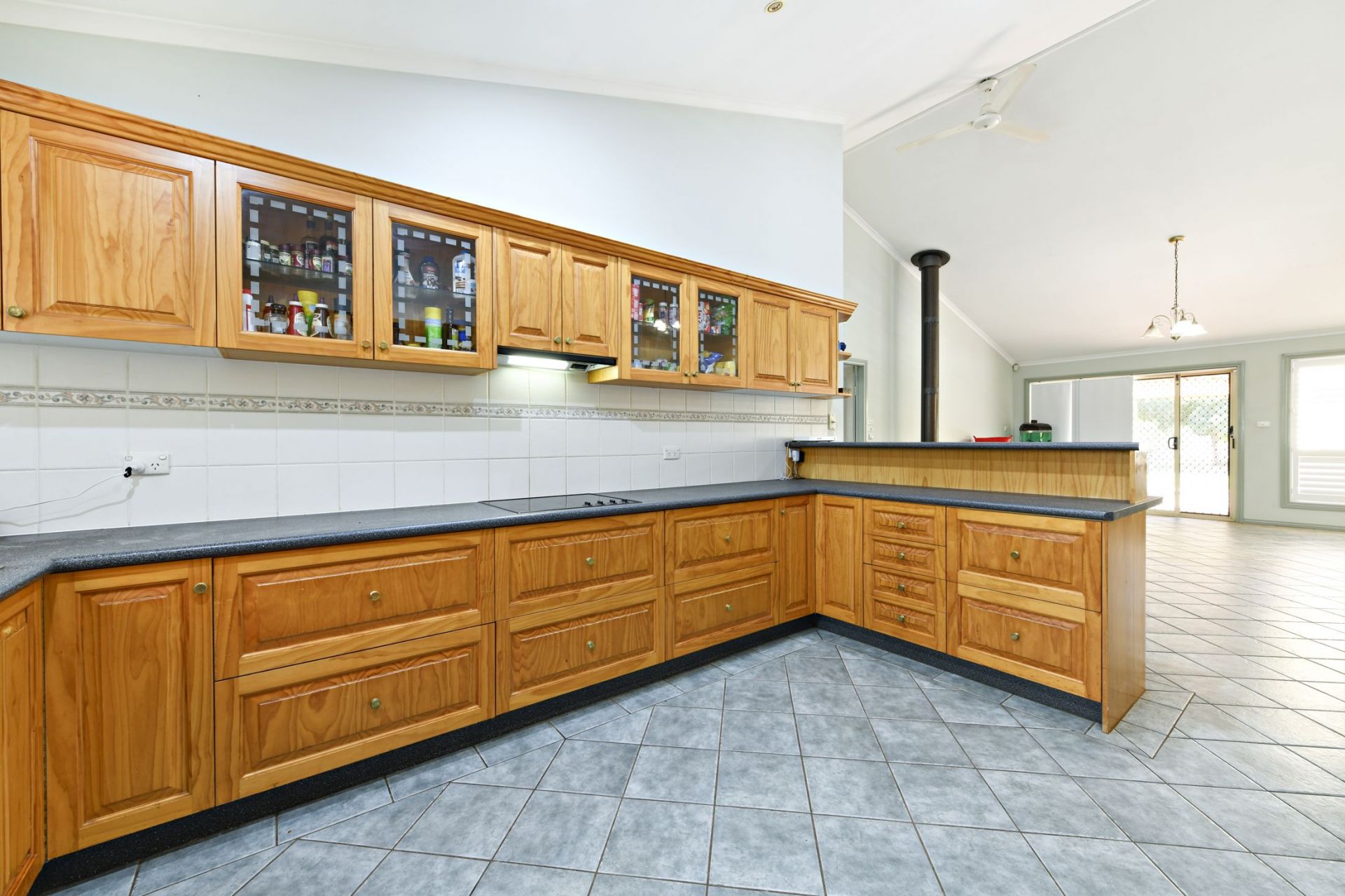 Open plan kitchen/living/dining area offering cathedral ceilings, ceiling fans, wood heating, ducted evaporative air-conditioning. The kitchen features timber cupboards, with overhead glass display cupboards, stainless steel dishwasher, electric cooktop, oven, range hood, breakfast bar, and a walk through pantry with loads of storage.