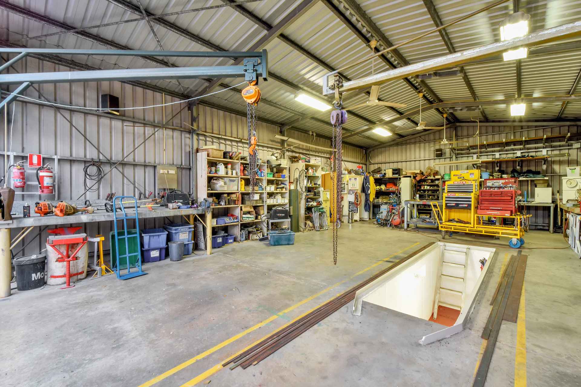Large lockable 8m x 12.2m powered shed with whirly birds and a mechanic's pit, with a 5.3m x 12.2m side covered verandah which will easily accommodate three vehicles. This verandah also has a large stainless steel wash trough and a 4m x 4m ablution block (separate double showers and bath and separate toilet) plus storeroom