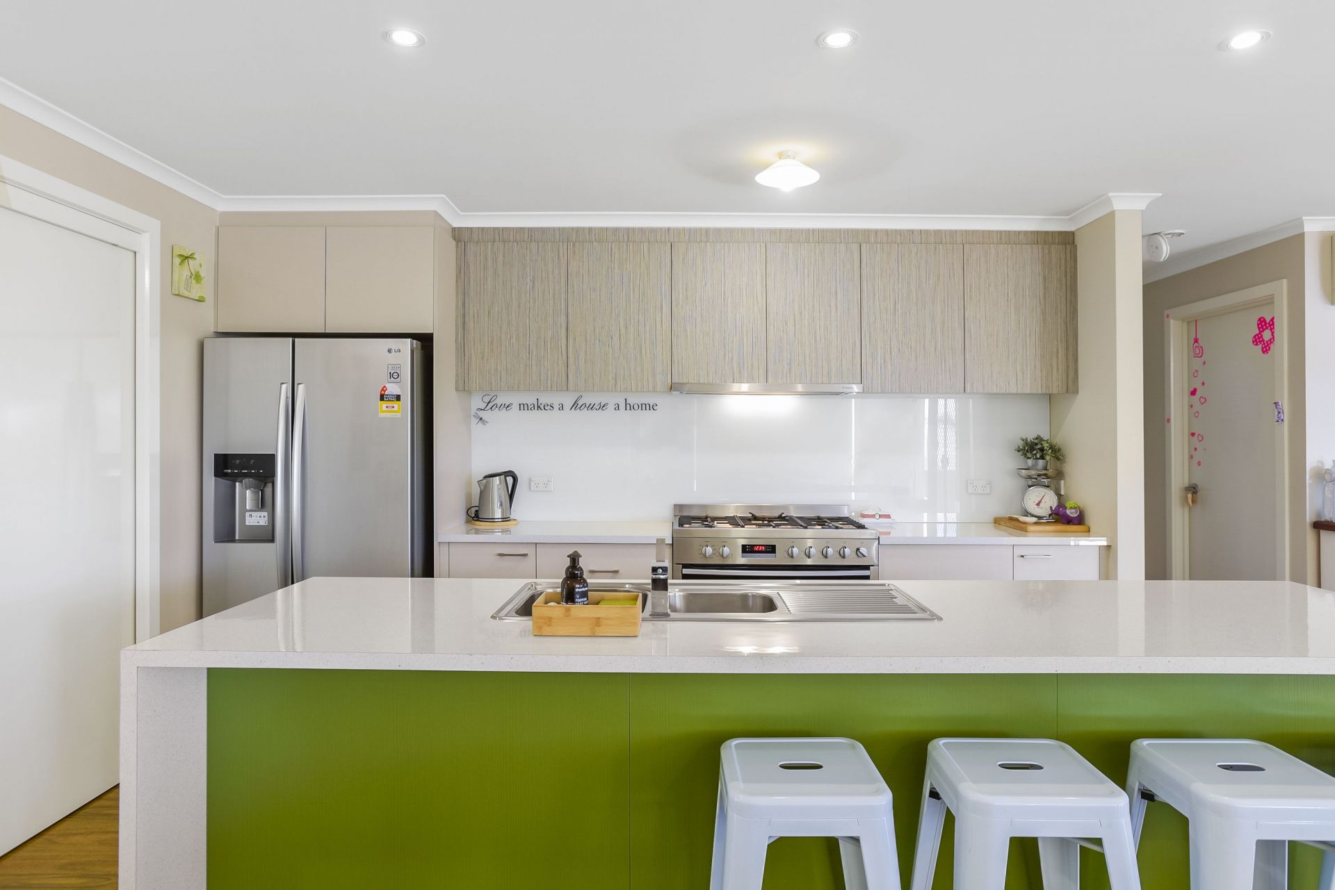 The kitchen is extremely generous with abundant cupboard & bench space, 900mm freestanding cooker (elec/gas), glass splash back and a walk through pantry.