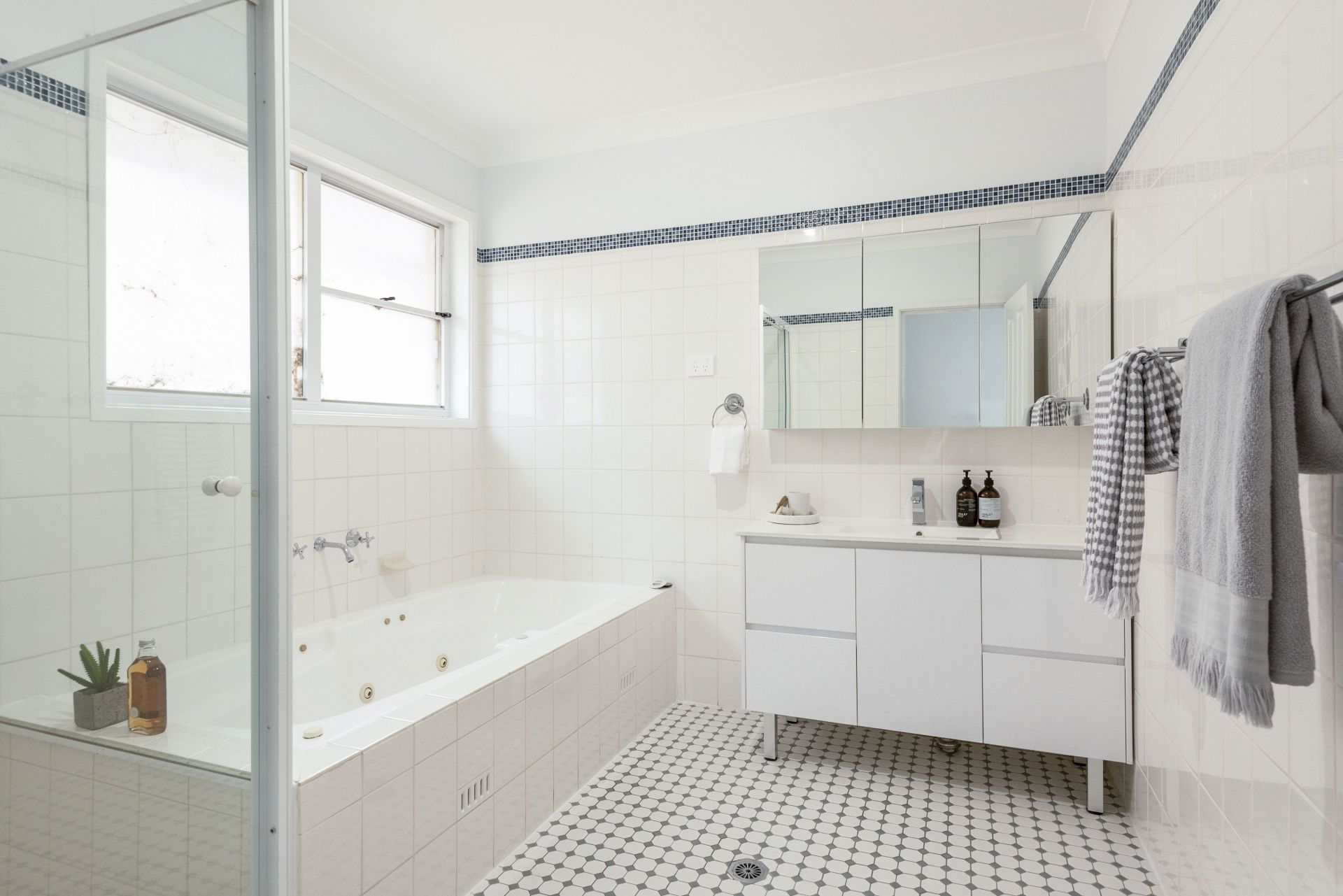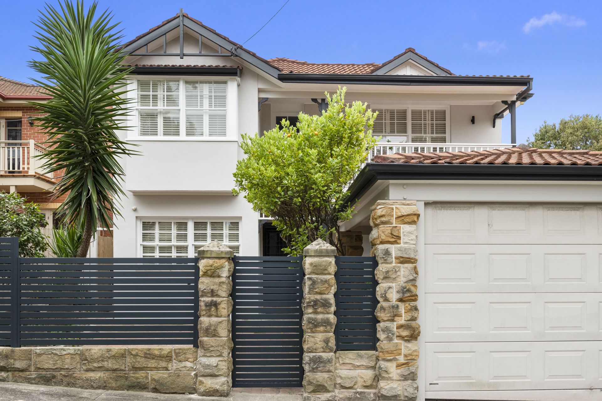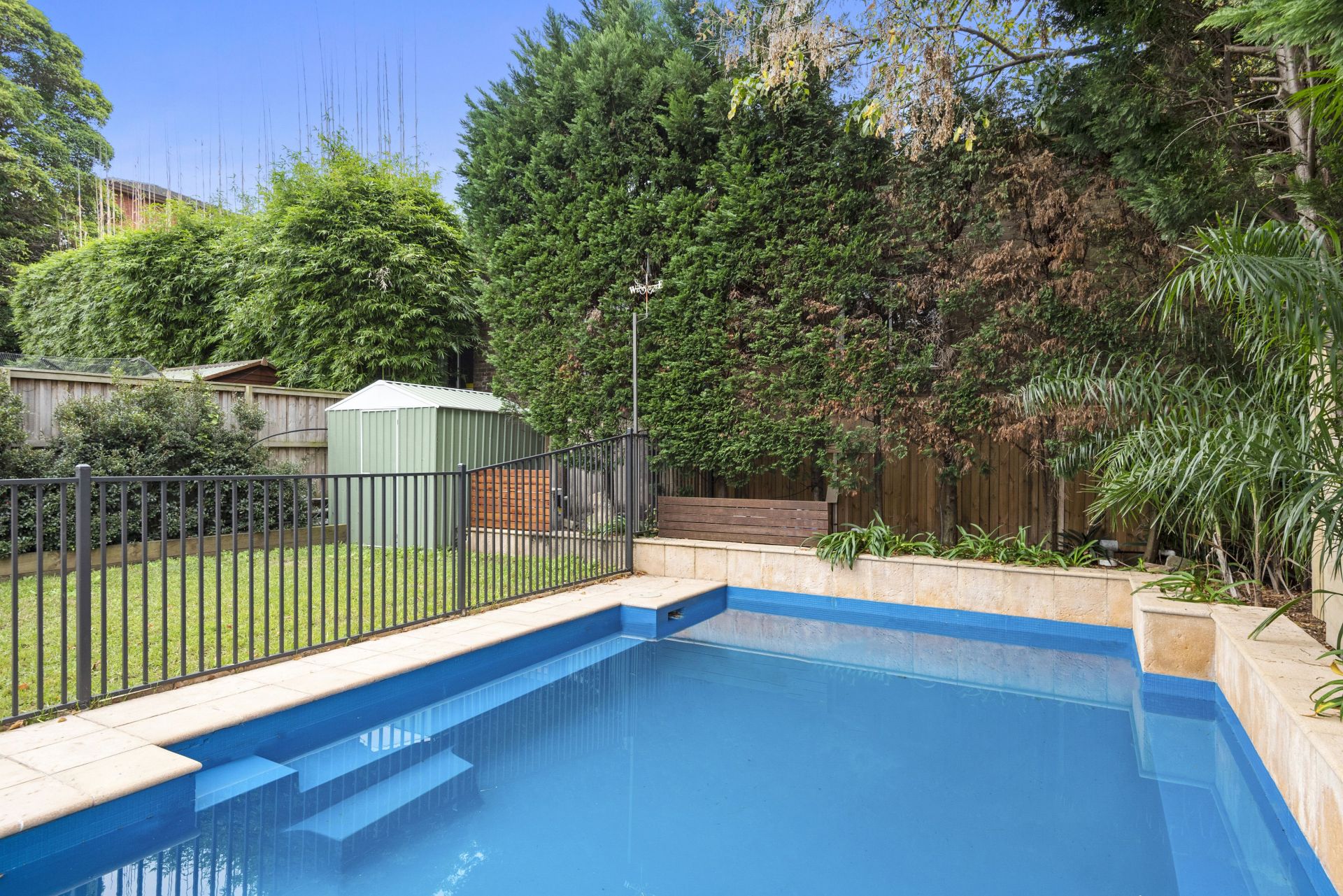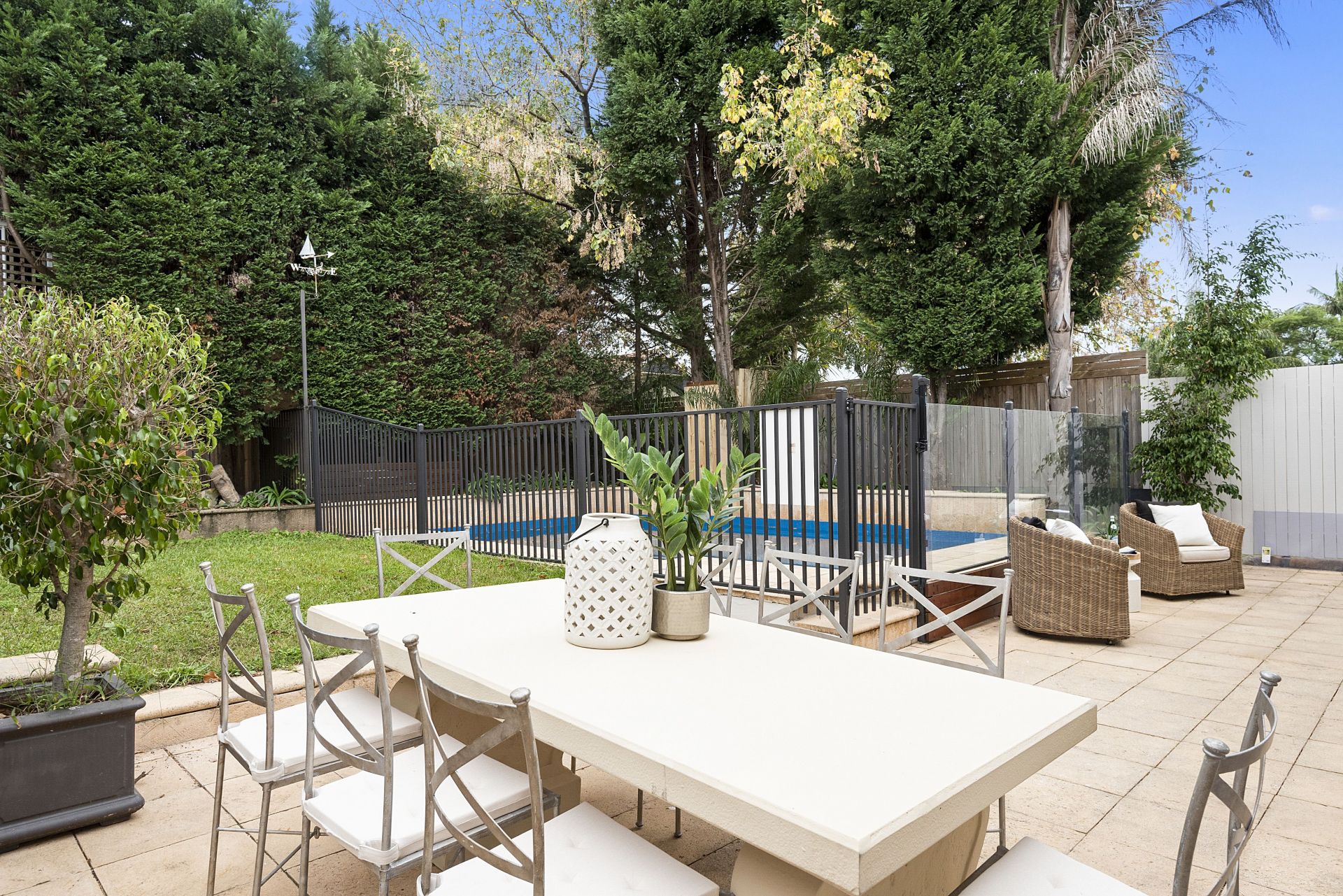 Sunlit backyard with paved and grass areas. Pool with glass balustrade fencing. Easy garden maintenance. Sunny private front courtyard. Carport with sandstone columns. Securely gated and suitable for pets.