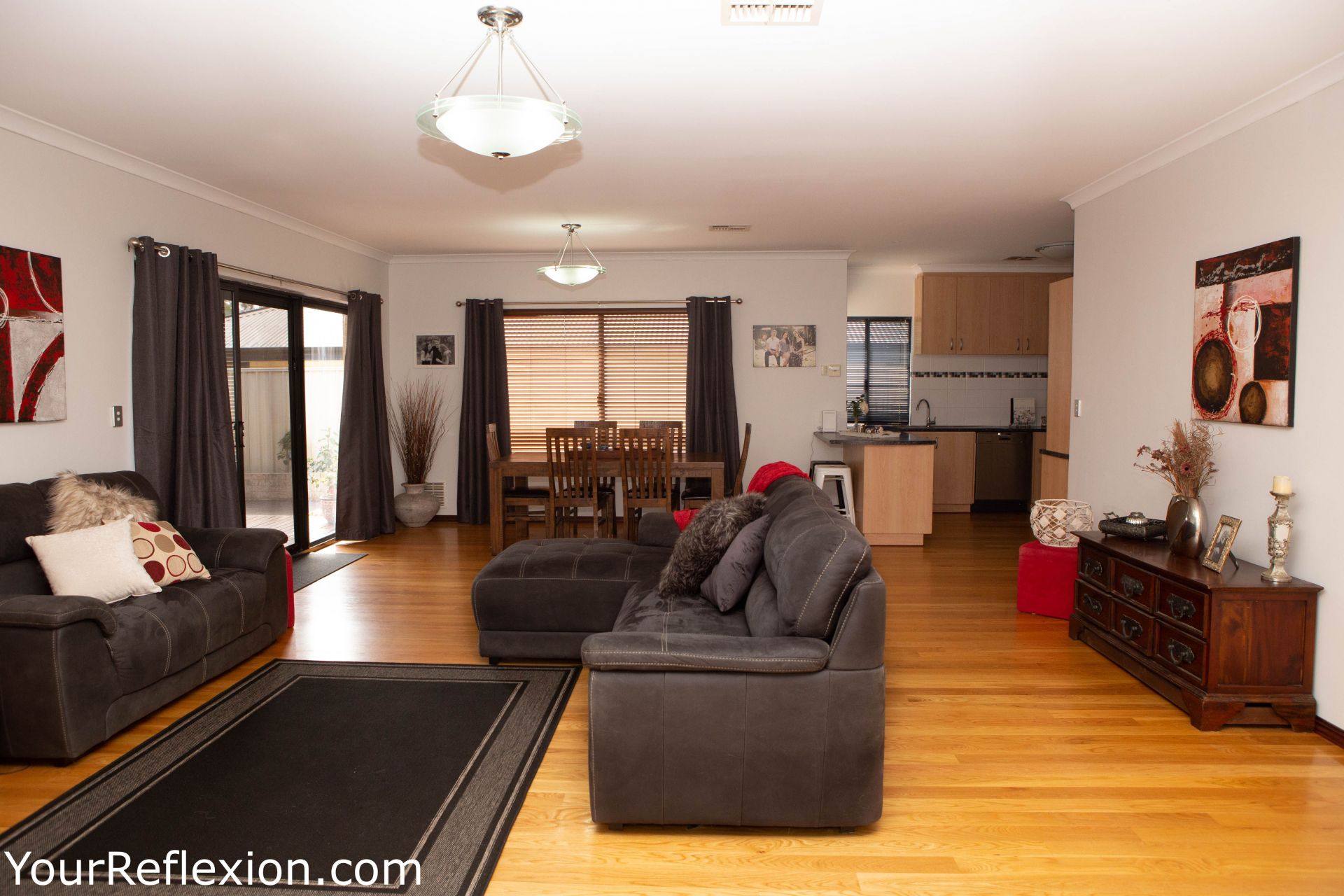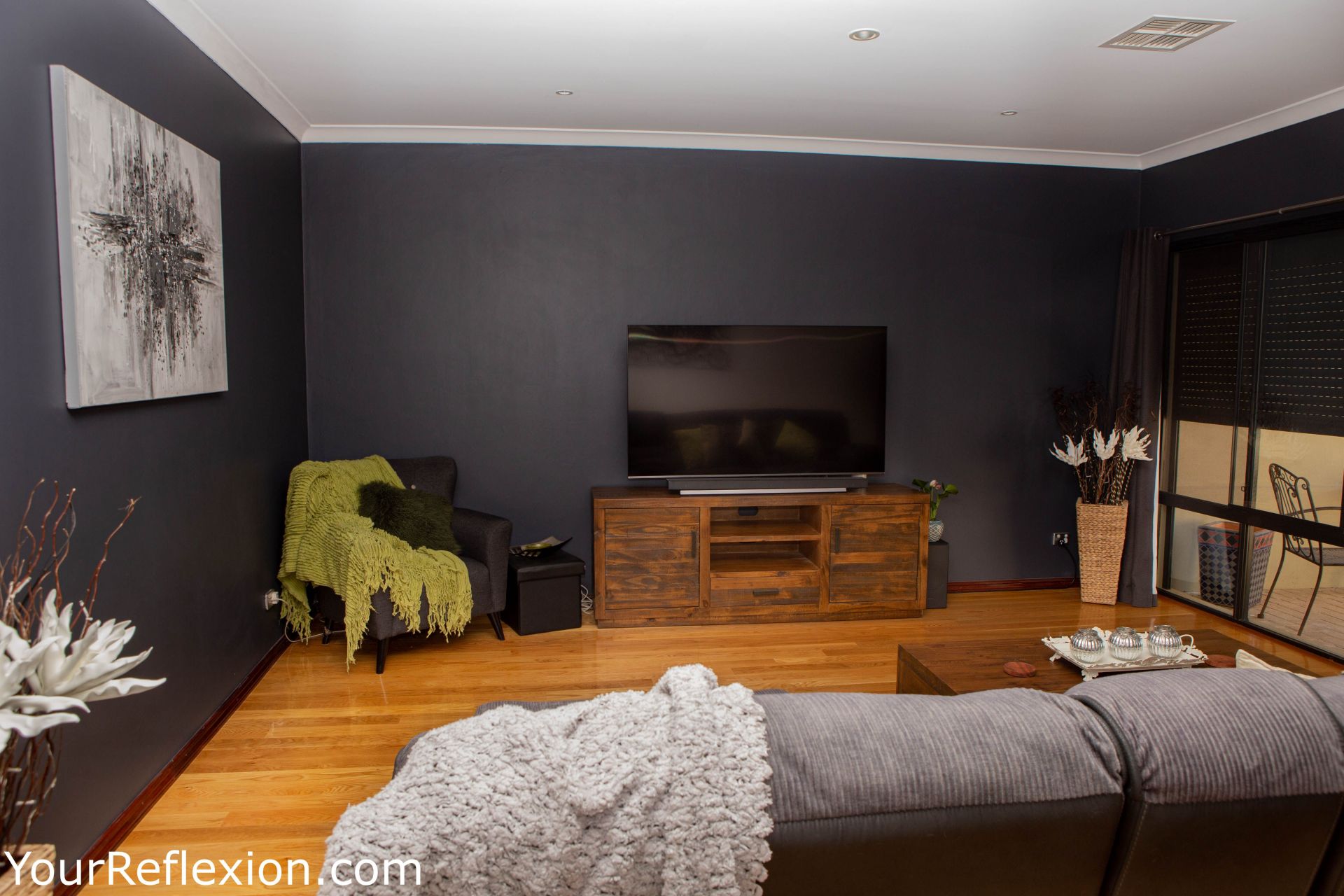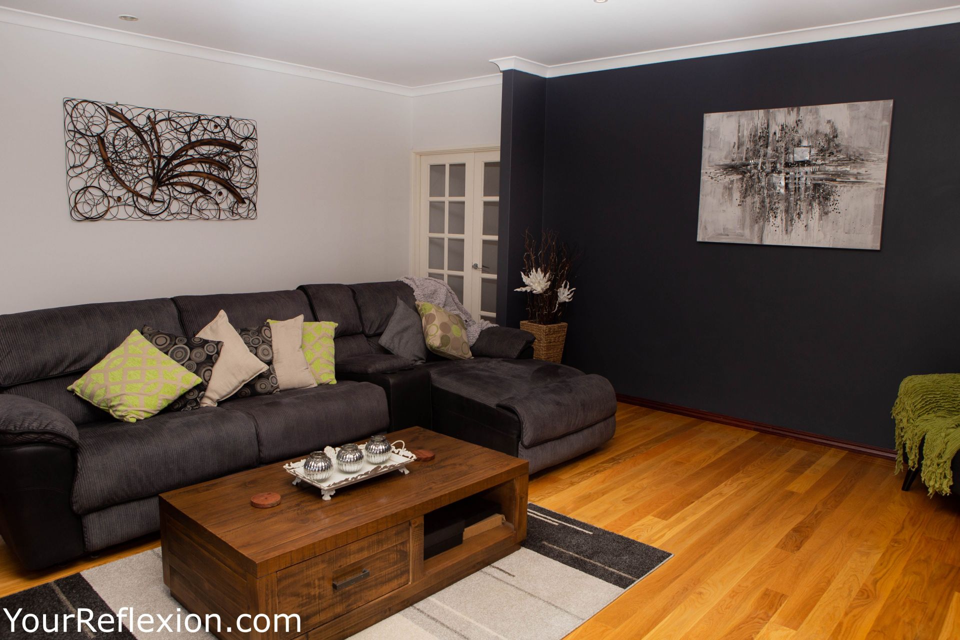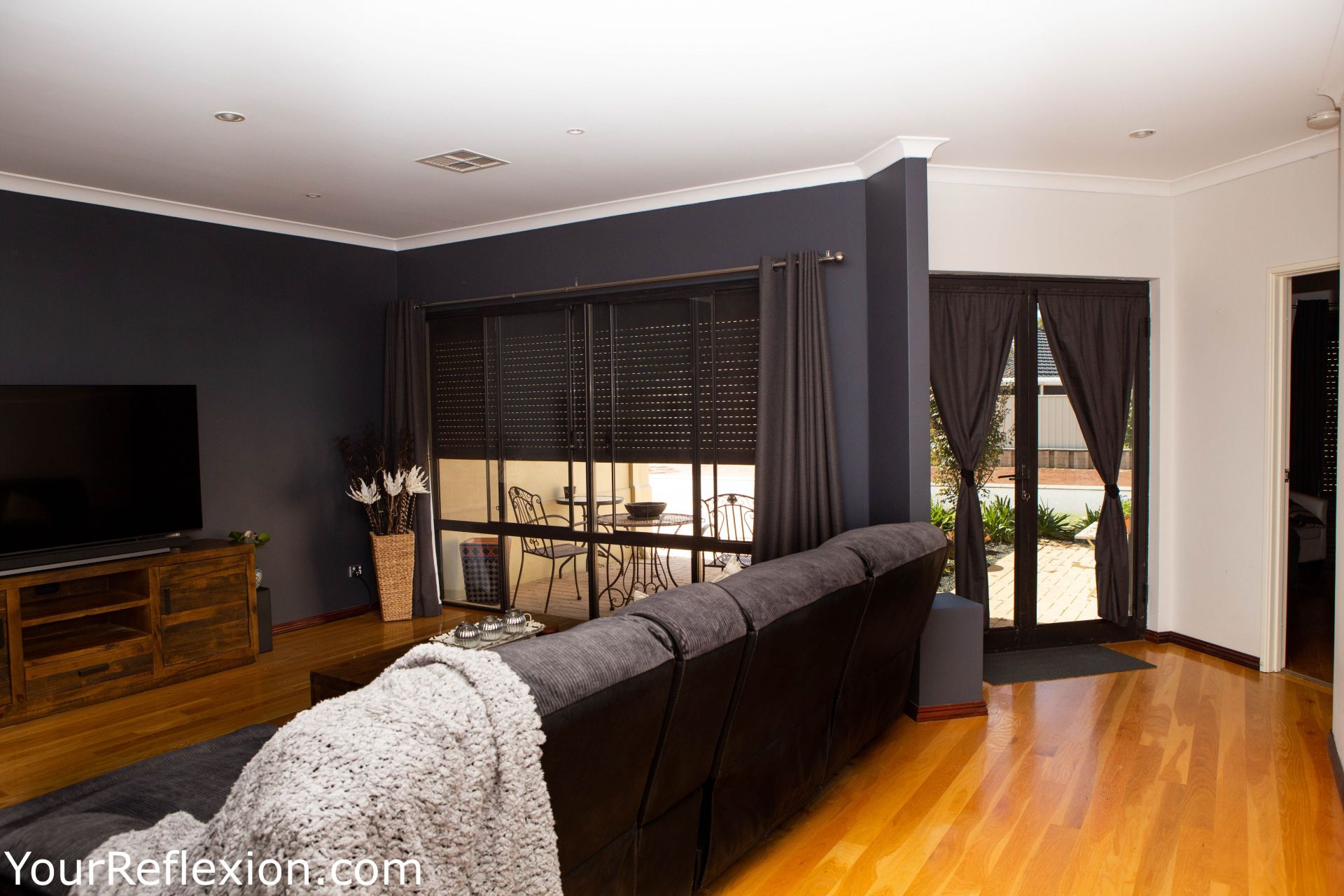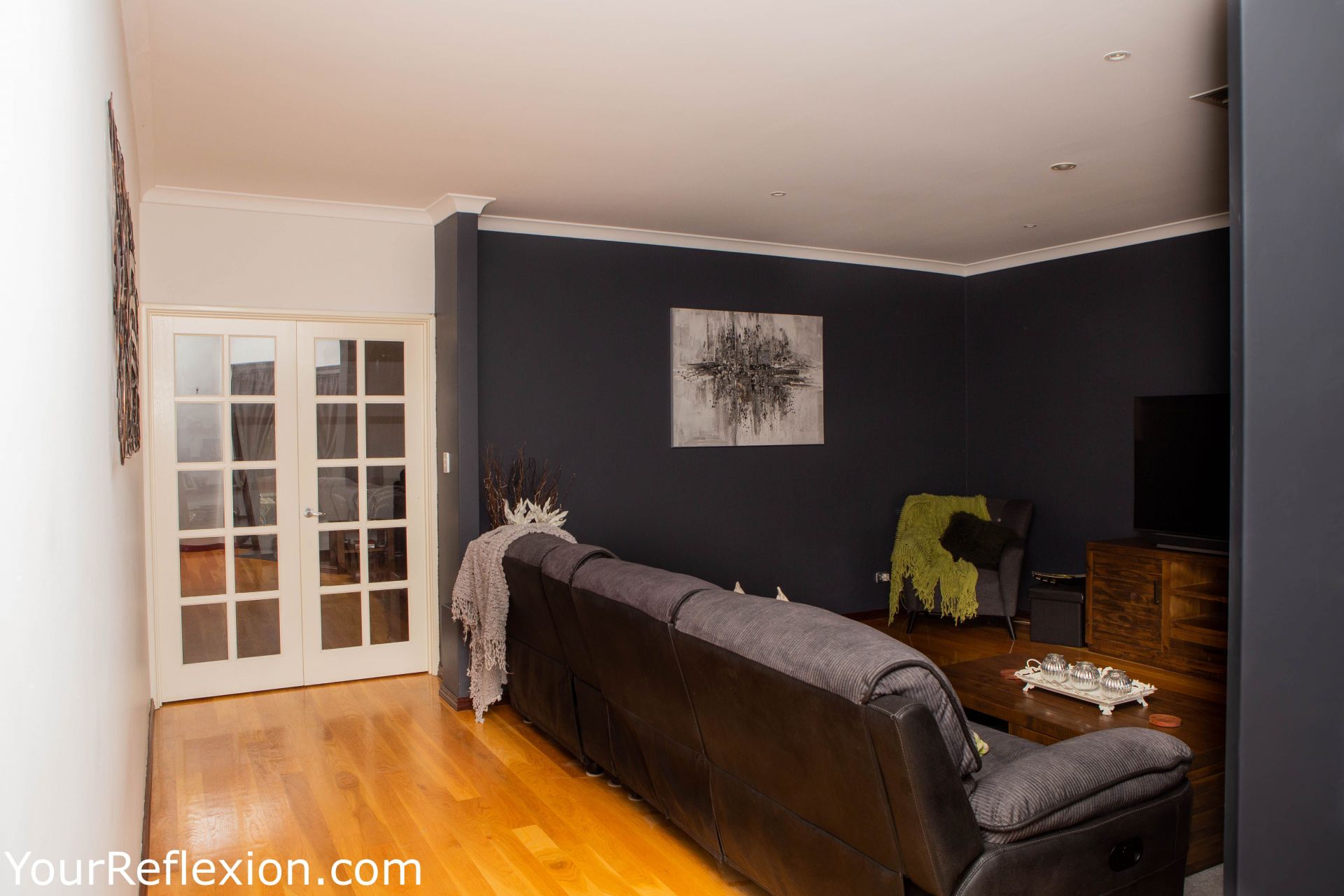 *Front Lounge turned theatre room freshly painted modern colours, to bring your movies to life. Double white French doors separating the lounge to the living area.