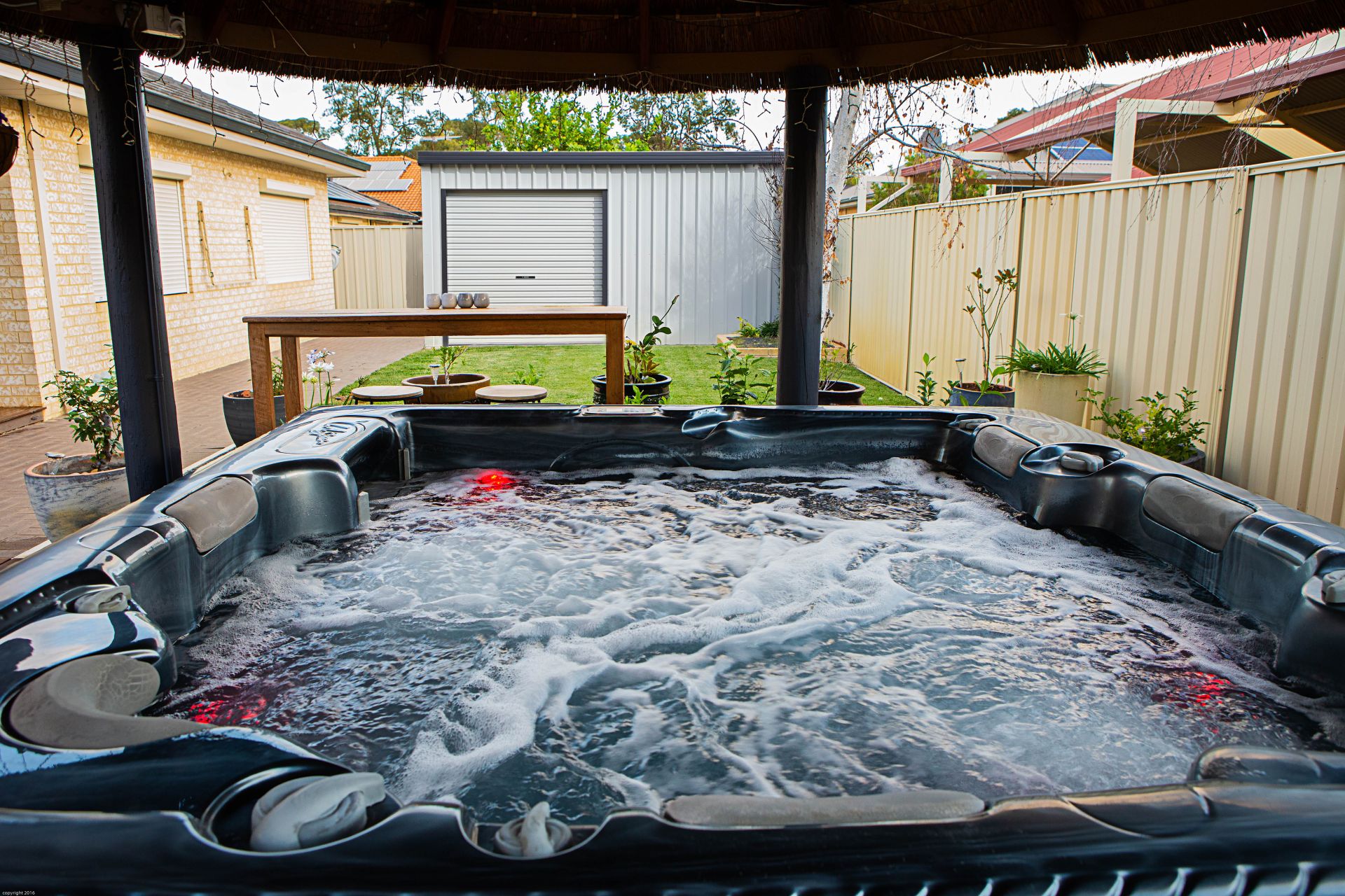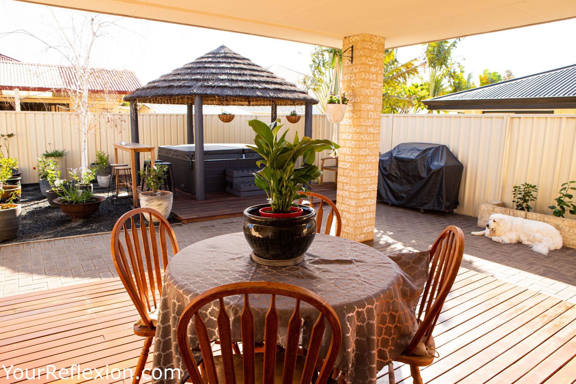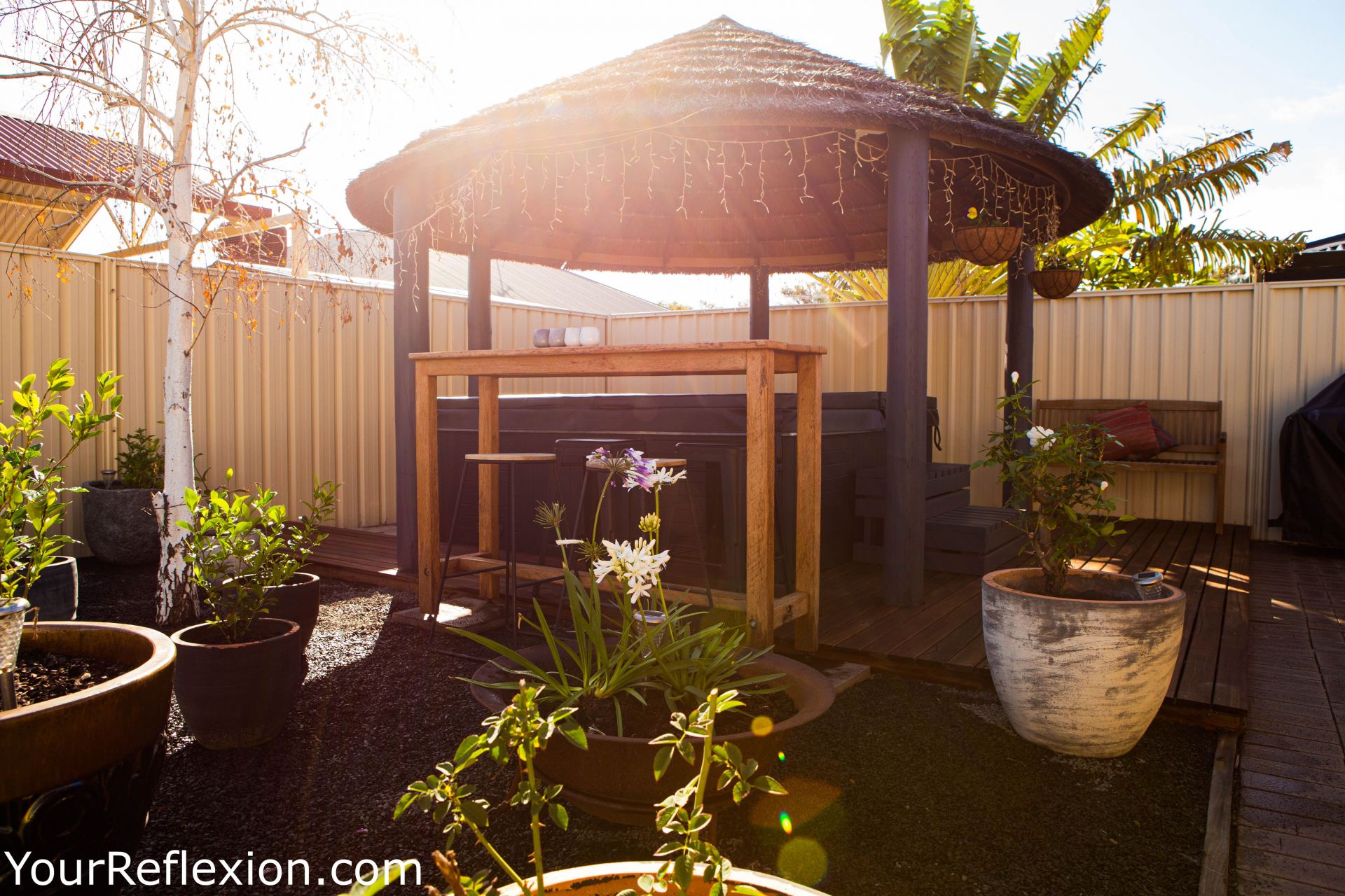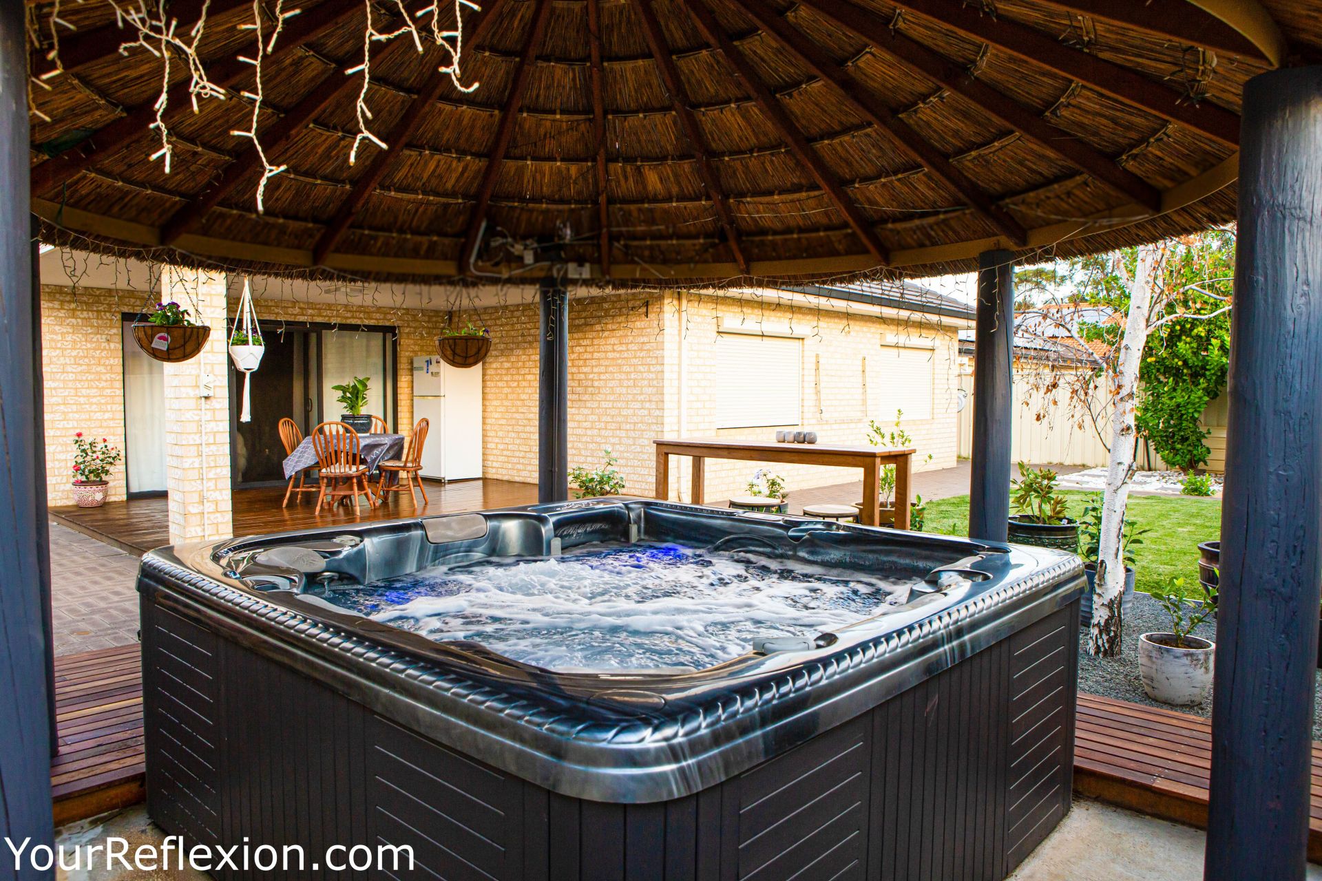 *Outdoor living with a decked alfresco area complete with jarrah decked heated spa and Bali Hut and huge sail for extra shade.