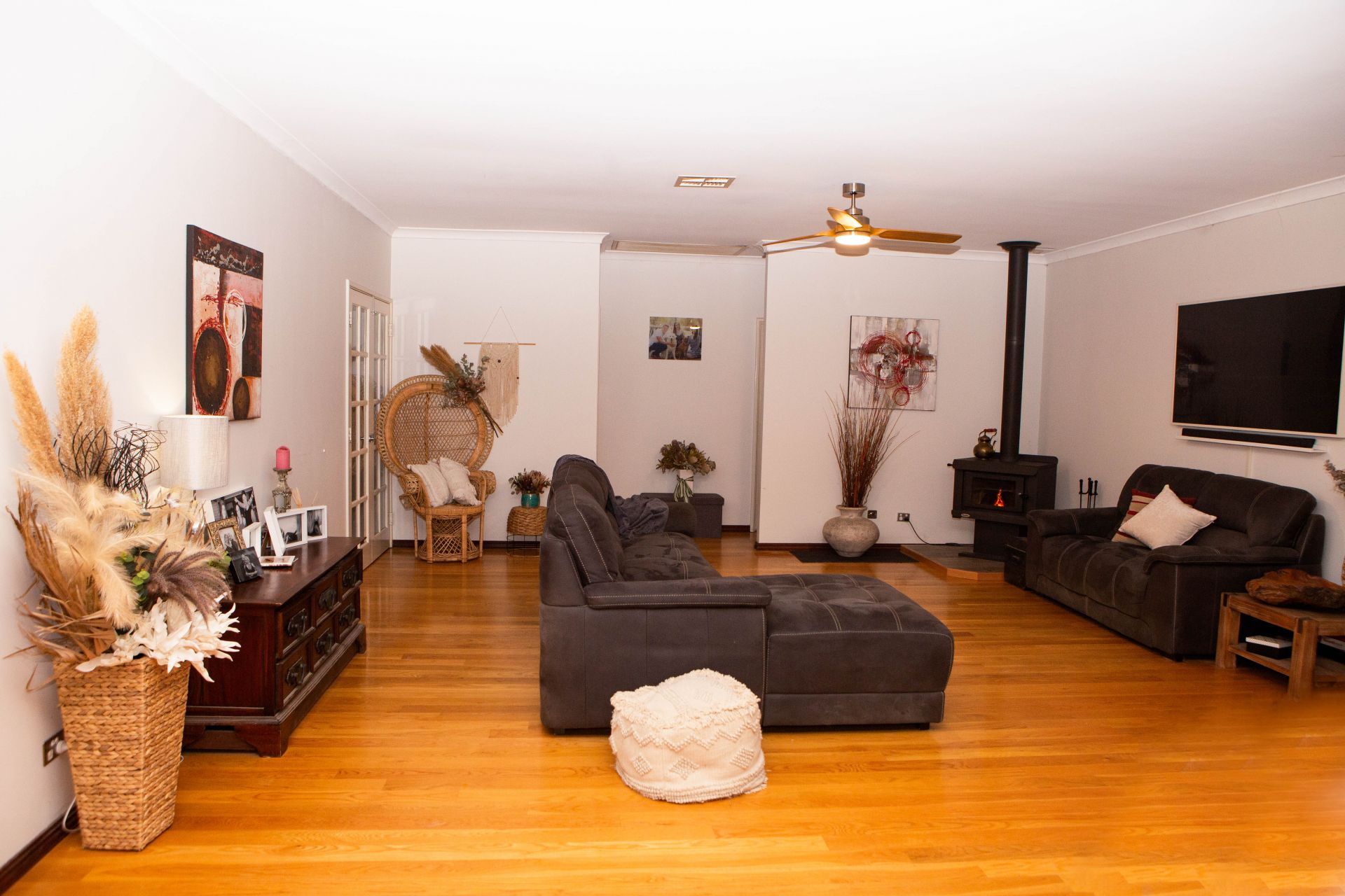 *Large family sized living area *Indulgent German Oak solid timber flooring (gloss finish) throughout the living areas and low allergy flooring to all bedrooms, ceiling fans throughout and new woodstove, living area windows tinted.