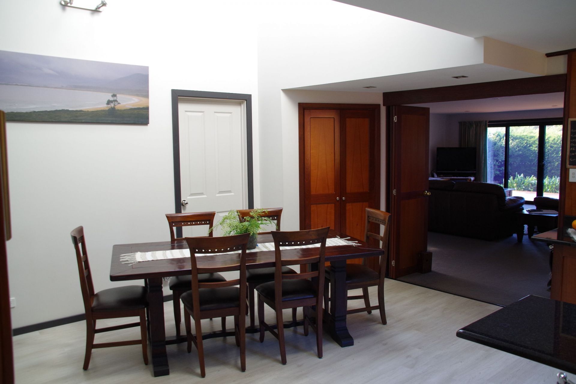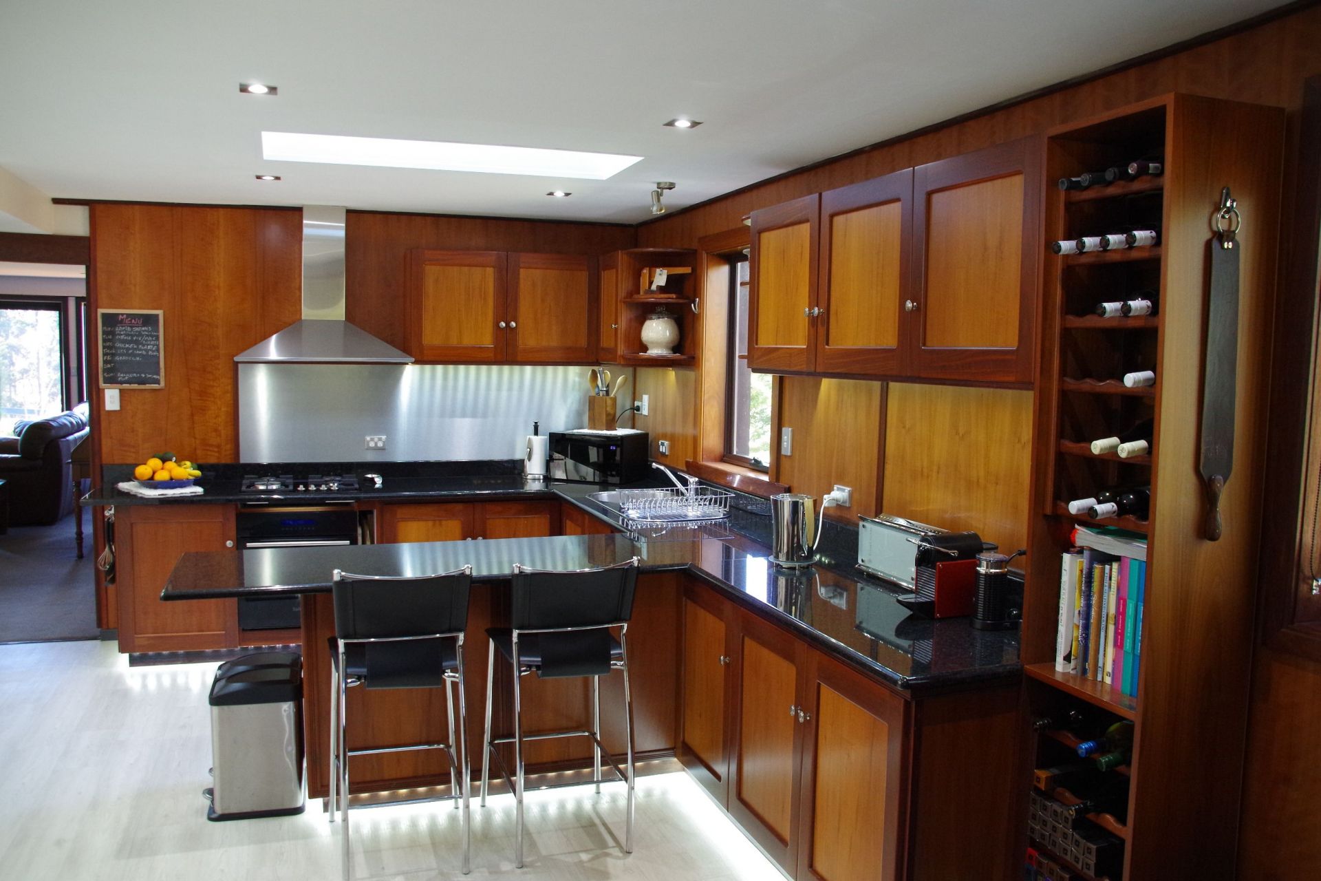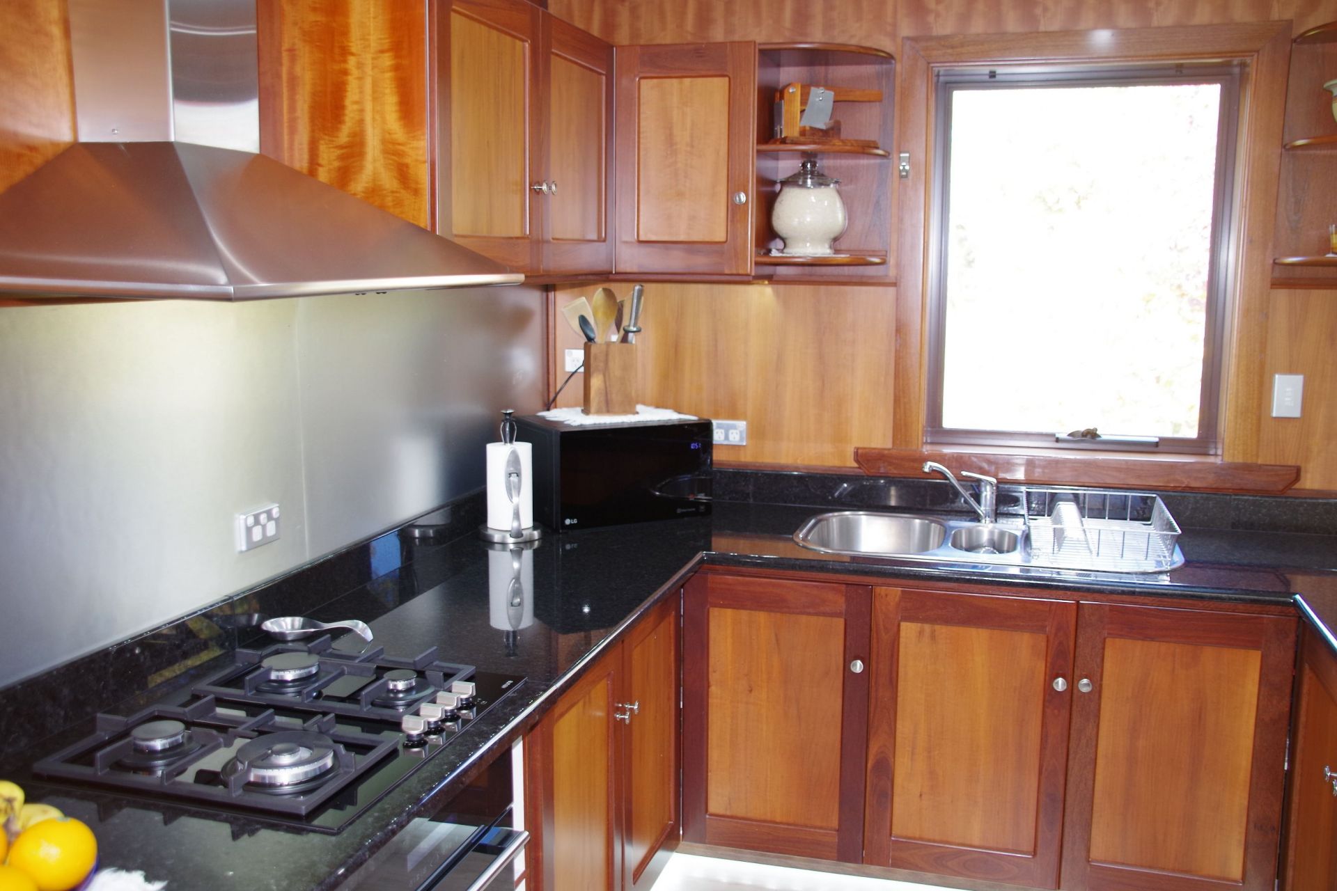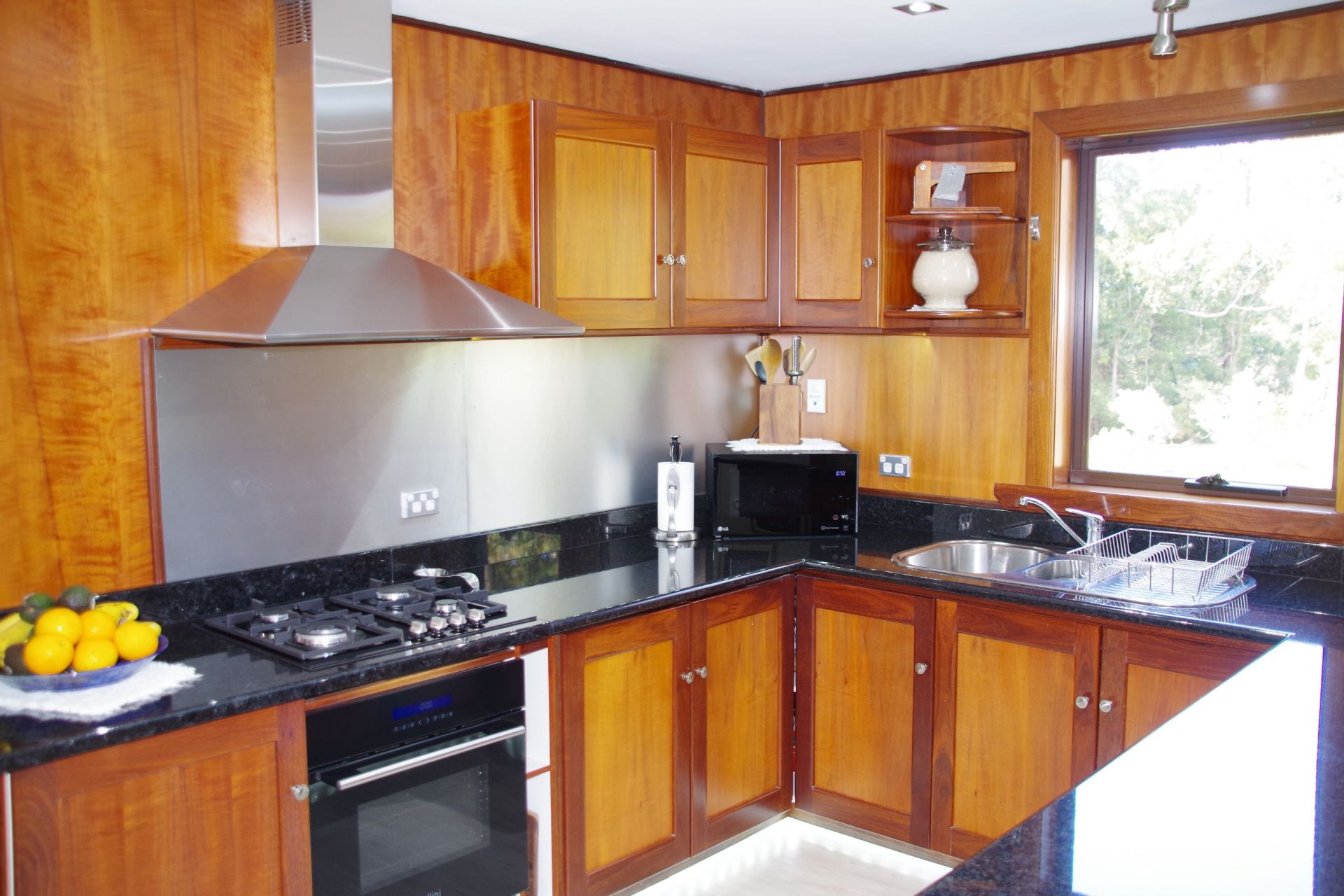 The large living room has generous sliding doors opening onto the ocean facing wooden deck. Heating is provided by a plumbed gas panel heater and heating/cooling from a reverse cycle air conditioner. Leading through timber Bi fold doors into a light filled kitchen and dining room. The dining room section has a double height, vaulted cathedral ceiling with a large sky light. The kitchen has granite bench tops fitted to custom crafted solid timber cabinets and incorporates a modern ceramic gas cook top with a under counter electric oven. This area is fitted with a skylight providing abundant natural light as well as under counter LED string lights, illuminating the work surfaces and the cabinet surrounds.