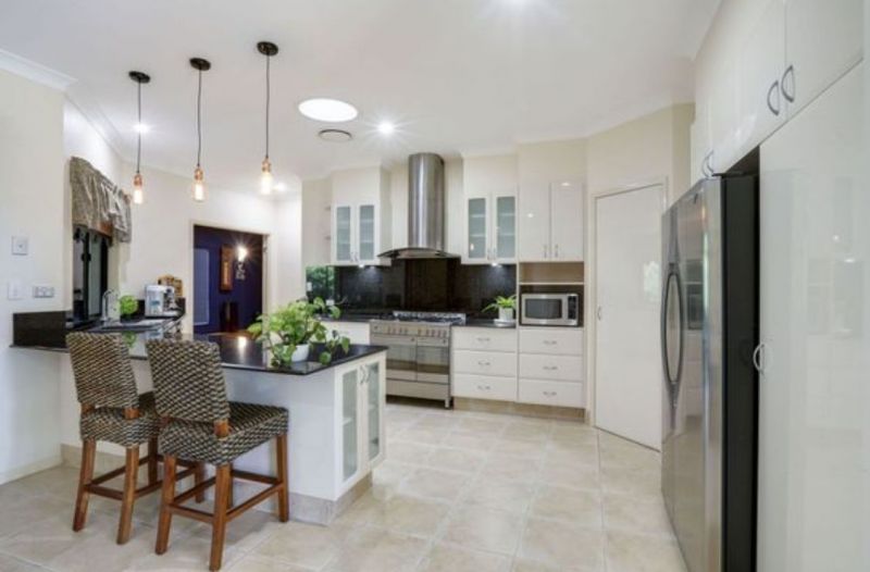 Gourmet Kitchen, black granite benches with 3 bench pendants, black granite bench either side of stove, Delonghi freestanding stove /2 ovens, natural gas top and electric ovens. Long flute, stainless steel exhaust fan. Corner display cupboard, 3 display cupboards, overhead cupboards, 18 large draws, 4 med size draws, large double door under sink, double draw Fisher&Paykel dishwasher. Stone sink with food waste disposer. Kitchen servery to closed in alfresco area. Shelf for microwave, walk-in pantry with 5 shelves, double fridge freezer space, large cupboard 4 shelves and a built-in wine rack. 2 skylights -1 in kitchen area and 1 in entry area. 2 corner niches in entry, double solid Merbau entry doors with black wrought iron handles.