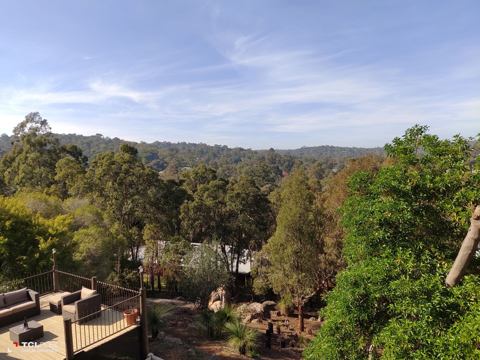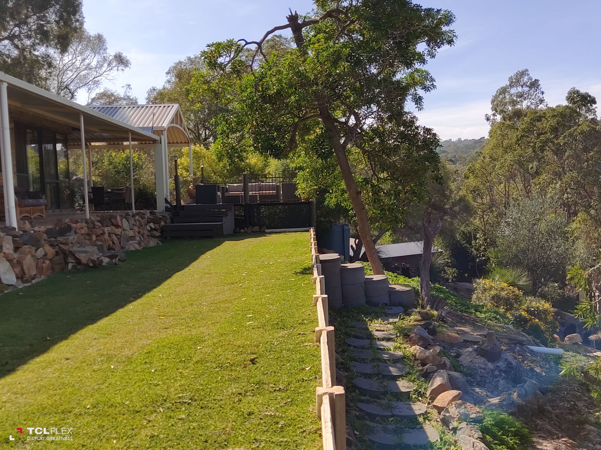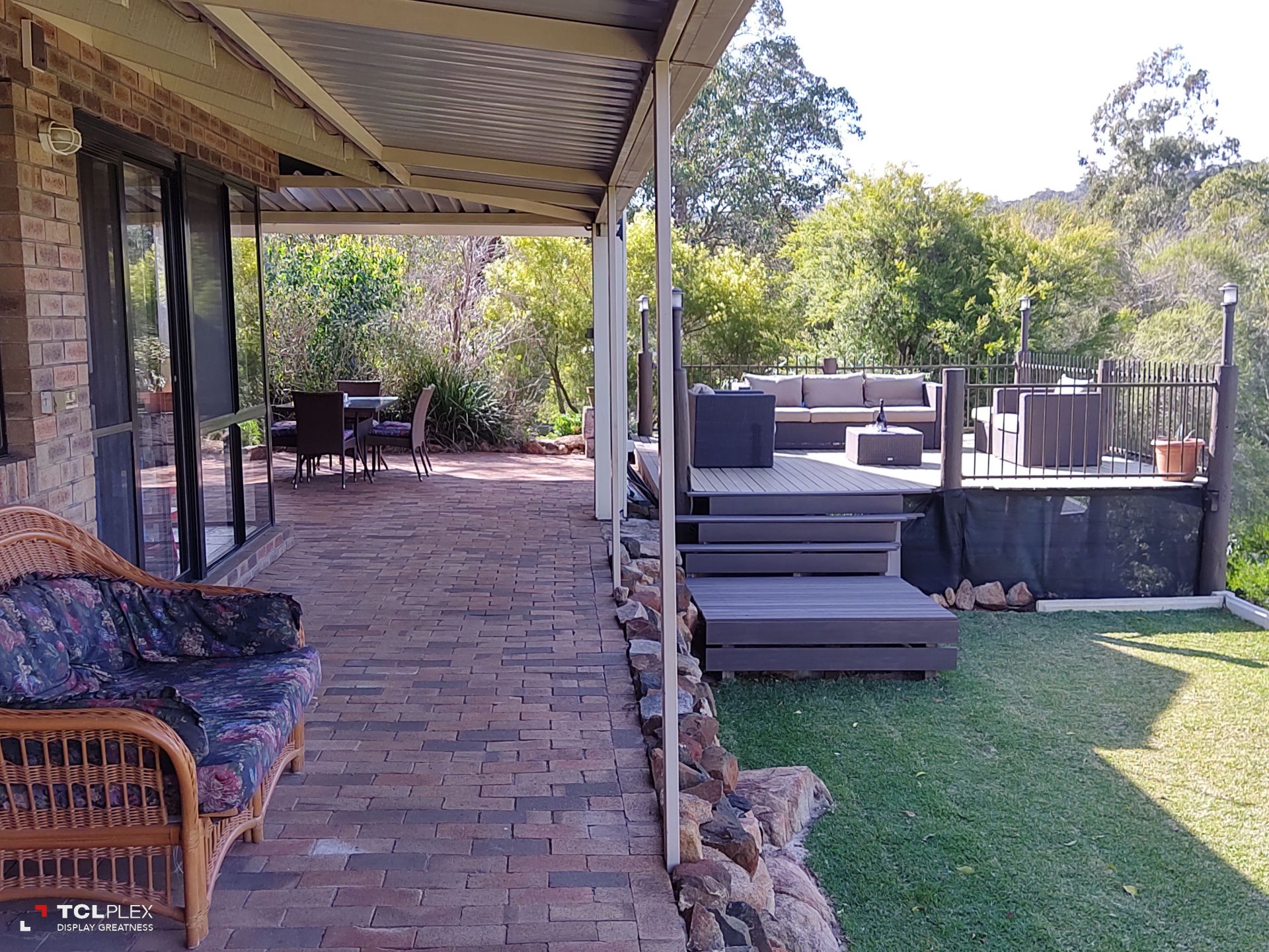 • Large patio entertaining area leading to elevated wooden deck with amazing valley views