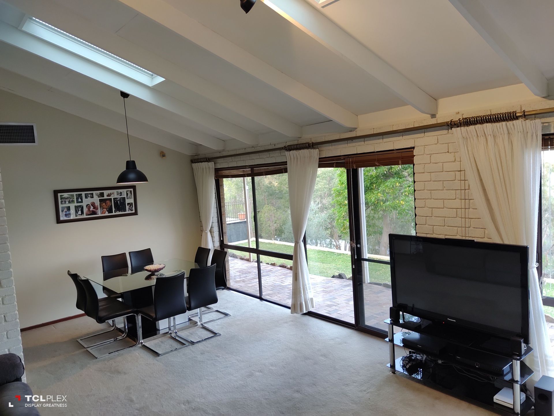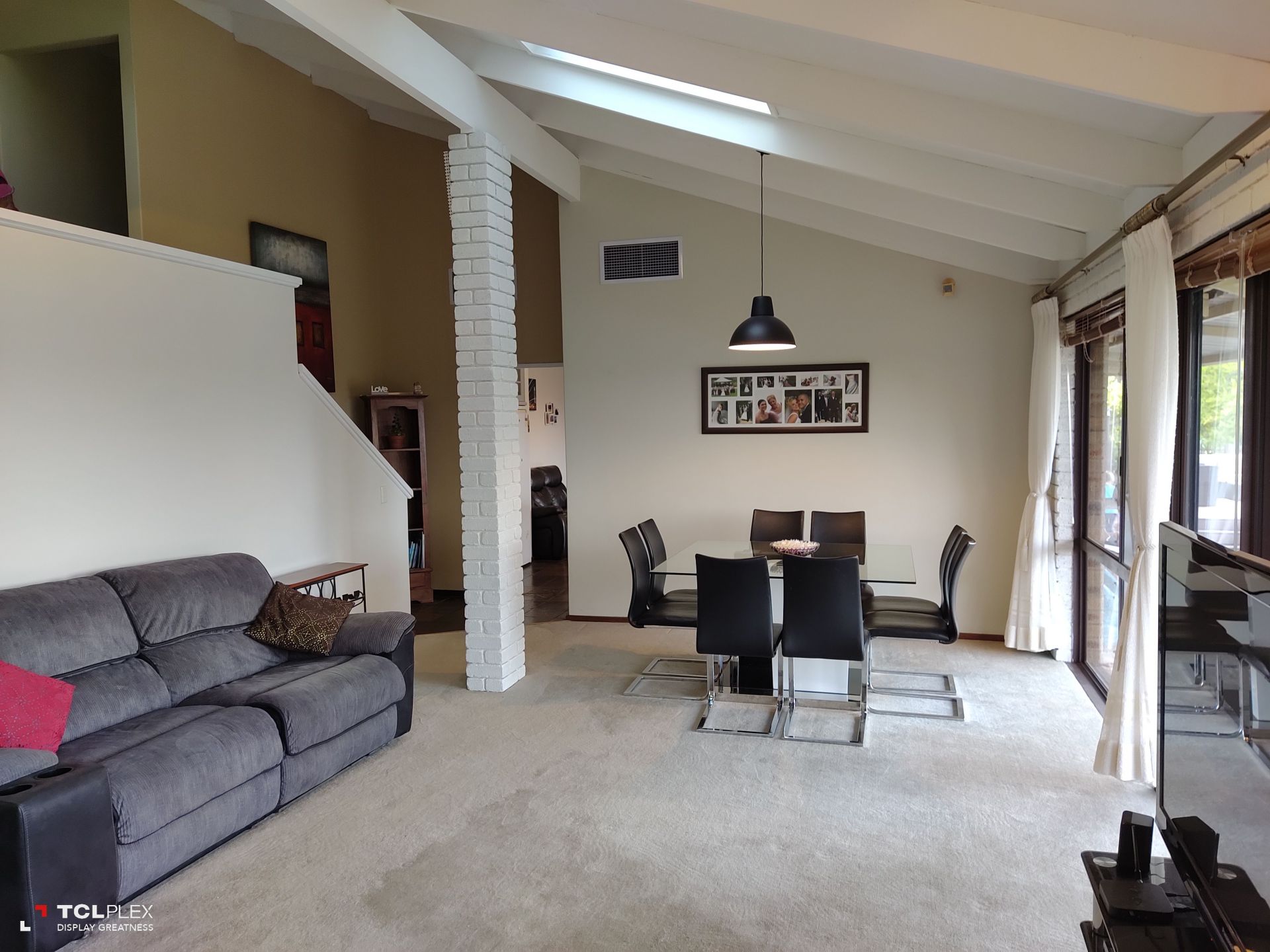 • Large carpeted lounge / dining room with raked ceiling, exposed beams and two skylights